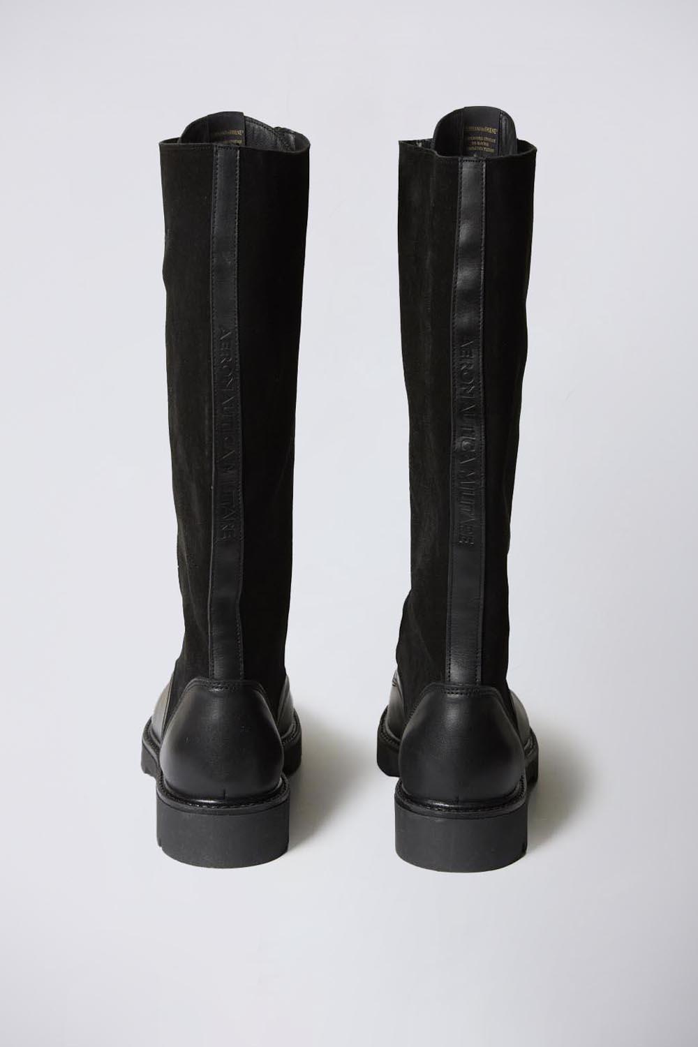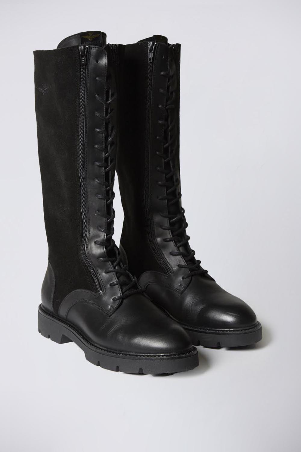 Tato 16ti dírková bota inspirovaná armádou je navržena tak, aby dotvářela odvážný vzhled. Je vyrobena z měkké hladké kůže s elegantními semišovými detaily, má zapínání na dvojitý zip a šněrování. Podrážka s výstupky umožňuje dokonalou izolaci, zatímco úpravy na vnější straně svršku, zadní části a jazyku doplňují stylové detaily.