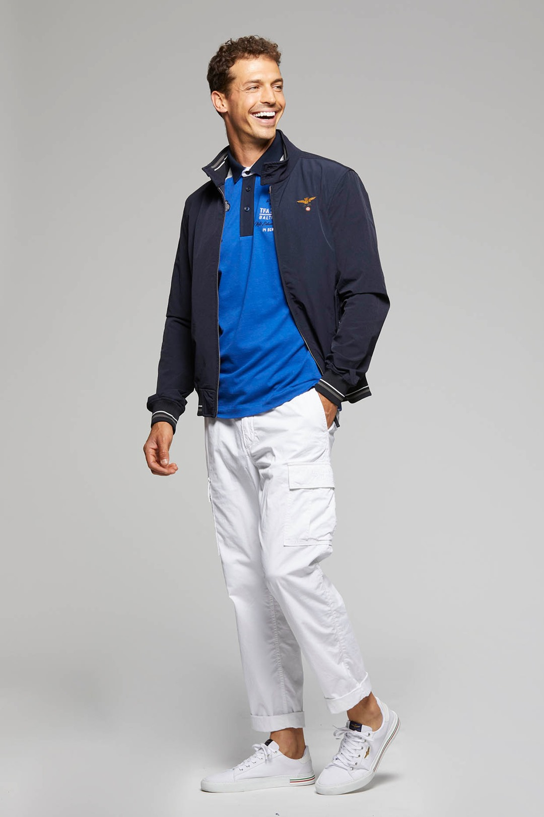 The model is 190 cm tall and wears size 50
