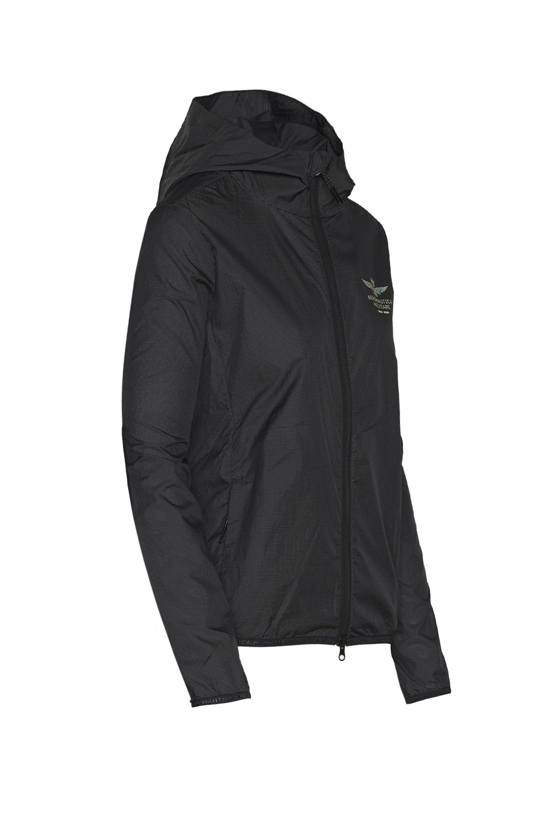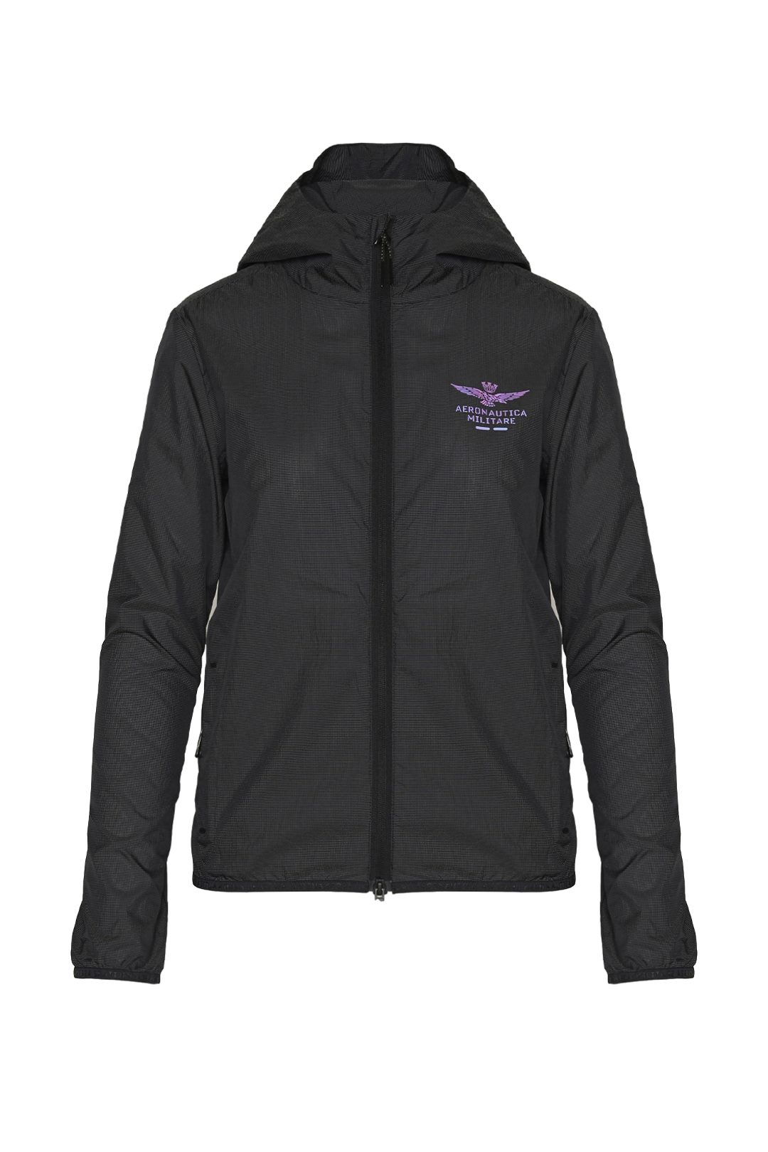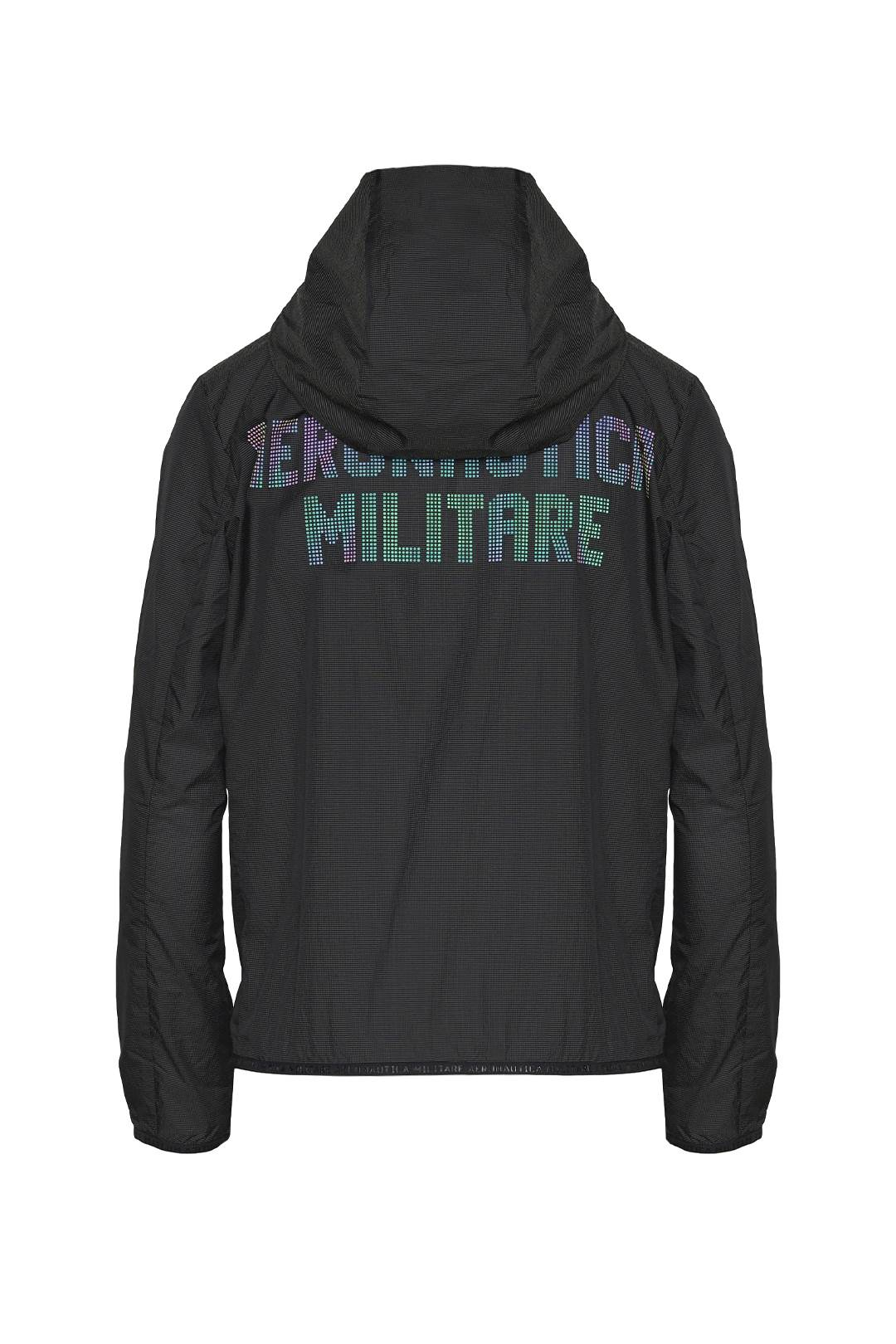 A hooded jacket created with a 3D structure that makes it light and practical. Windproof and rainproof, it stands out for its iridescent transfer prints.
