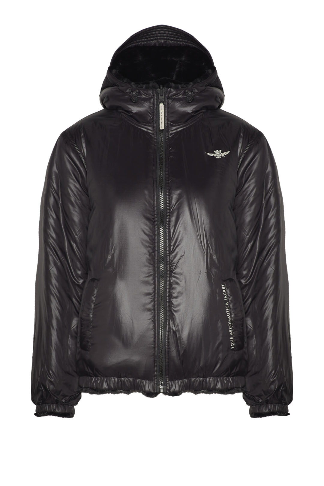 - Nylonová strana s předními kapsami, kontrastní charakteristický potisk orla s věžičkou na hrudi, personalizovaný potisk „Your Aeronautica jacket“ na levé a spodní kapse, elastické dno a manžety