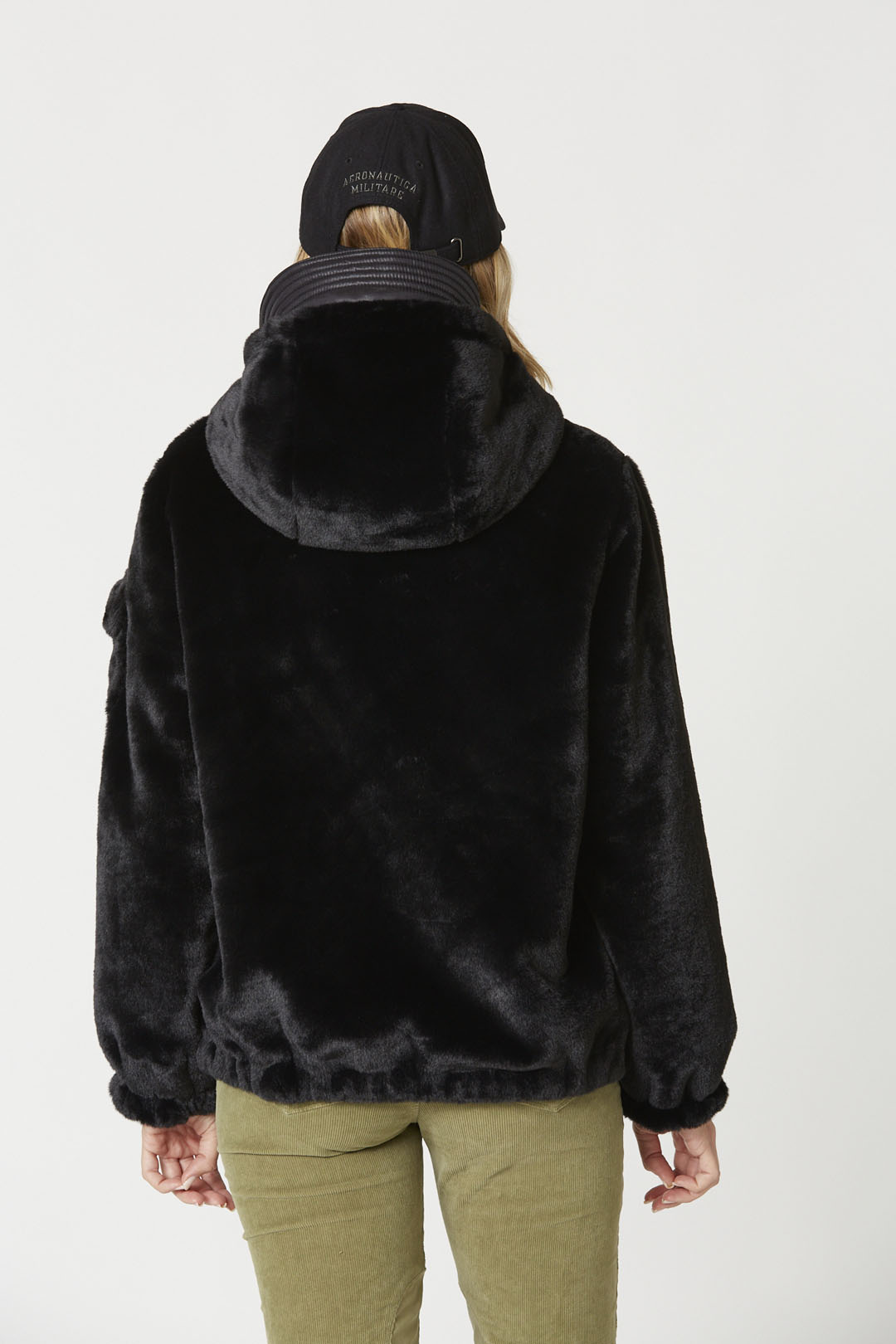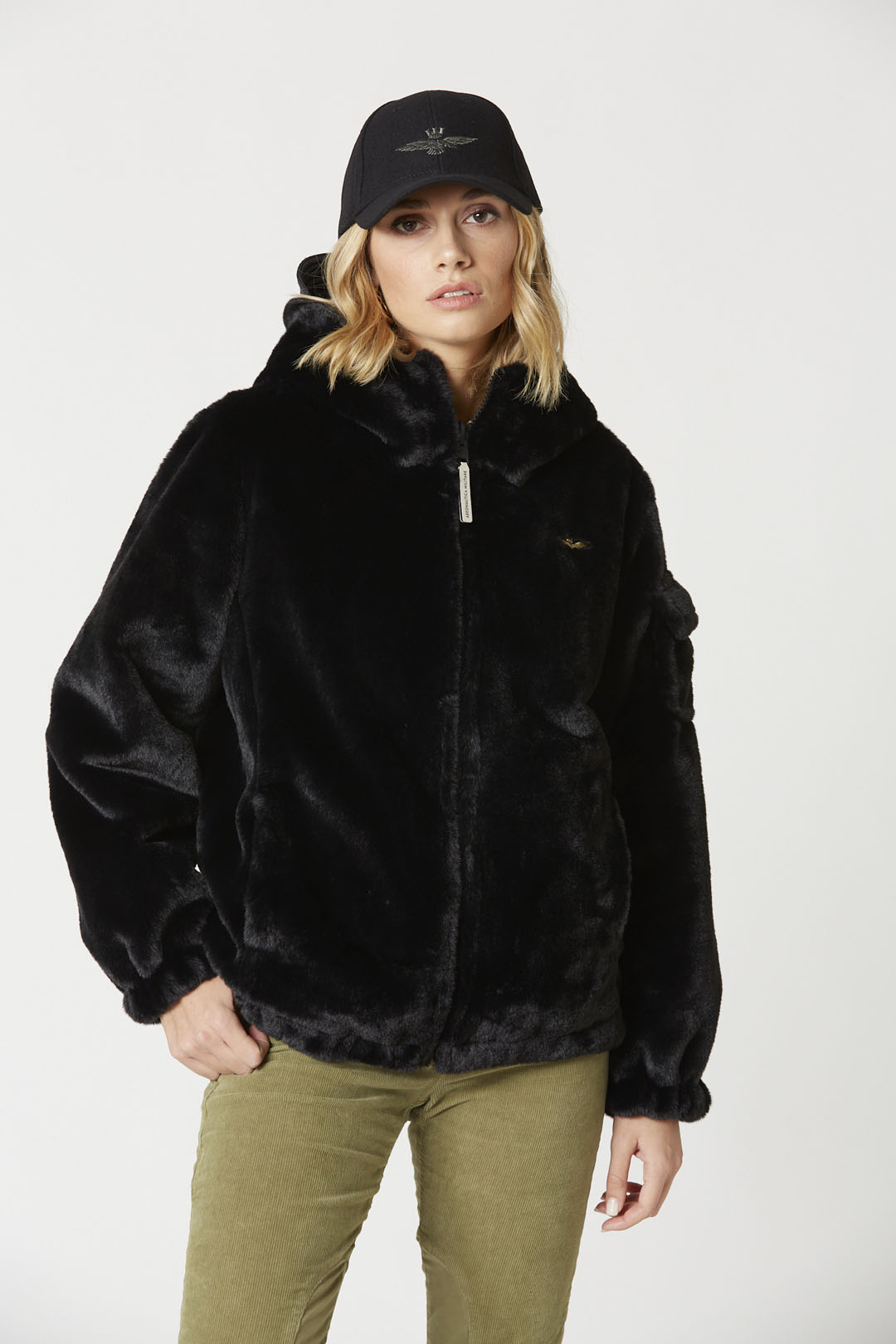- Boční strana z umělé kožešiny s charakteristickým kovovým orlem na hrudi, přední kapsy a pilotní kapsa na levém rukávu