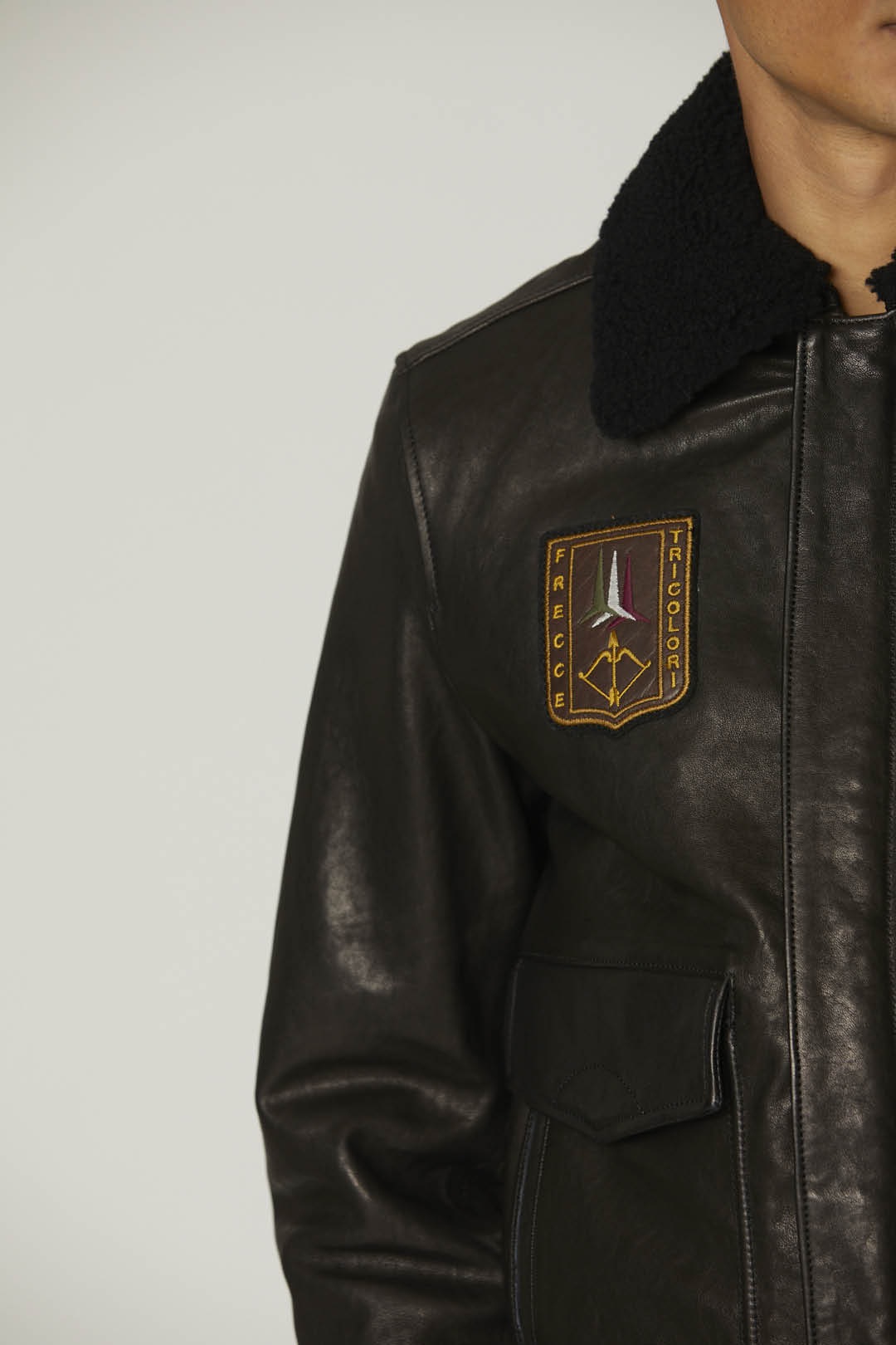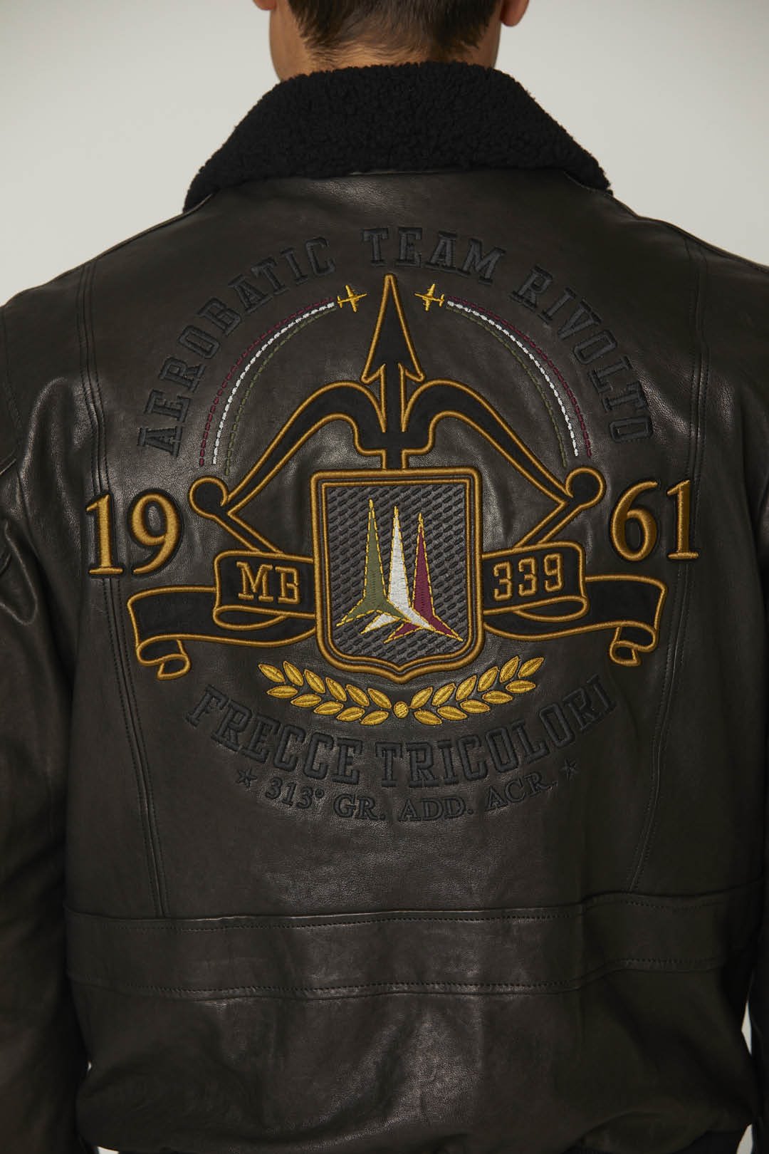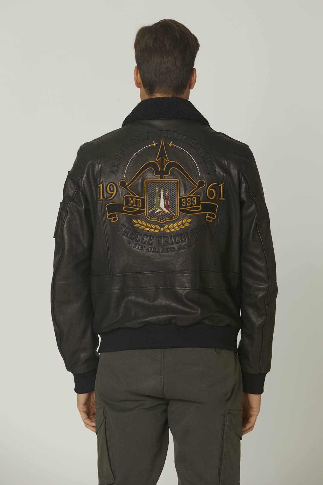 Bezvadně zpracovaná bunda z měkké ovčí kůže, která je ošetřena technikou ručního leštění, aby oděv získal originální lesk. Tento kousek vyniká složitými výšivkami a nášivkami na přední a zadní straně věnovanými slavnému Frecce Tricolori a také hřejivým odnímatelným límcem z ovčí kůže. Bunda je doplněna prostornými předními kapsami, pilotní kapsou na levém rukávu a žebrovanou úpravou.