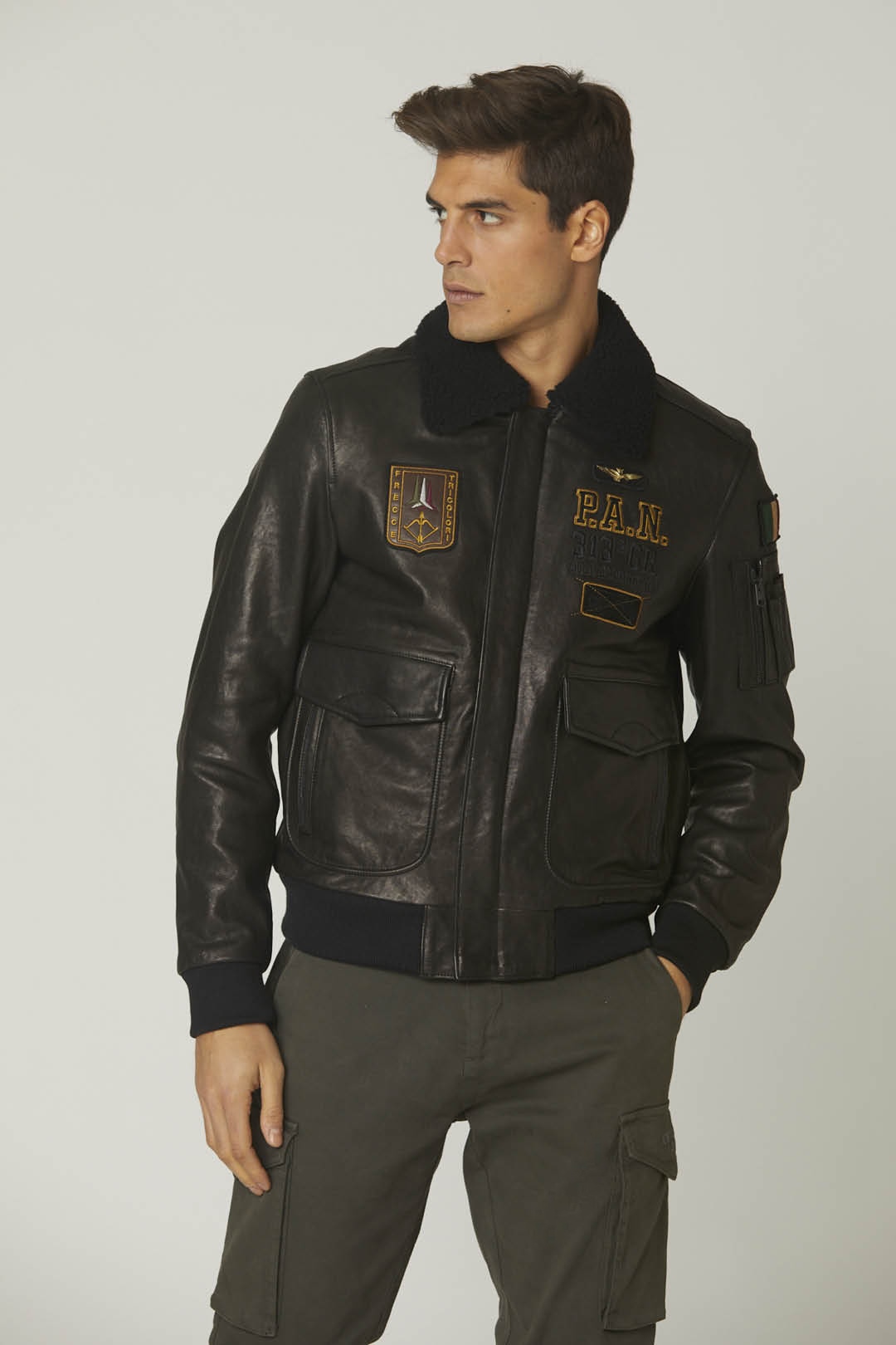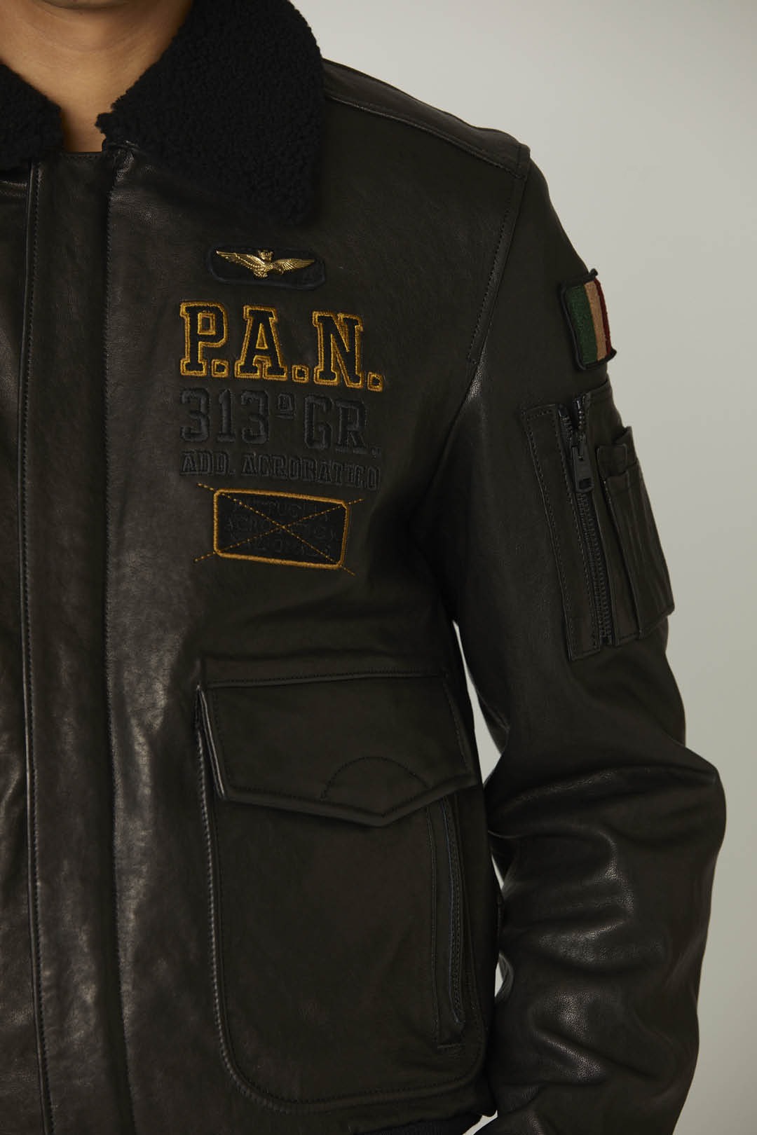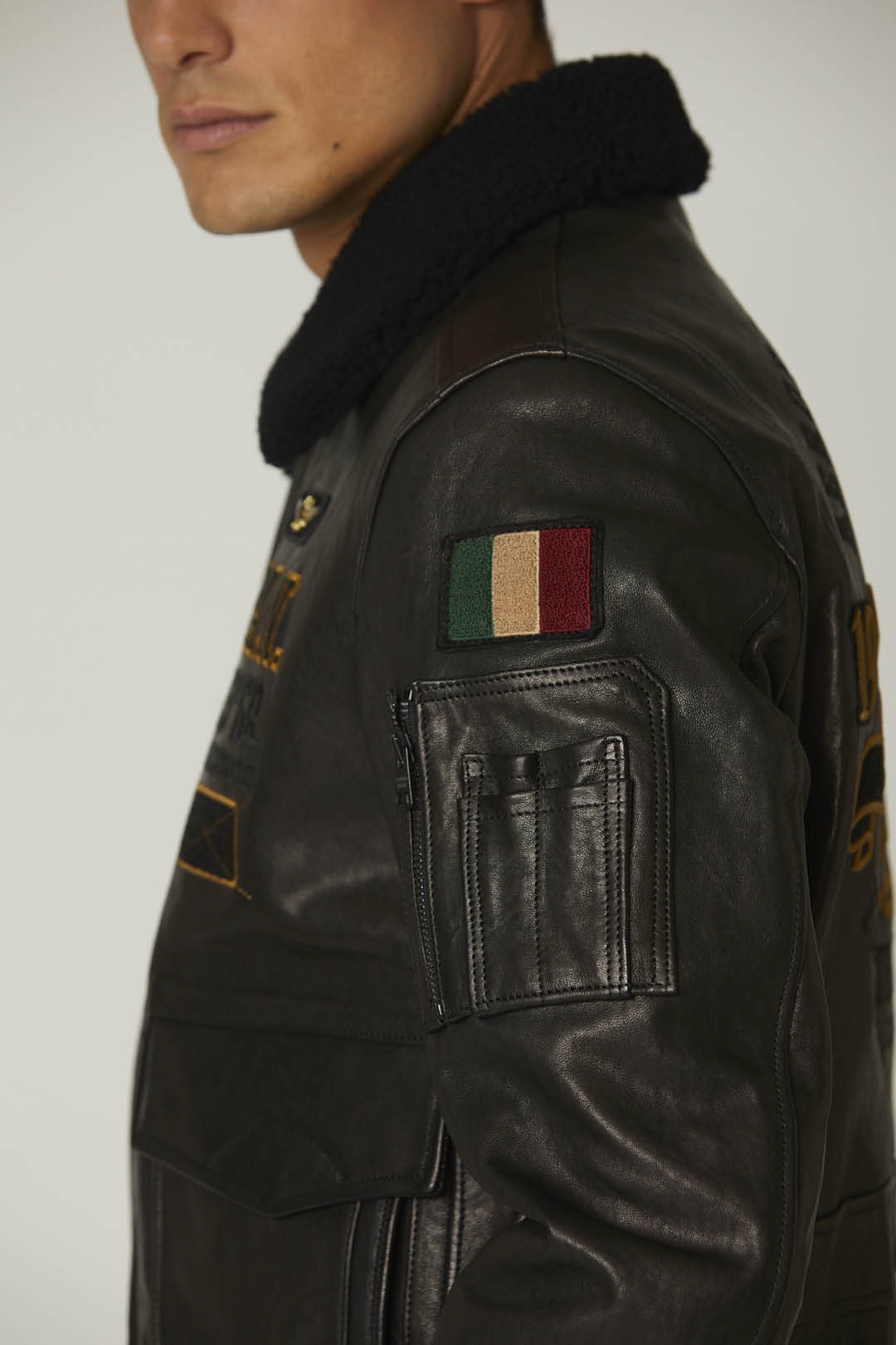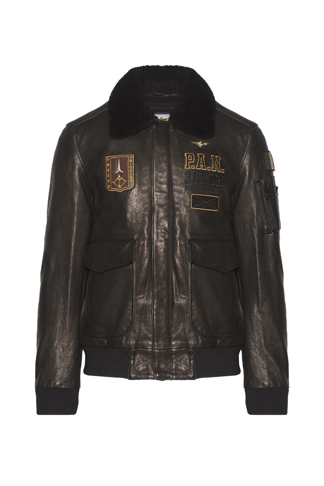 Bezvadně zpracovaná bunda z měkké ovčí kůže, která je ošetřena technikou ručního leštění, aby oděv získal originální lesk. Tento kousek vyniká složitými výšivkami a nášivkami na přední a zadní straně věnovanými slavnému Frecce Tricolori a také hřejivým odnímatelným límcem z ovčí kůže. Bunda je doplněna prostornými předními kapsami, pilotní kapsou na levém rukávu a žebrovanou úpravou.