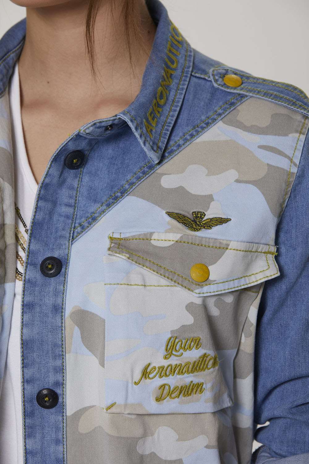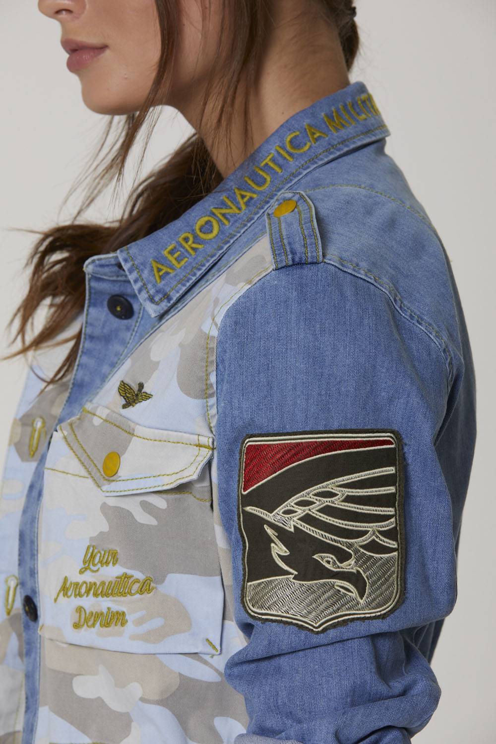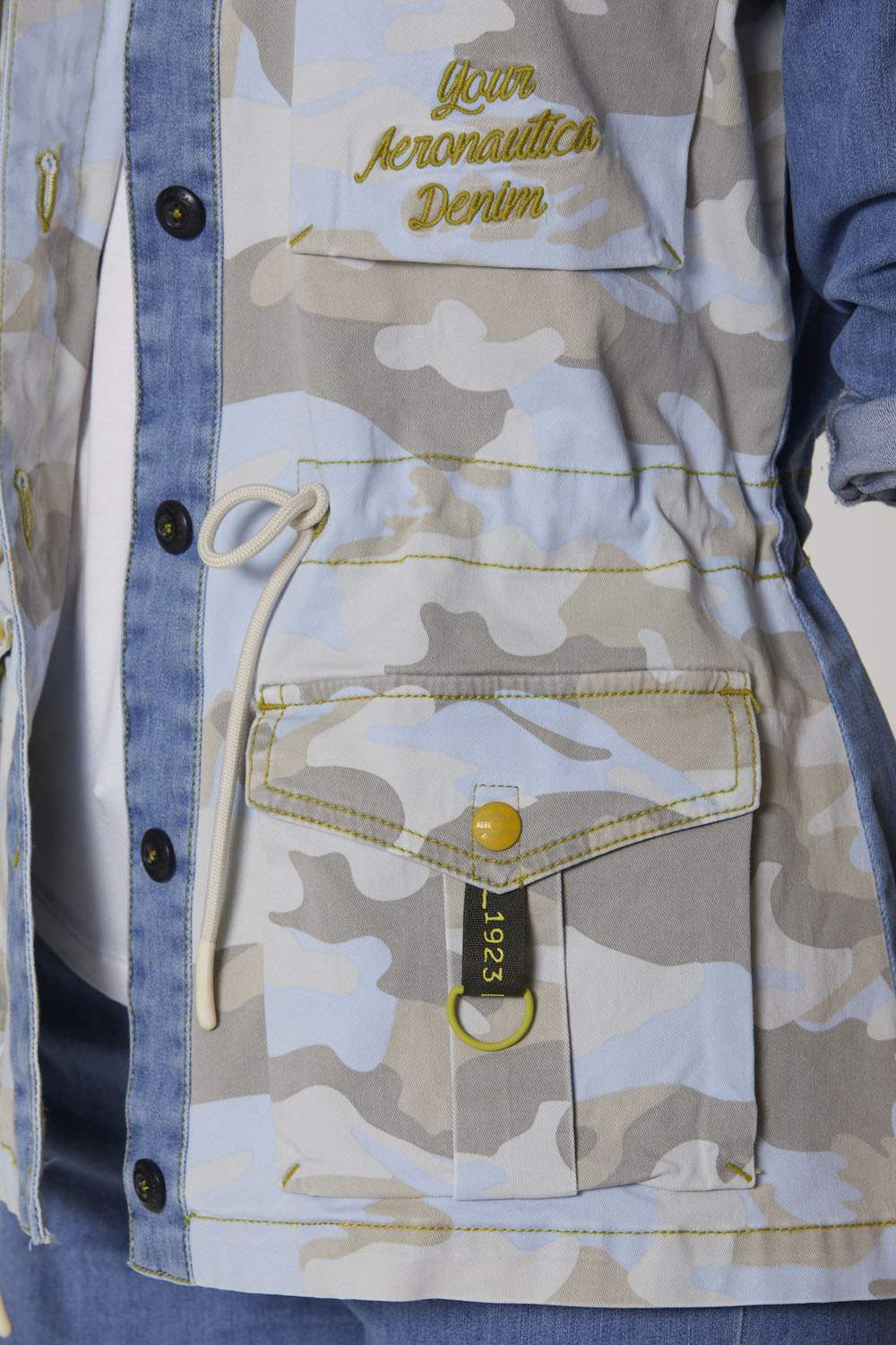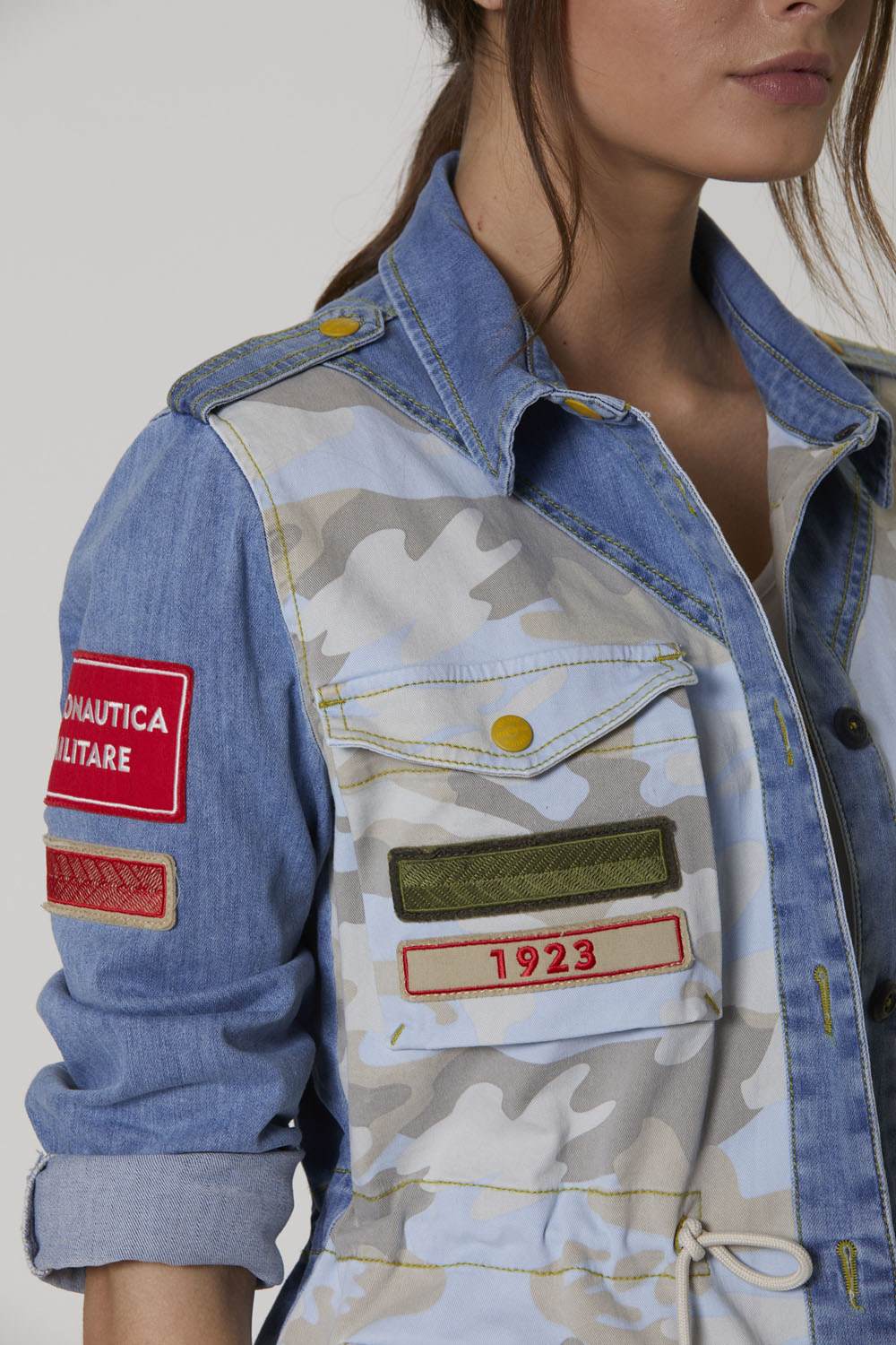 Bunda z pohodlného bělícího denimu a maskáčového bavlněného gabardénu, obohacená o sadu detailů připomínajících svět letectví. Ideální svrchní oblečení pro trendy vojenský styl, kterým se můžete pochlubit v chladných jarních dnech.