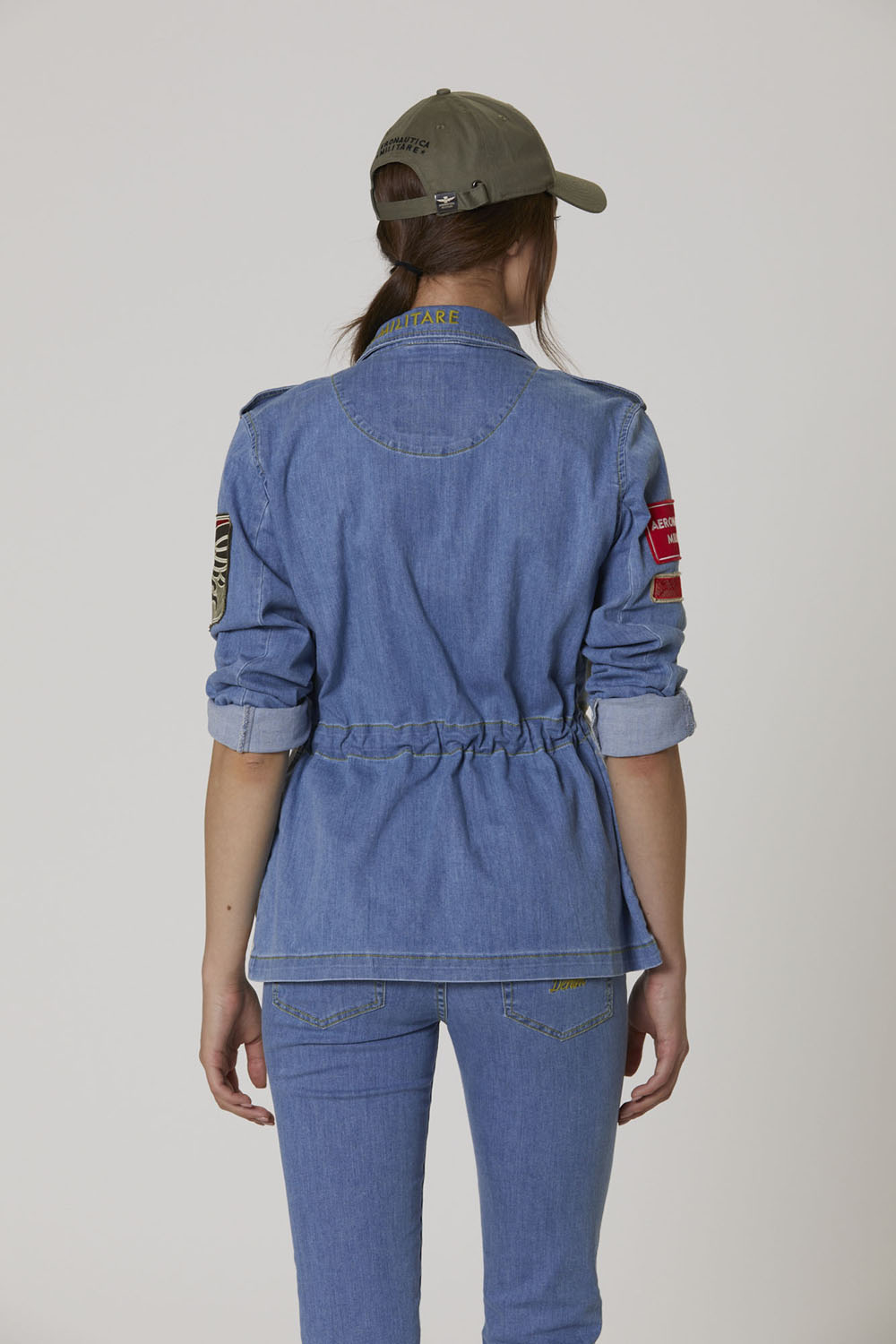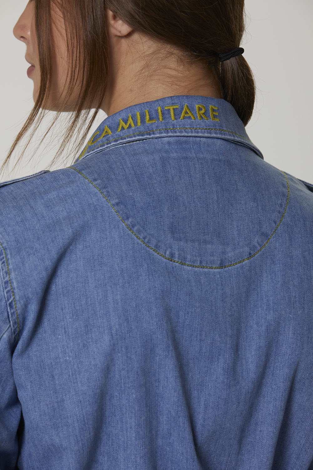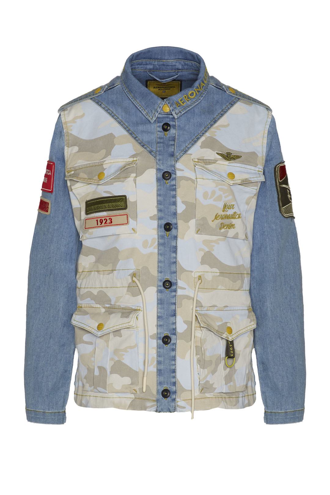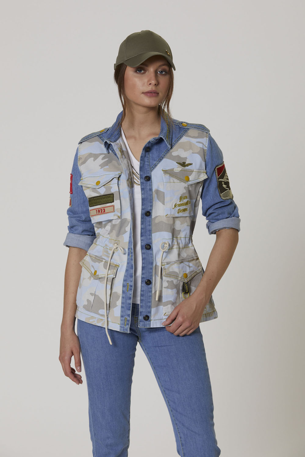 Bunda z pohodlného bělícího denimu a maskáčového bavlněného gabardénu, obohacená o sadu detailů připomínajících svět letectví. Ideální svrchní oblečení pro trendy vojenský styl, kterým se můžete pochlubit v chladných jarních dnech.