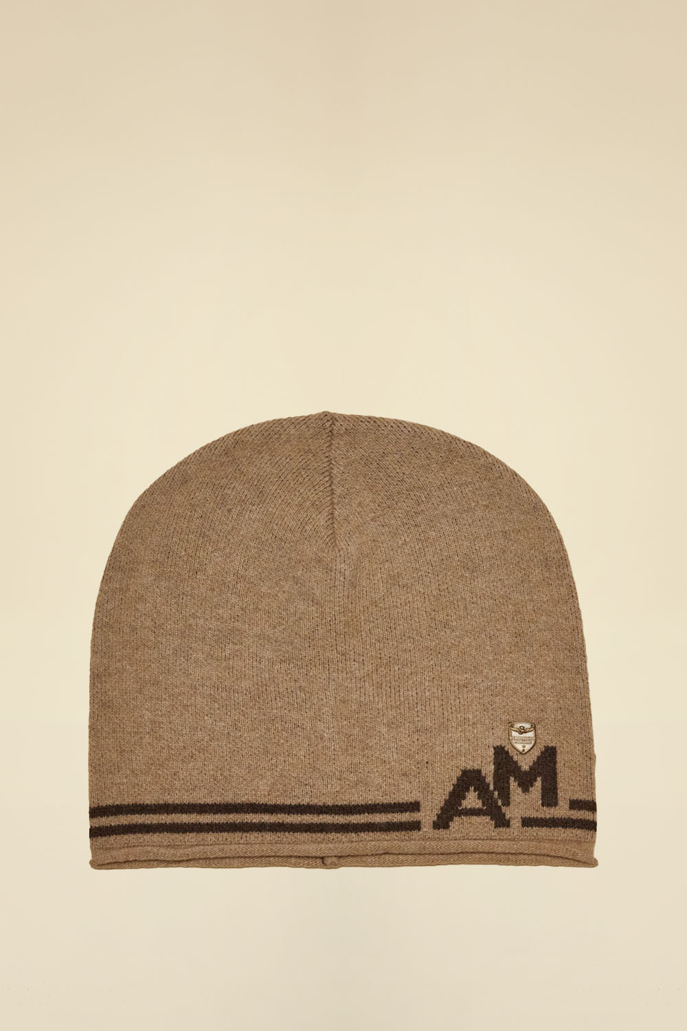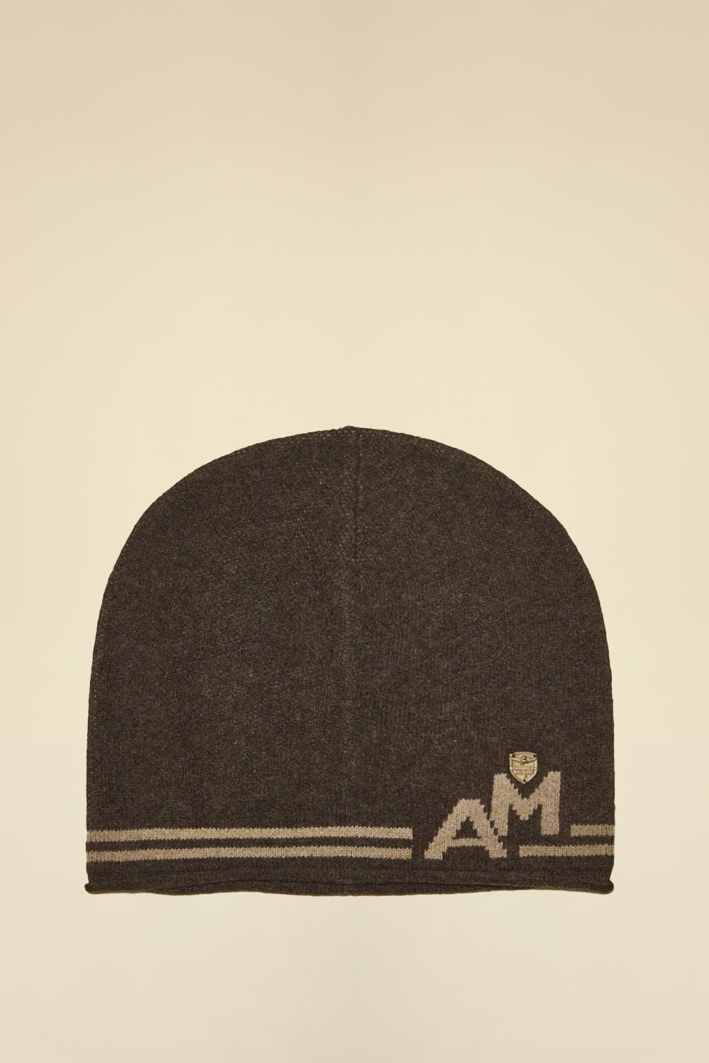 Tato dámská čepice je vyrobena z jemné směsi viskózy, vlny a kašmíru a je k dispozici v elegantních odstínech zelené, velbloudí béžové a čokoládově hnědé. Vyznačuje se absencí manžet, žakárovou výšivkou po obvodu s logem „AM“ a kovovým odznakem na levé straně.