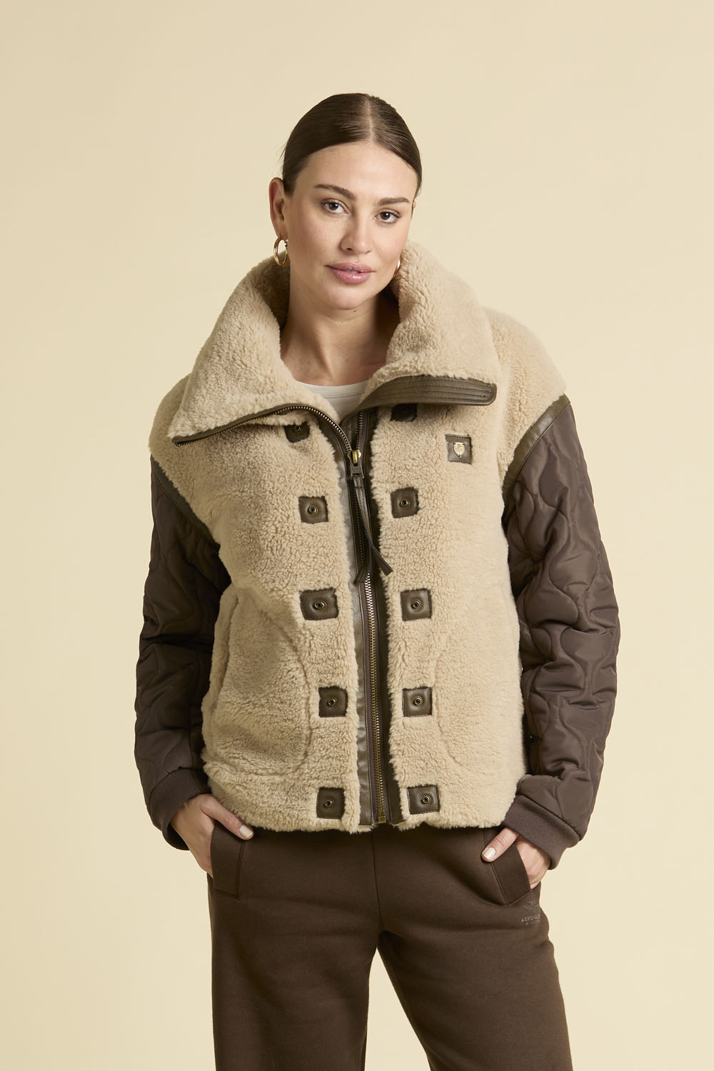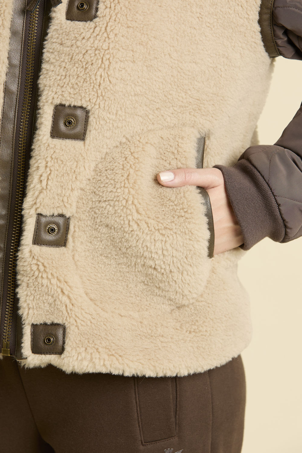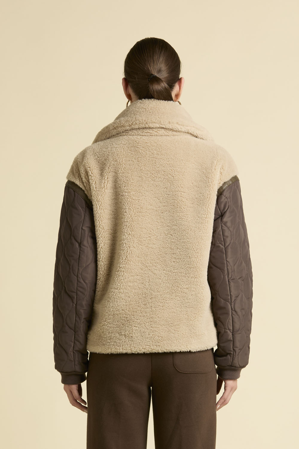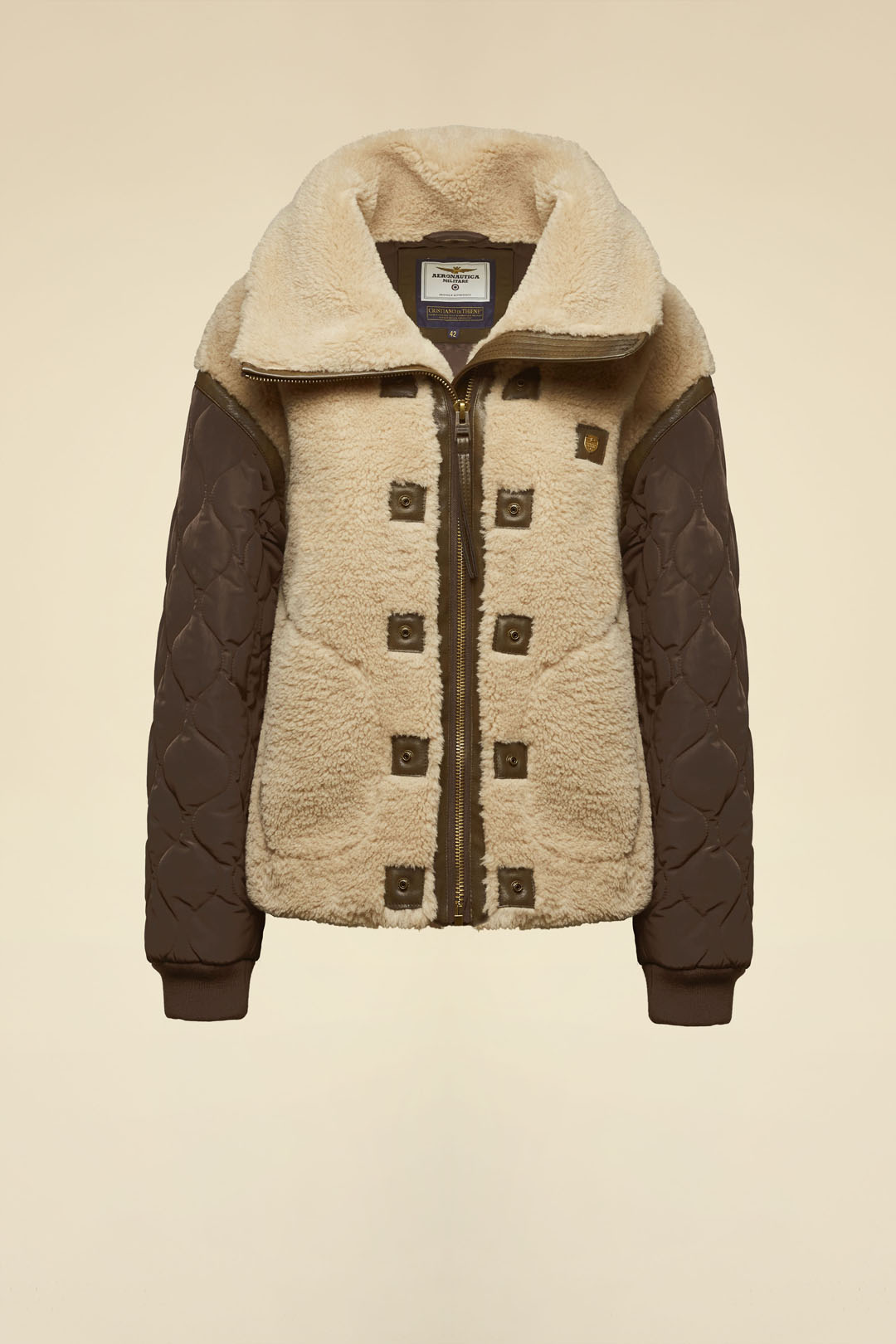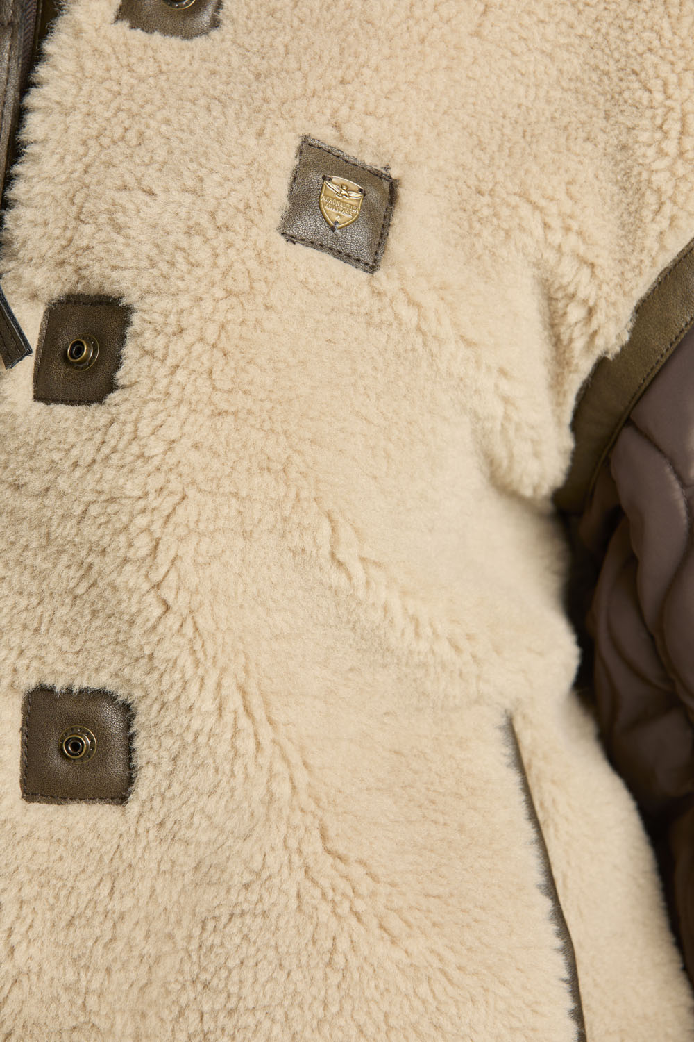 Tento dámský kabát představuje perfektní kombinaci městského komfortu a moderního designu. S tělem z plyšové umělé kožešiny s efektem medvídka a rukávy z vycpaného nylonu s geometrickým prošíváním vytváří výrazný a odvážný vzhled. Kožené detaily a centrální zapínání na zip s ozdobnými panely z umělé kůže dodávají kabátu sofistikovanost a luxusní dojem. Tento kousek je ideální pro každodenní nošení a dokonale se hodí pro zimní městský styl.