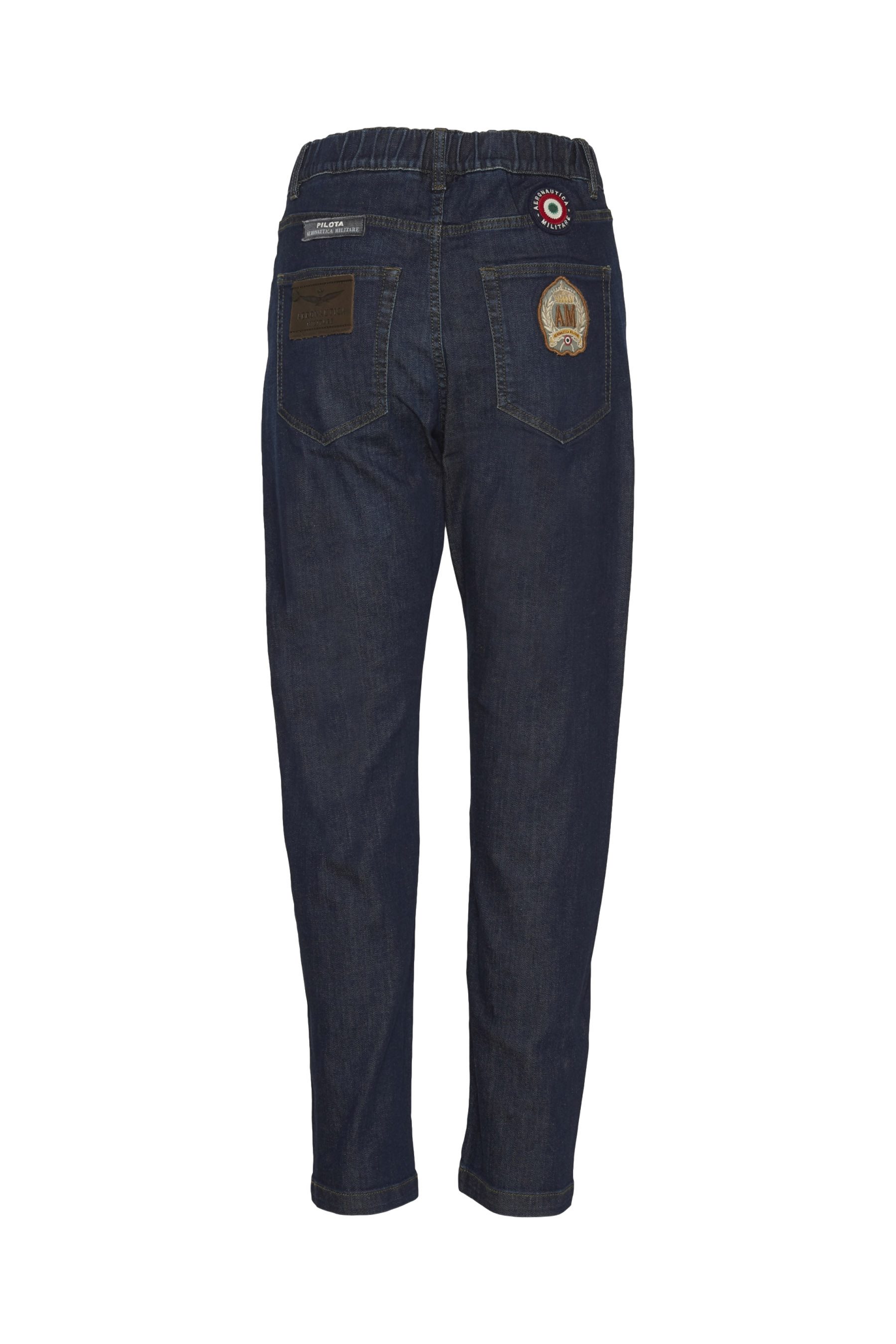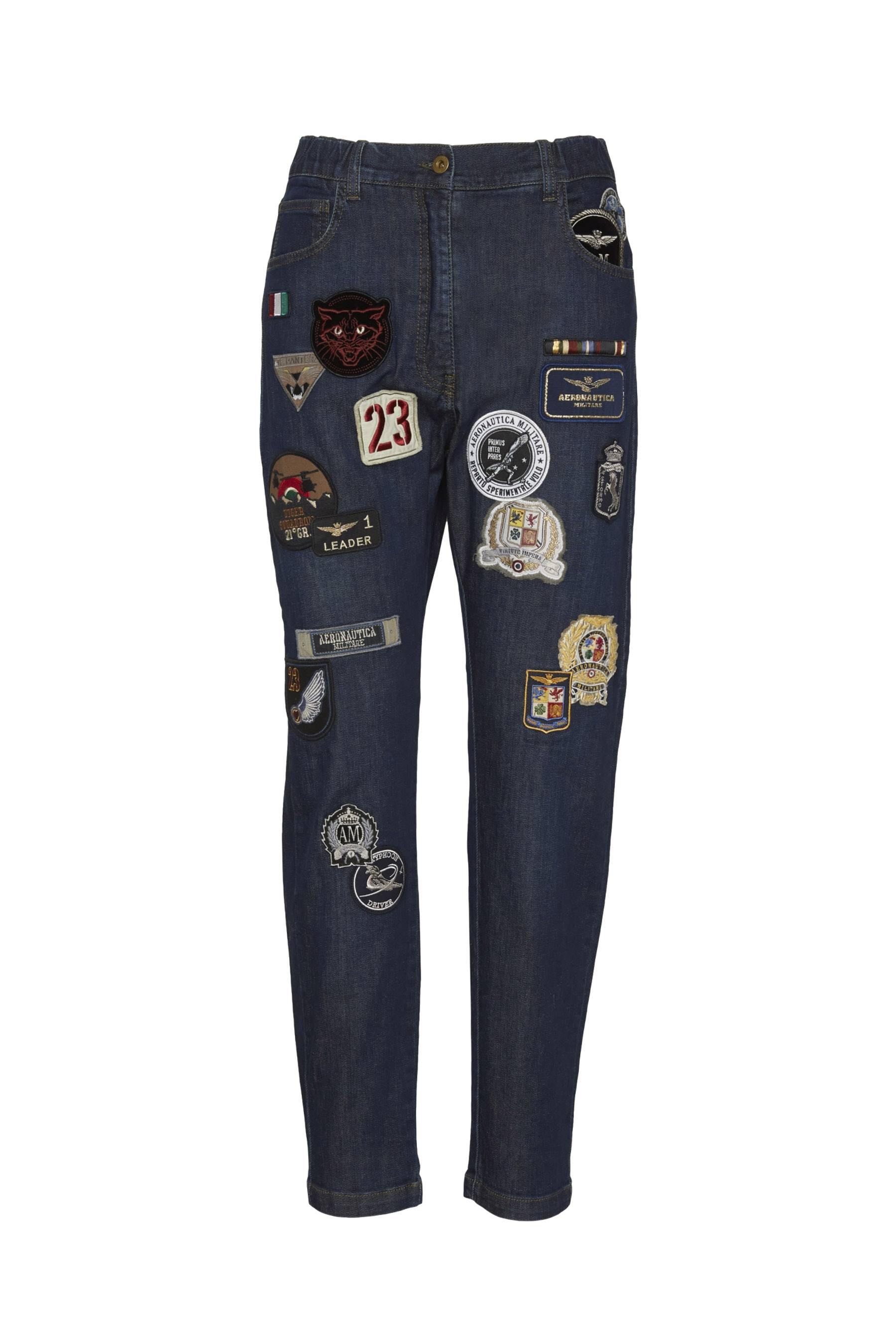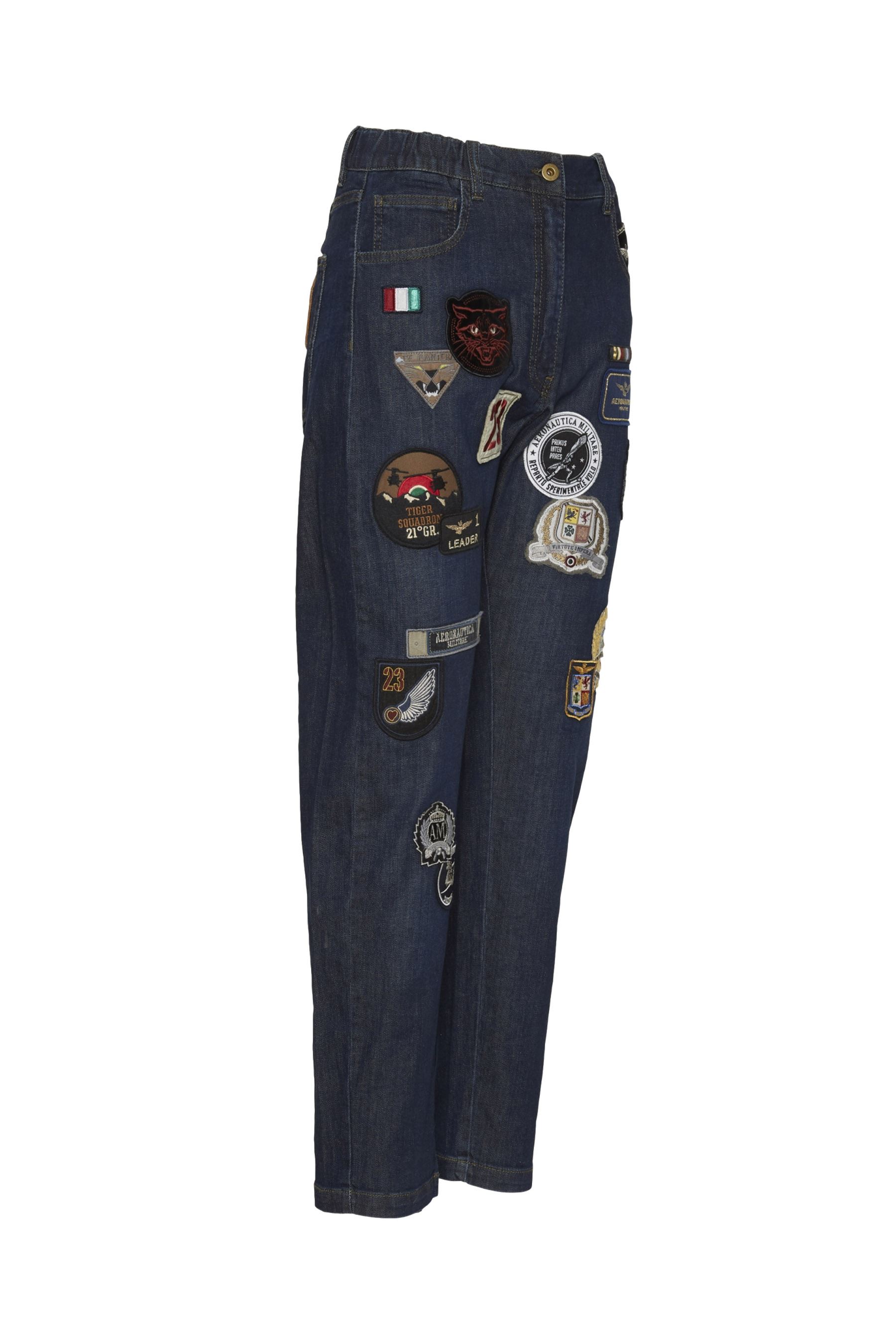 An original interpretation of the 5-pocket trousers: this item is made of soft jeans with a vintage effect and is made unique by the patches applied on the whole garment.
