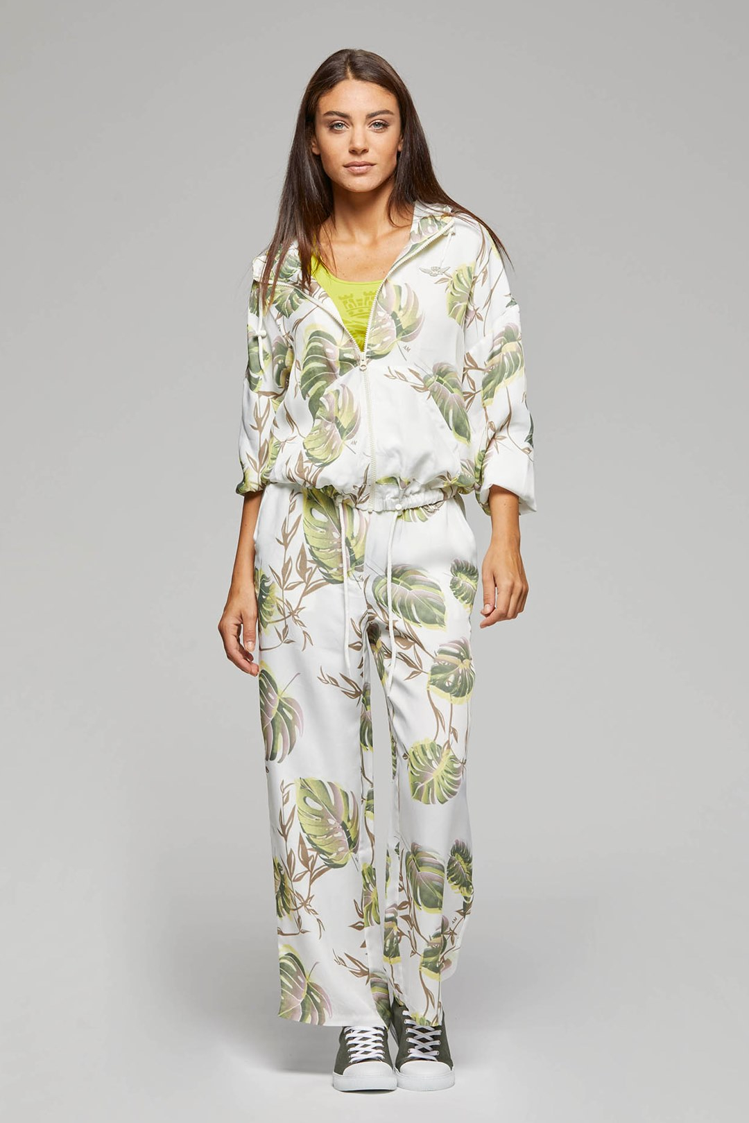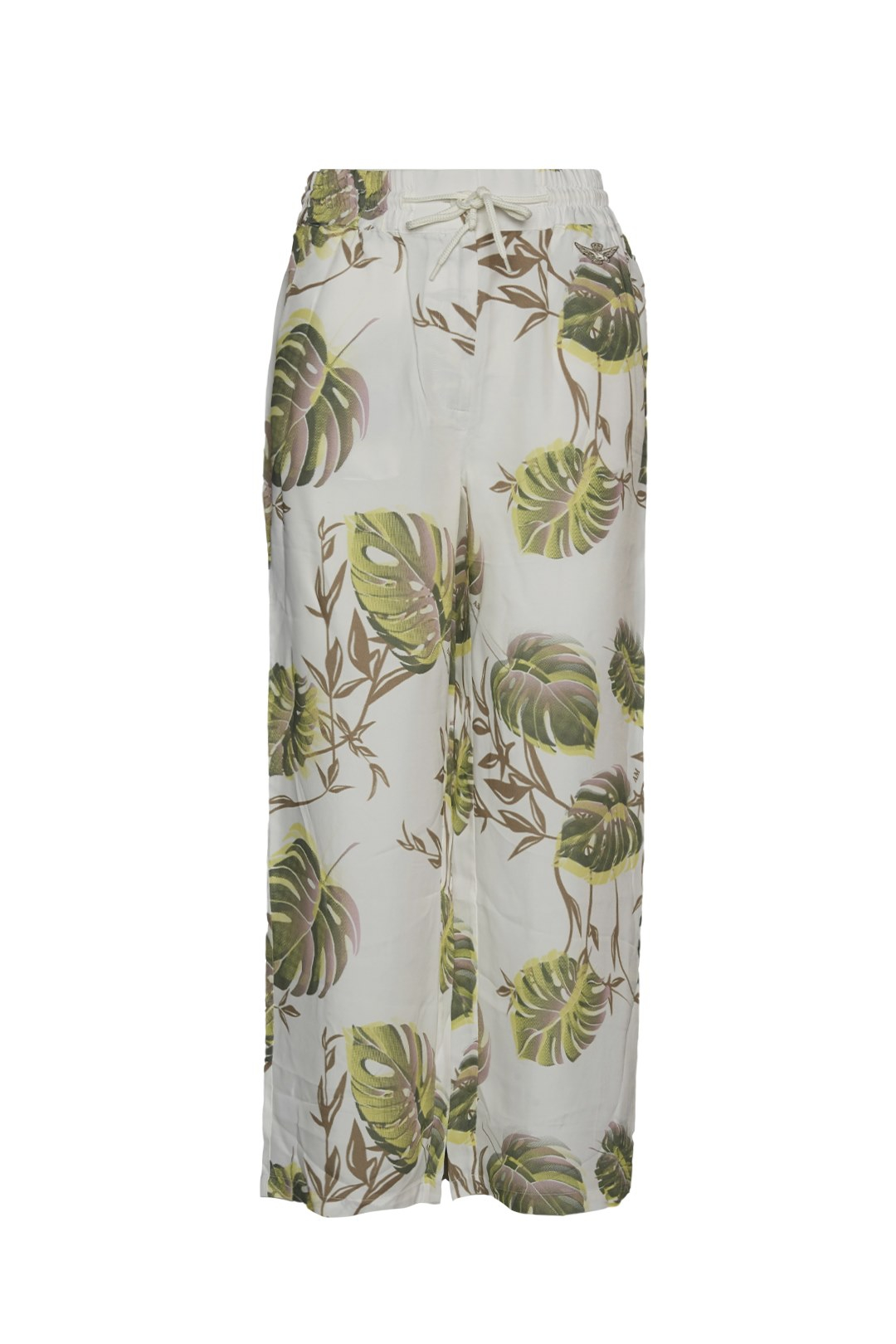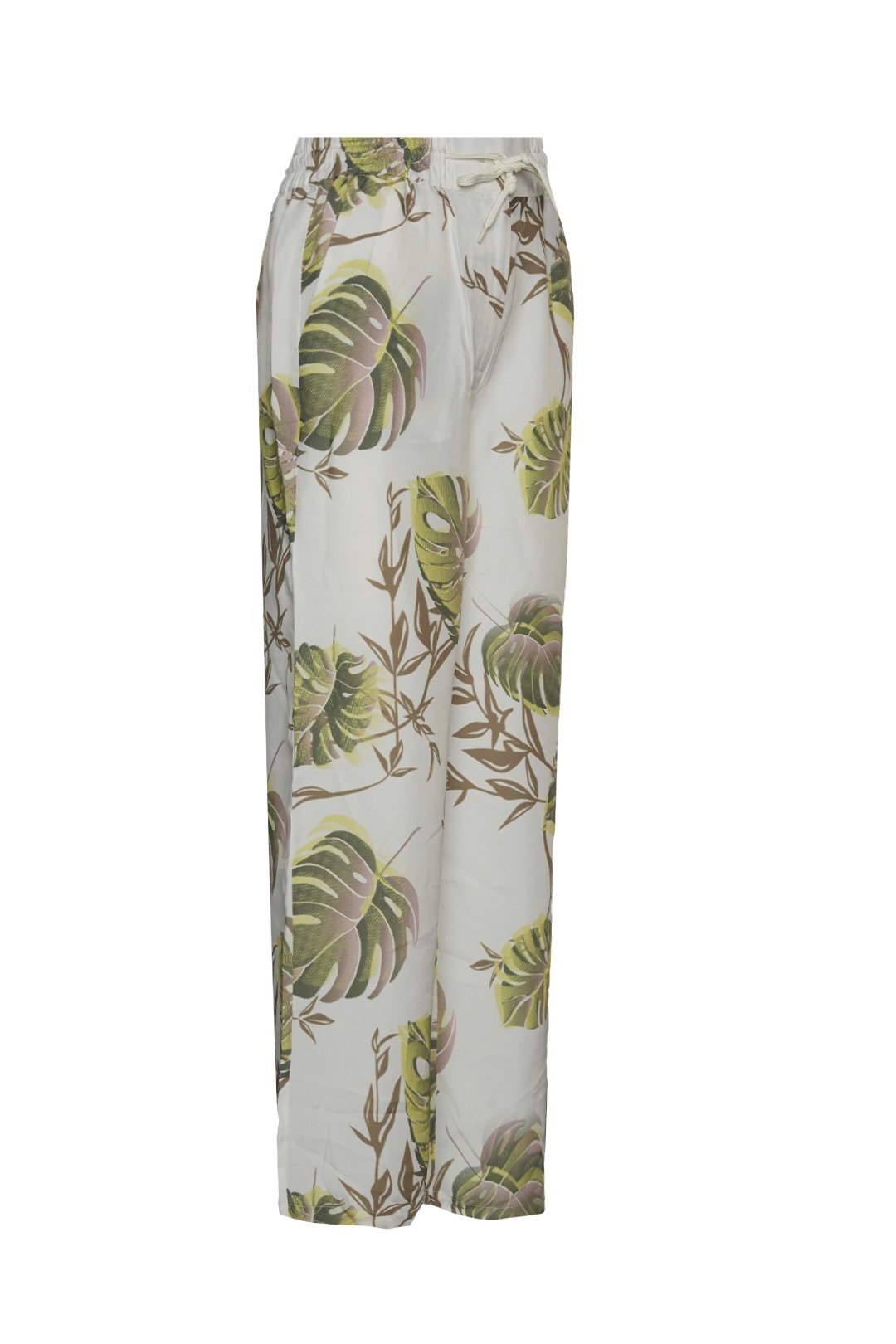 Comfortable and light trousers that stand out for a cheerful and imaginative tropical leaf motif.