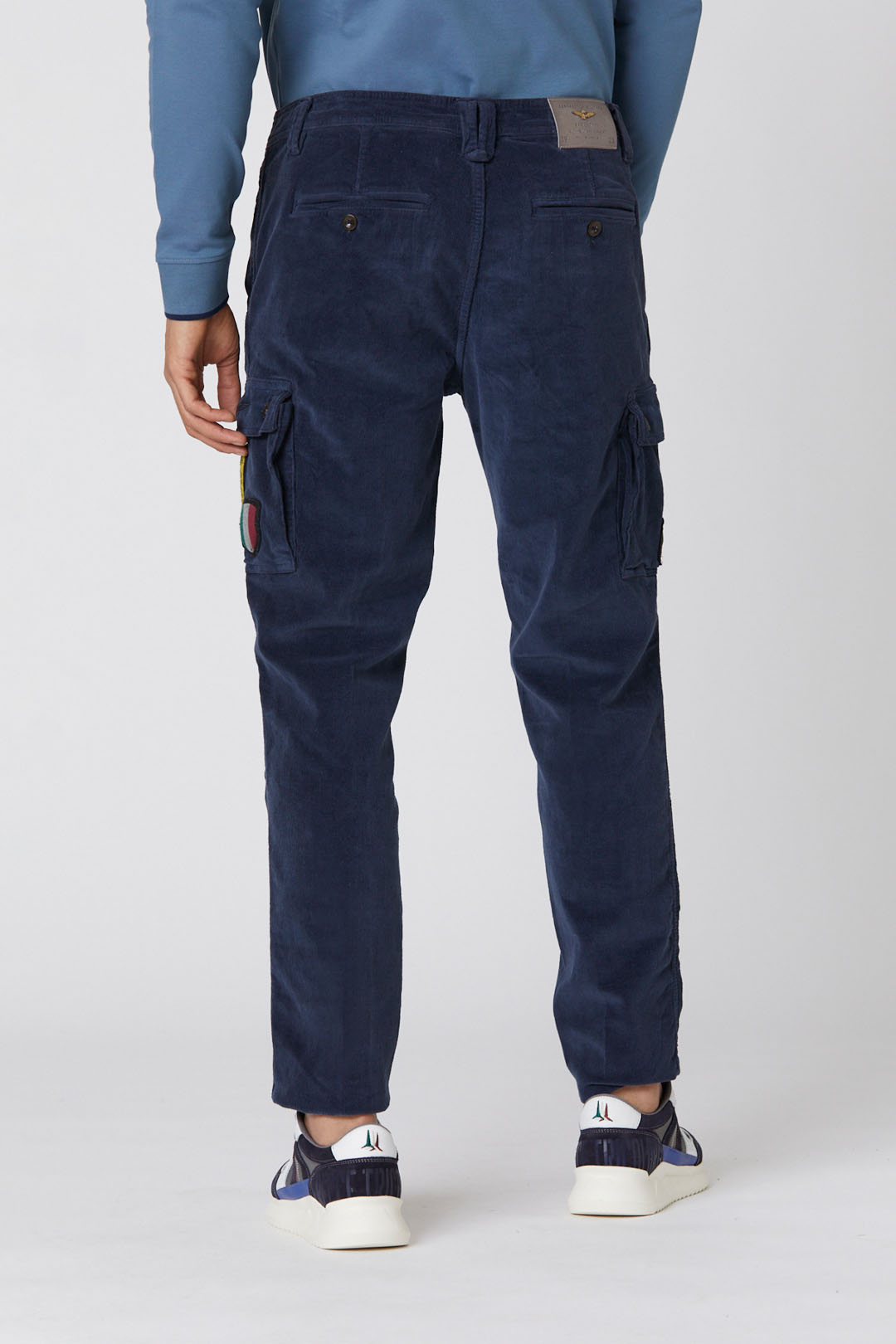 Klasický design s rovnými nohavicemi obohacený o boční kapsy zdobené exkluzivními nášivkami věnovanými akrobatickému týmu italského letectva Frecce Tricolori. Tyto kalhoty, které zajišťují maximální volnost pohybu a příjemnou měkkost, jsou vyrobeny ze strečového bavlněného manšestru.
