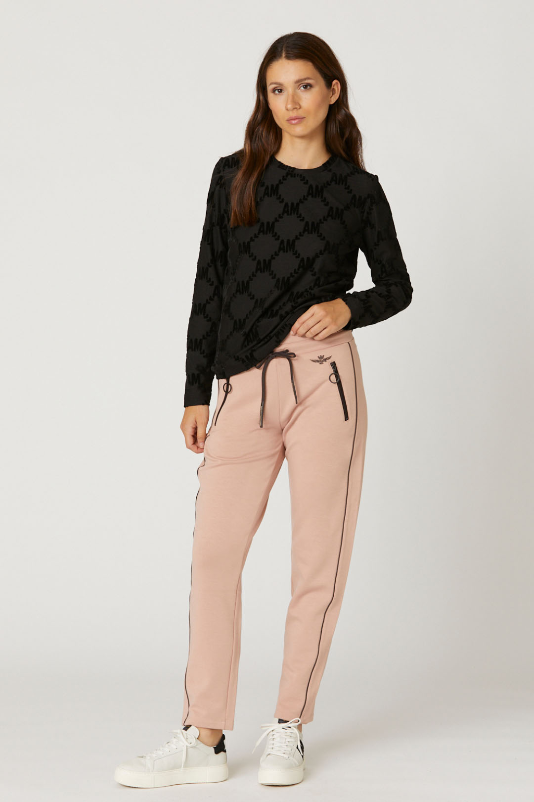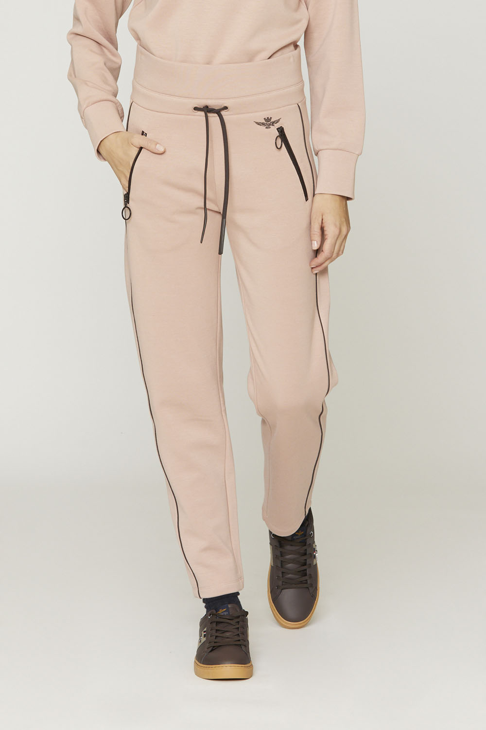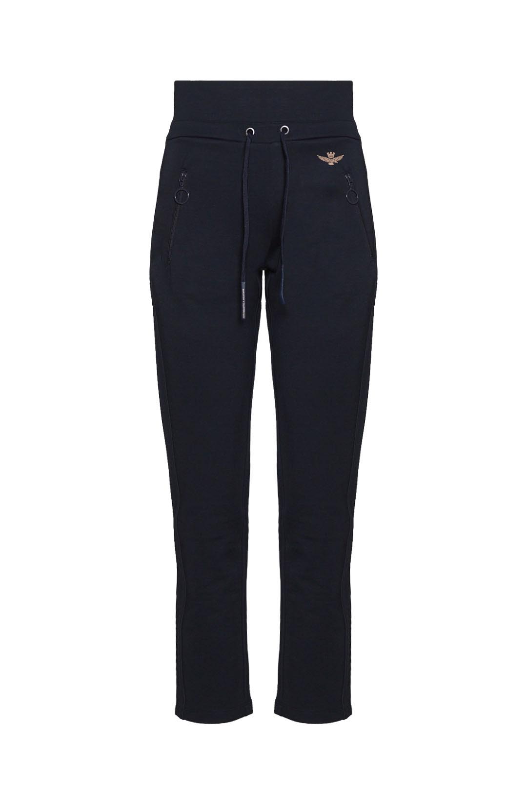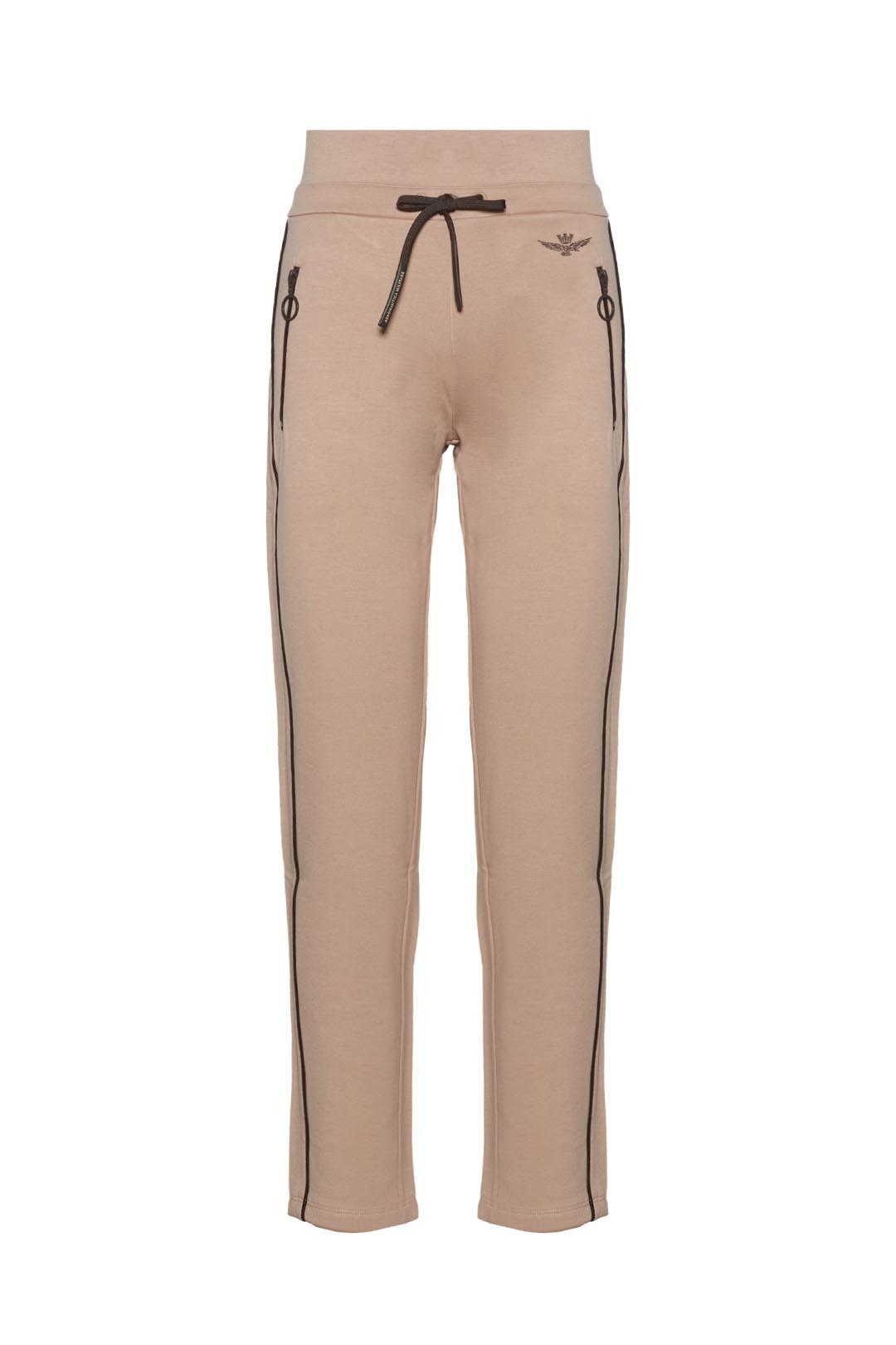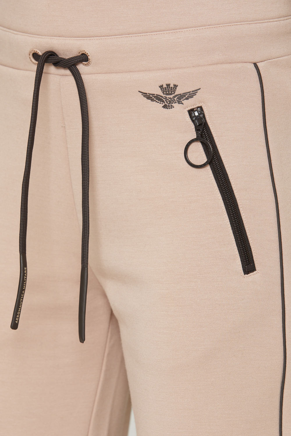 Tyto tepláky ze strečové viskózové tkaniny jsou ideální pro celodenní pohodlí a volnost pohybu. Mezi výrazné, ale nezbytné úpravy patří podpis korunovaného orla v gumě, elastický pas se šňůrkami a kontrastní lemování na bocích.