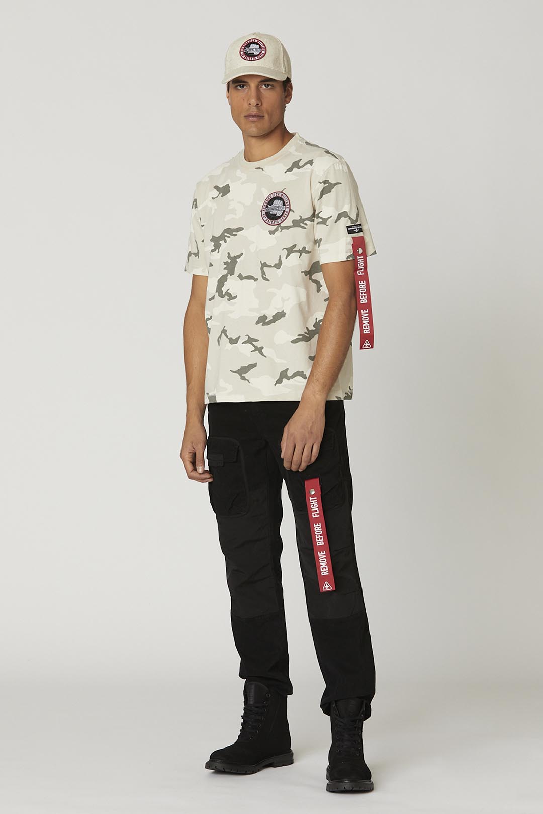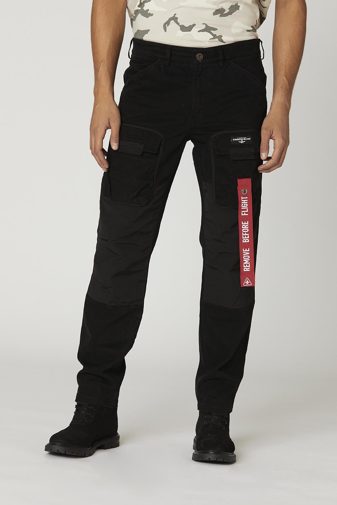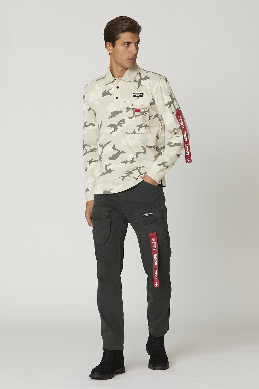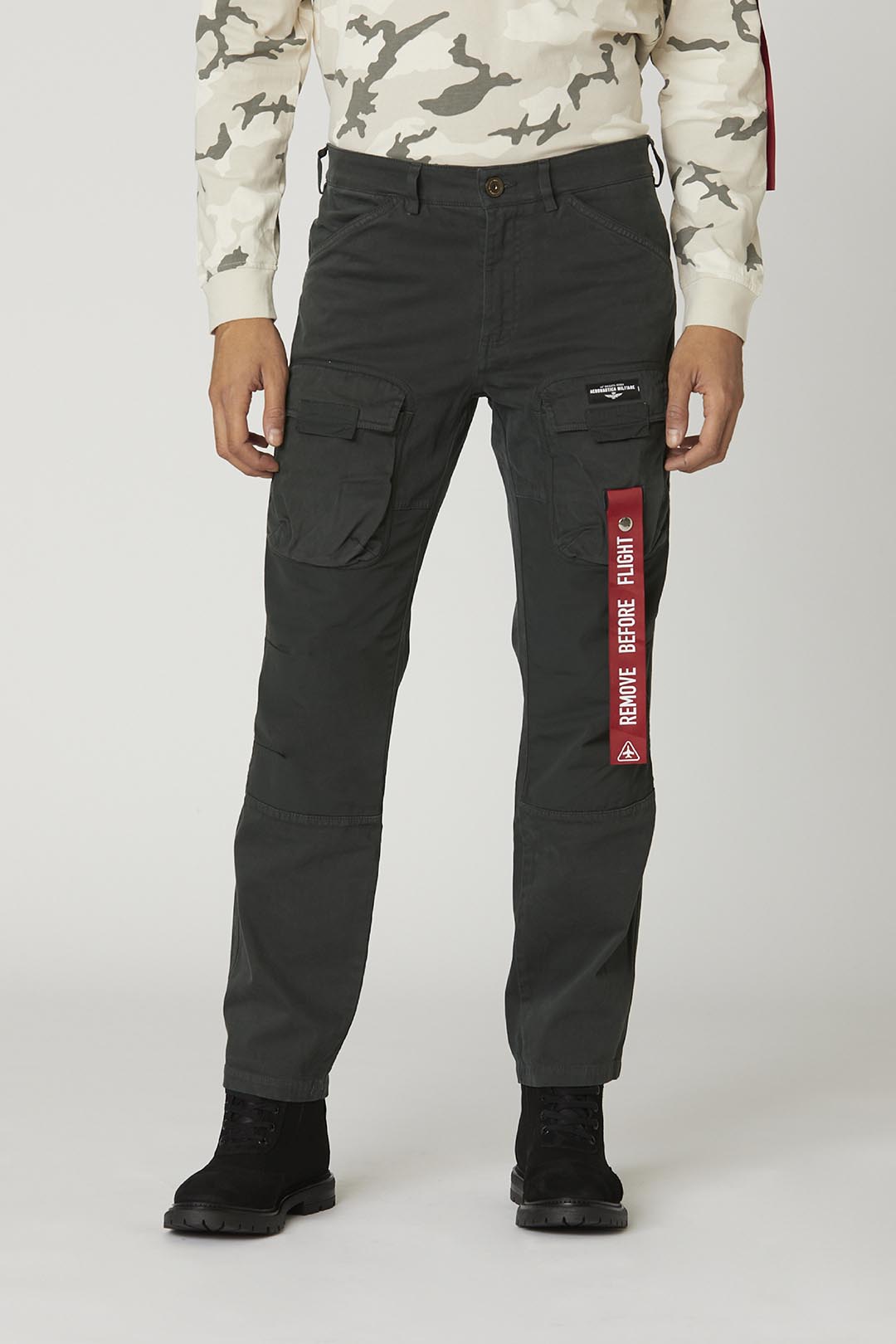 Tyto bavlněné gabardénové kalhoty vynikají bohatstvím detailů a úprav, jako jsou polyesterové výztuhy na kolenou, přední cargo kapsy, které přidávají další prostor, boční stuha a štítek na zadní straně, které jsou inspirovány světem armády. Zúžený střih tohoto vysoce výkonného kousku ze speciální edice věnované expedici 46. letecké brigády do Antarktidy.