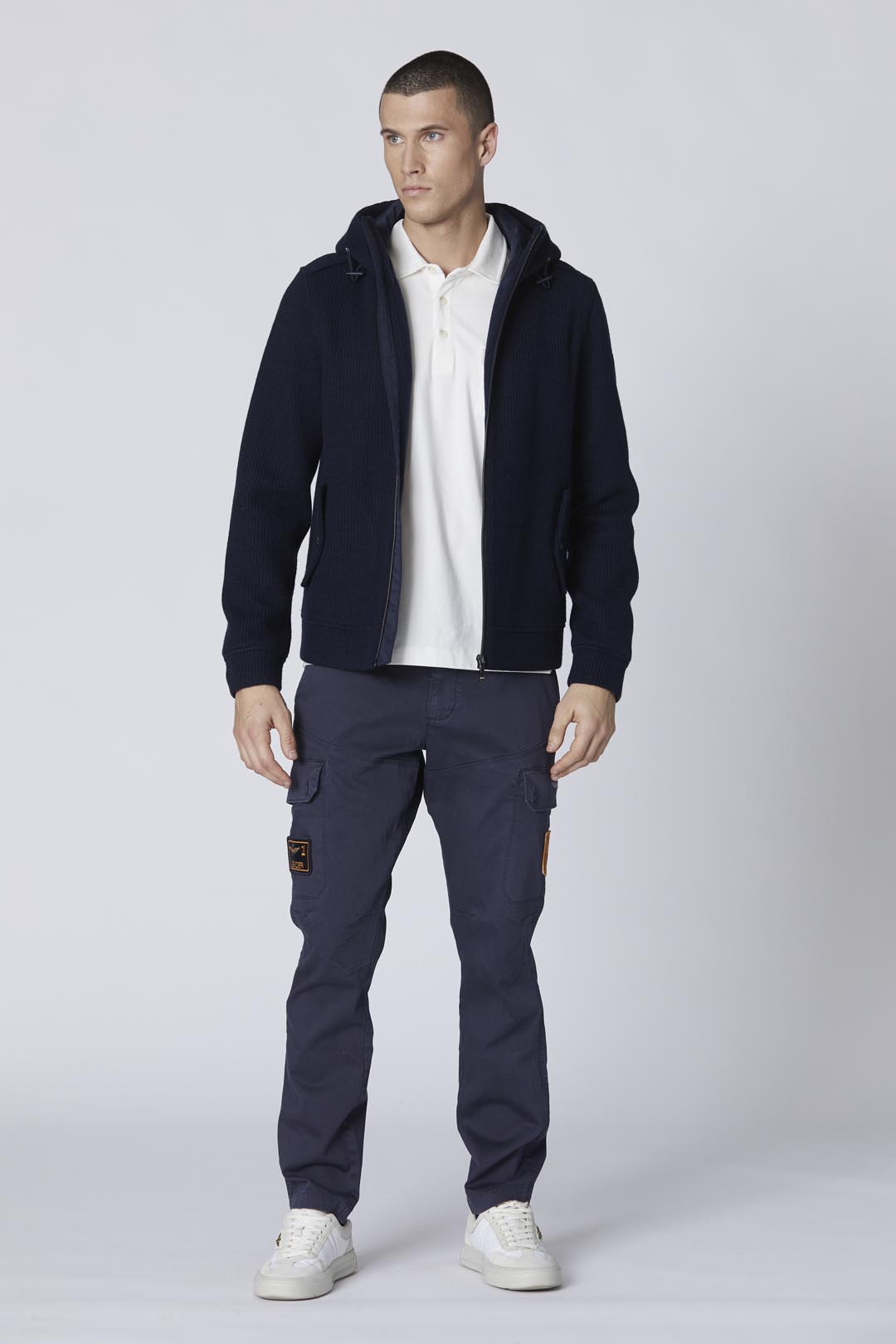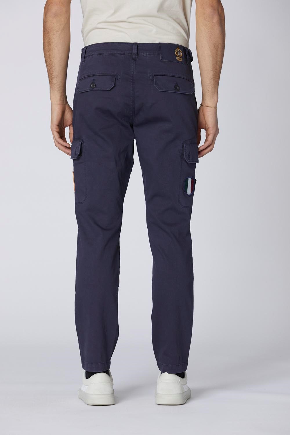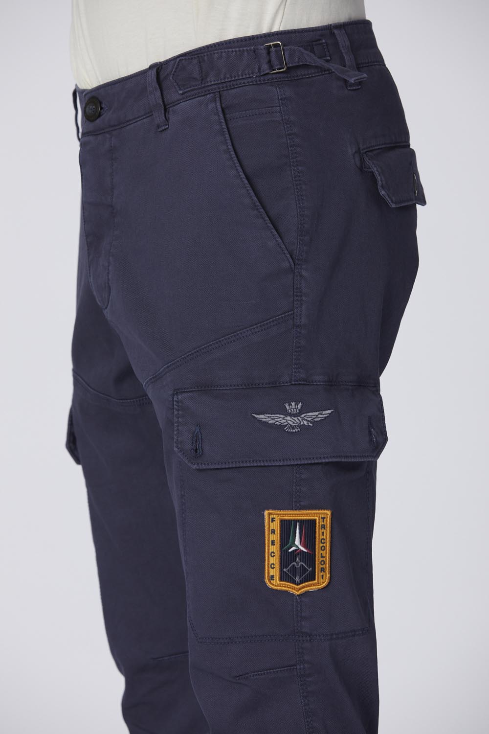 Tyto pánské strečové bavlněné cargo kalhoty mají ležérní design s nastavitelným pasem pro lepší přizpůsobení. Tento kousek, vylepšený praktickými bočními cargo kapsami a nášivkami věnovanými značce Frecce Tricolori, se snadno kombinuje s každodenním vzhledem.