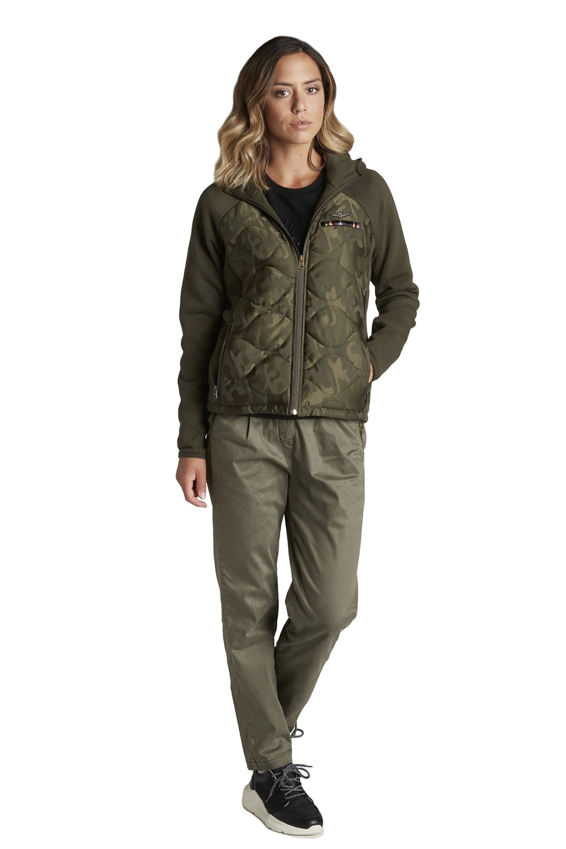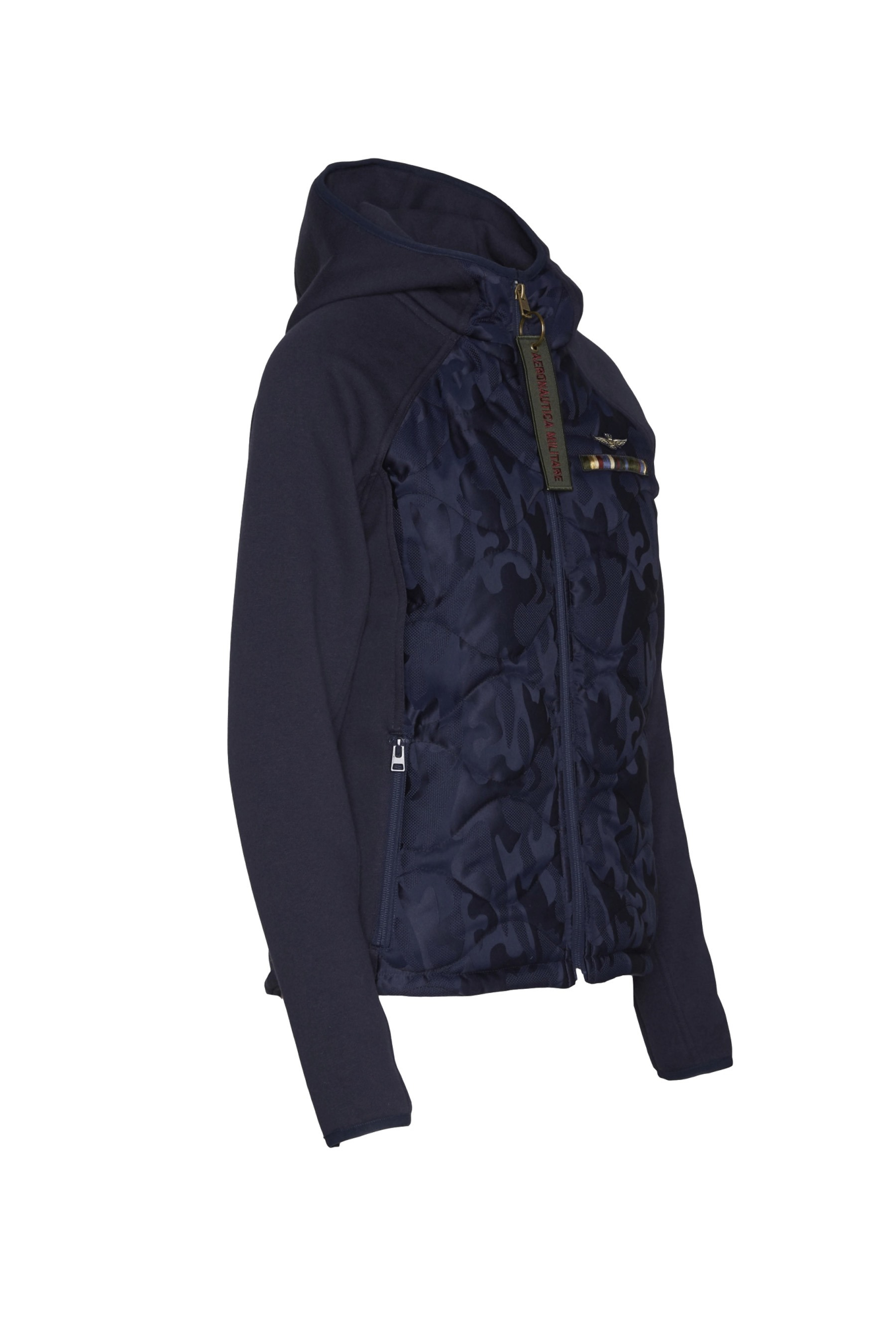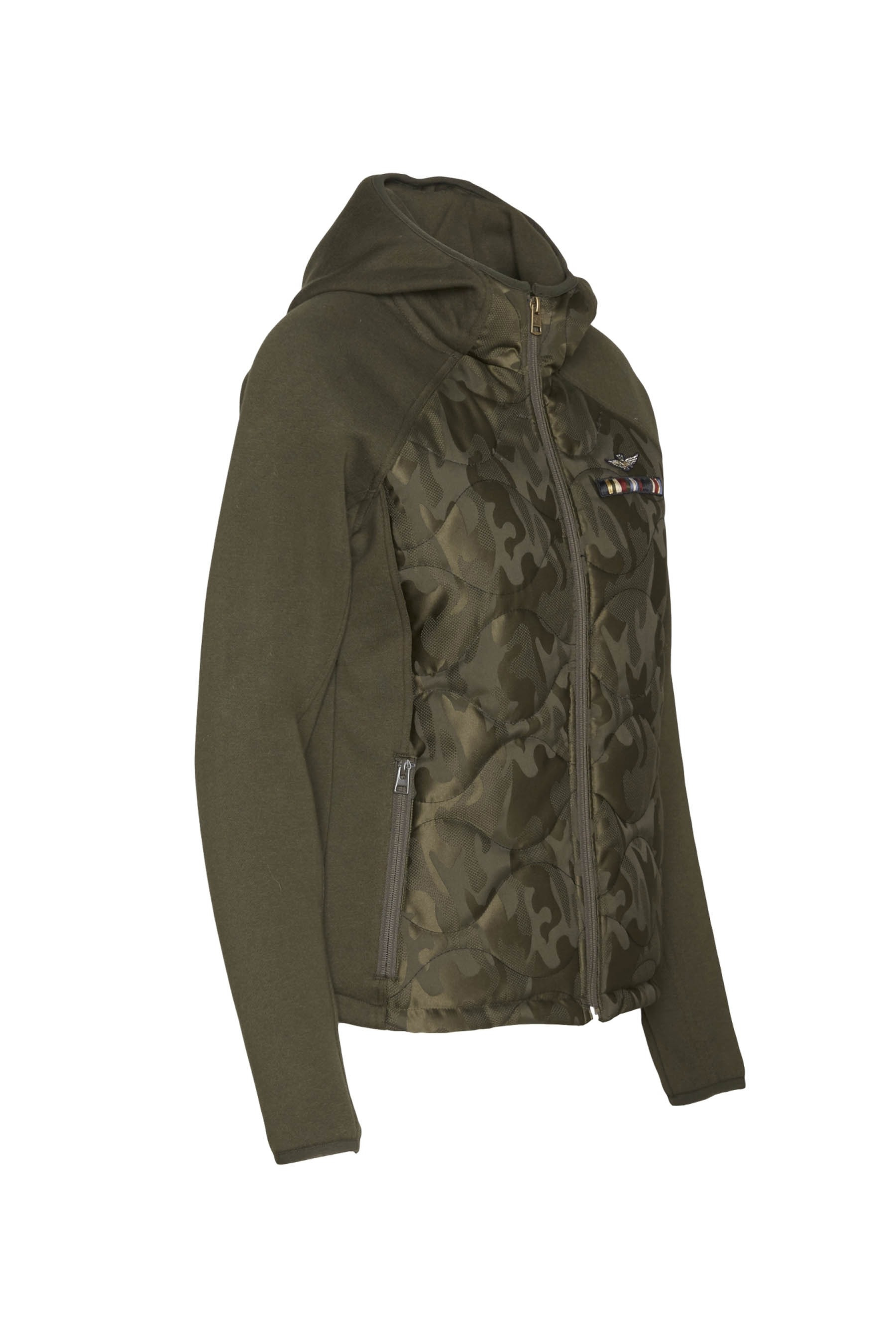 - Tkanina s prošívanými maskáčovými vsadkami na přední a zadní straně.