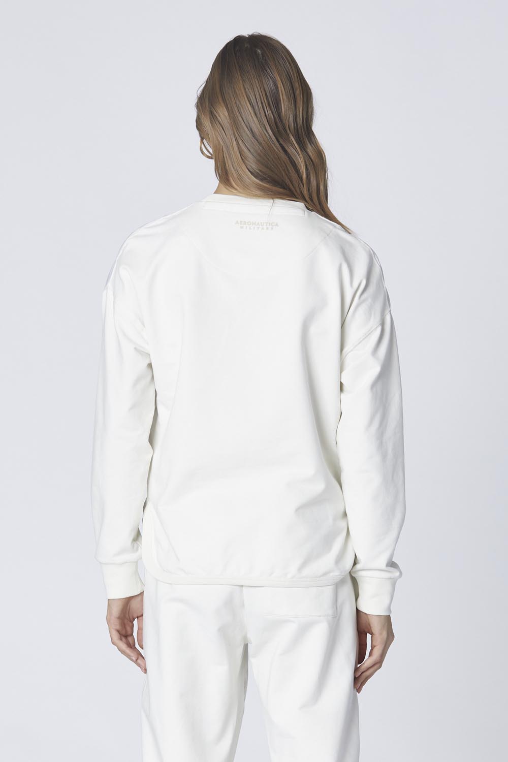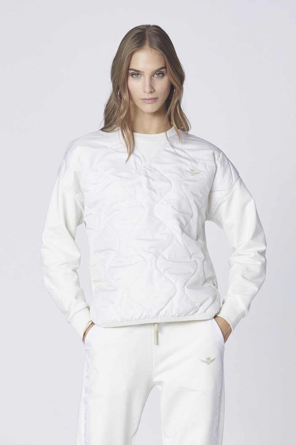 Dámská mikina s výstřihem z elastické broušené bavlny, obohacená o tonální prošívané nylonové kontrasty na přední straně. Volný střih nabízí ležérní eleganci, ideální pro ty, kdo hledají nadčasové pohodlí a styl s nádechem originality.