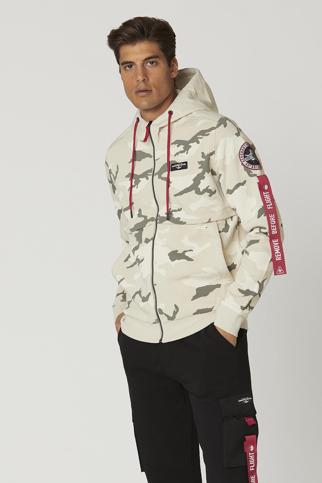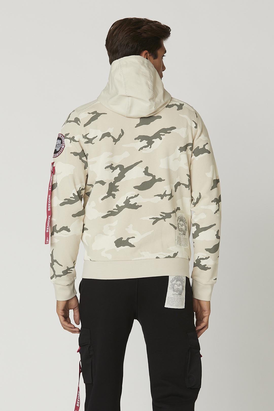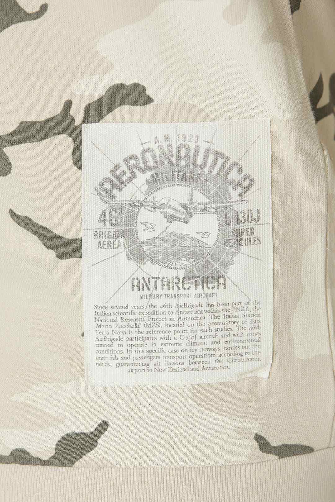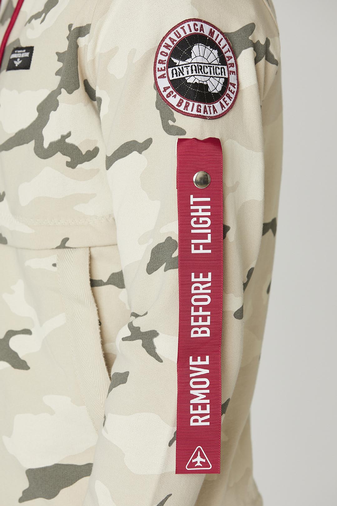 Tato mikina je součástí speciální edice inspirované expedicí do Antarktidy a kombinuje hřejivou a měkkou bavlnu s kartáčovaným vnitřkem a technickými nylonovými vložkami. Exkluzivní nádech jí dodává maskáčový potisk v neutrálních a jemných tónech spolu s reflexní nášivkou a odnímatelnou stužkou "Remove before flight" na levém rukávu, která připomíná svět armády.