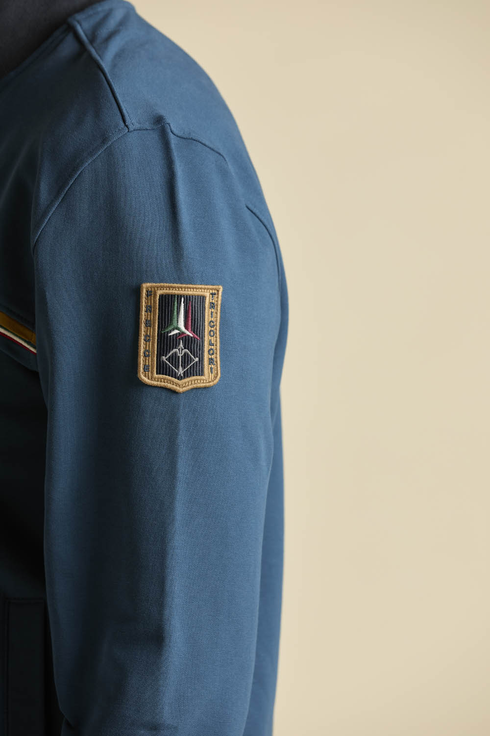 Výrazná výšivka MB-339 ITALIA Frecce Tricolori na hrudi vzdává hold legendárnímu letounu, na němž létá Pattuglia Acrobatica Nazionale. Trikolorní detail napříč hrudí podtrhuje národní hrdost a dodává modelu jasně rozpoznatelný charakter. Kontrastní žebrované lemy, vysoký límec a přední zip přinášejí technický prvek inspirovaný světem letectví.