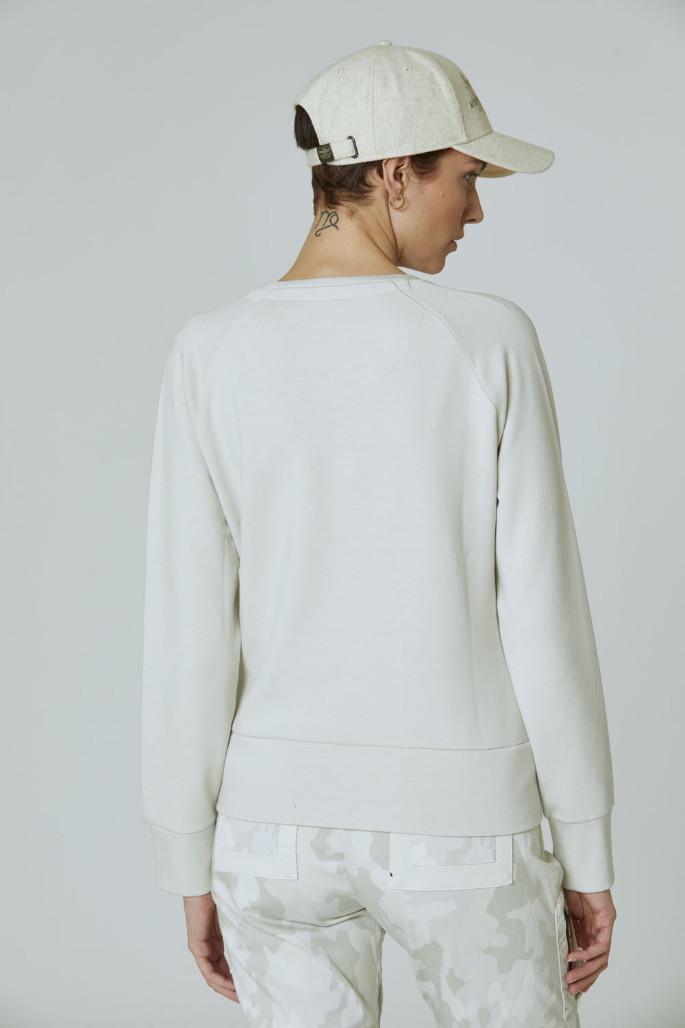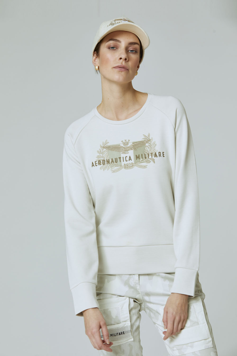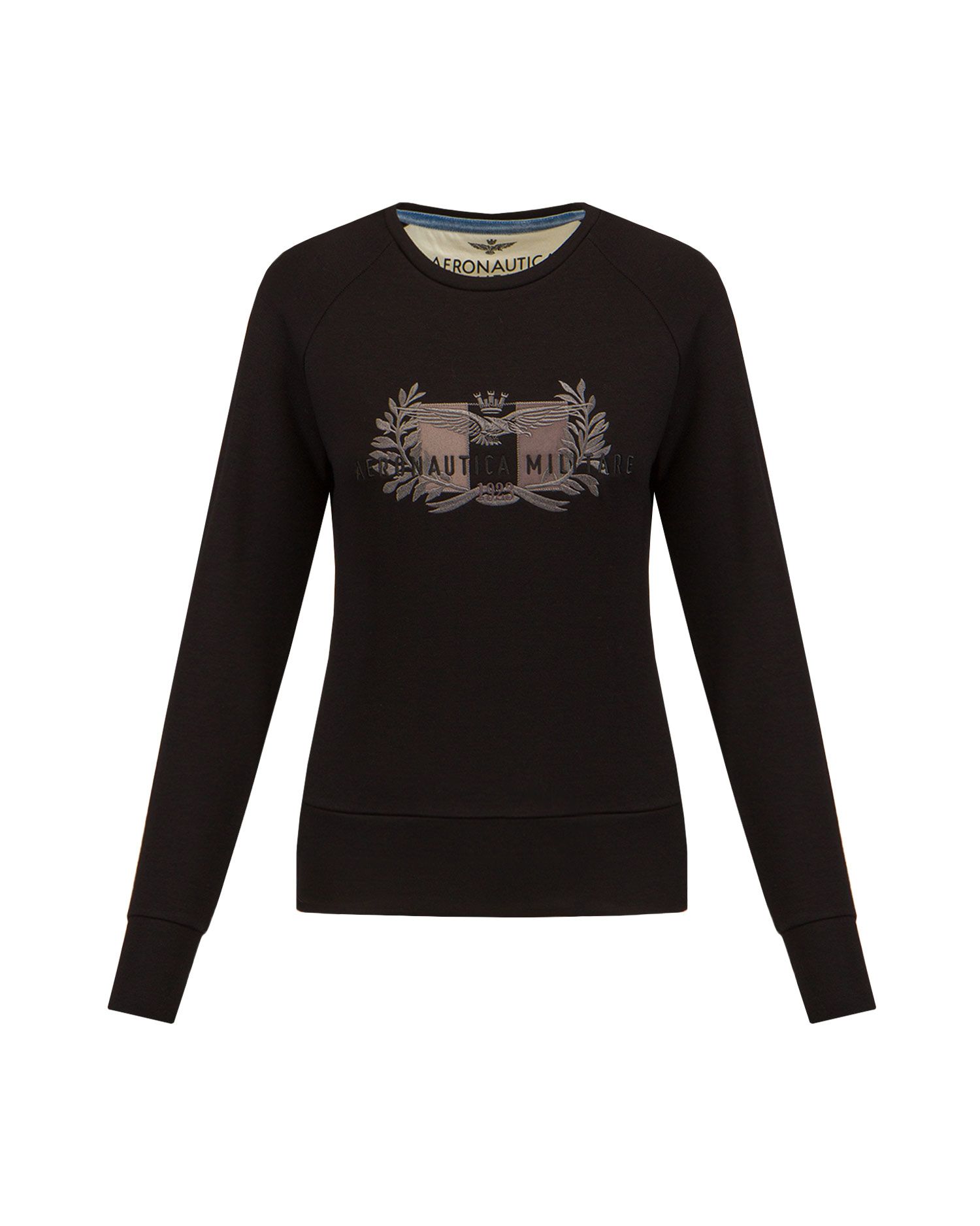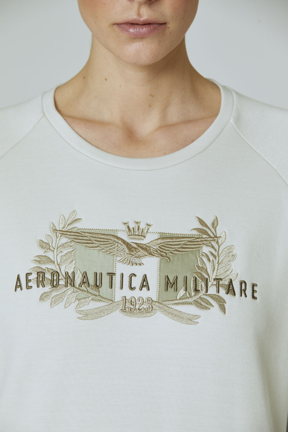 Měkká a hřejivá mikina s výstřihem z elastické gázové viskózy zdobená jemnou tónovou výšivkou, která zobrazuje charakteristické symboly letectva: italskou vlajku obklopenou vavříny a nad ní se tyčí ikonický orel s věží.