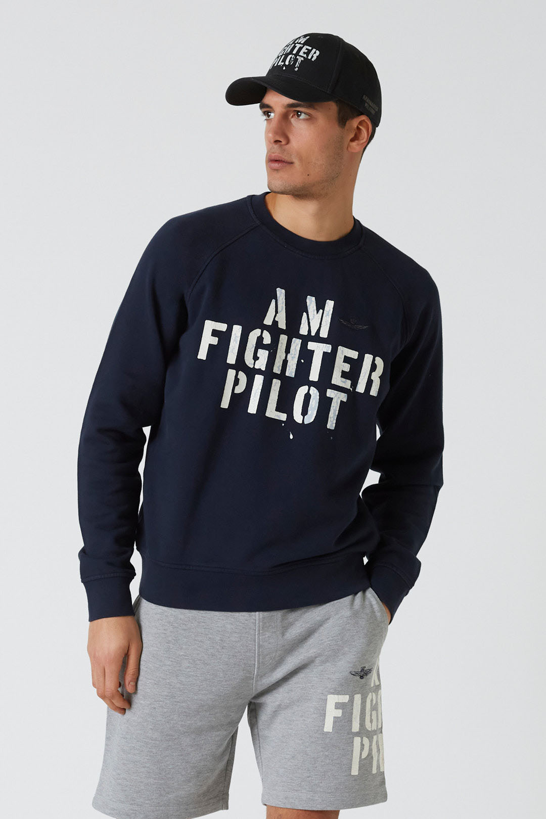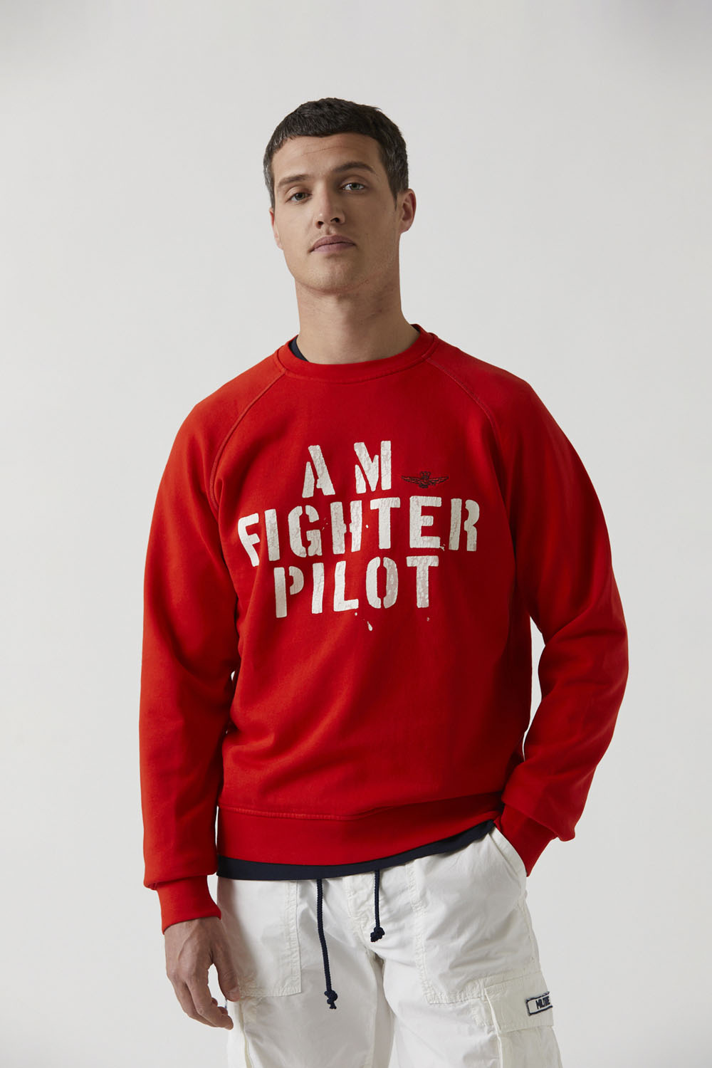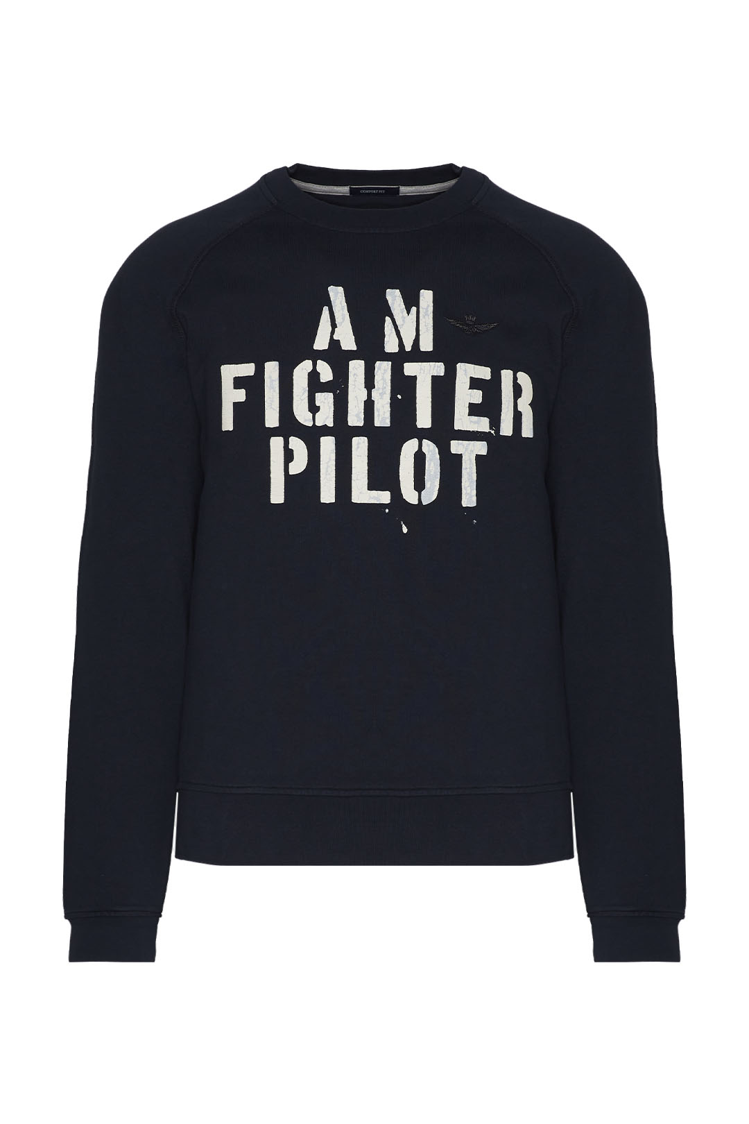 Sportovní, mladistvý duch této měkké bavlněné mikiny s výstřihem. Uprostřed vyniká potisk „AM Fighter Pilot“, grafický motiv převzatý z 61. křídla, jehož primárním posláním je poskytovat letecký výcvik a vzdělávání budoucích vojenských pilotů.