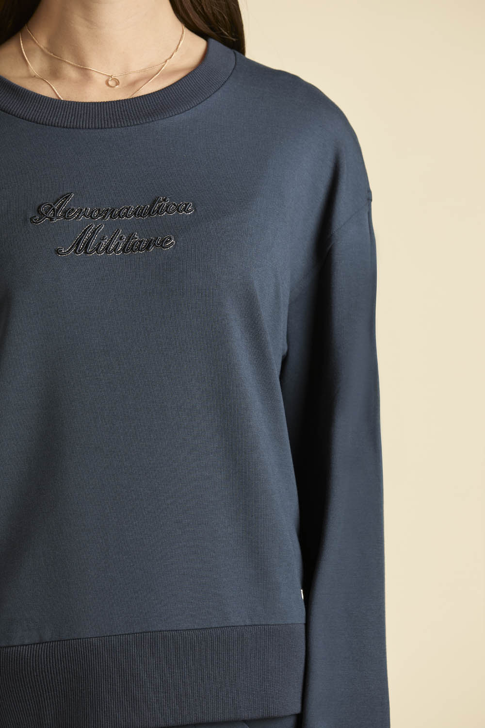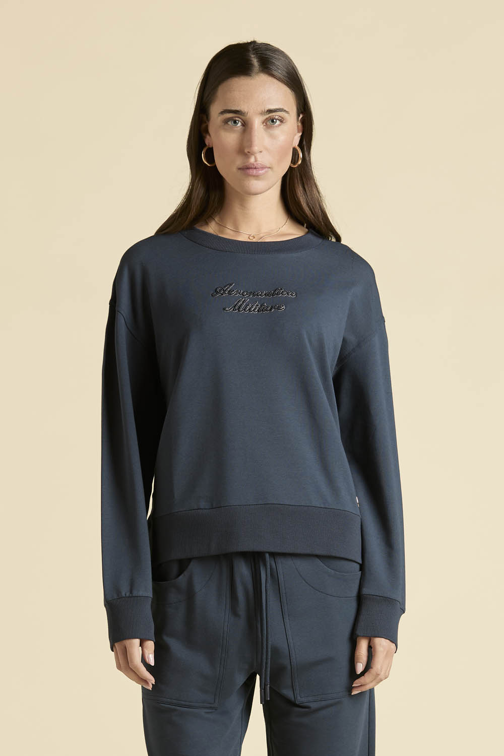 Dámská mikina s kulatým výstřihem z jemného fleecu z bavlny a modalu s příměsí elastanu je ideální volbou pro ty, které milují jednoduchost, ale chtějí zaujmout. Dominantním prvkem je výrazná výšivka „Aeronautica Militare“ na hrudi, která dodává modelu osobitost a odkazuje na tradici stylu a charakteru. Pohodlný a univerzální kousek, který vás bude doprovázet po celý den s lehkostí a sebevědomím.