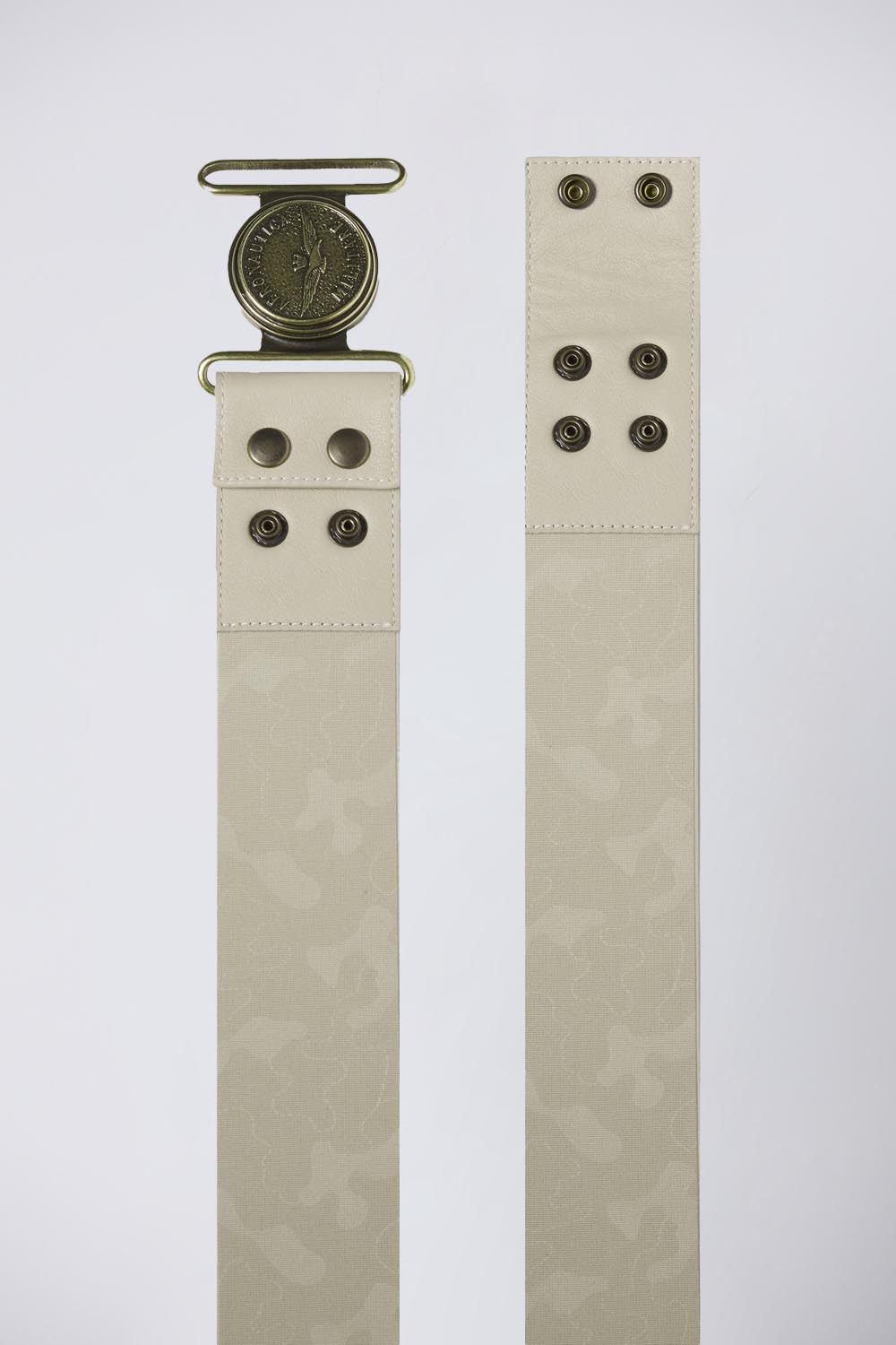 Tento dámský elastický opasek má jedinečný maskovací vzor aplikovaný horkou ražbou. Obsahuje kožené detaily v tónu se zlatými knoflíky a výraznou přezkou s logem, což z něj činí výrazný a rafinovaný doplněk, který je ideální pro dodání stylu každému oblečení.