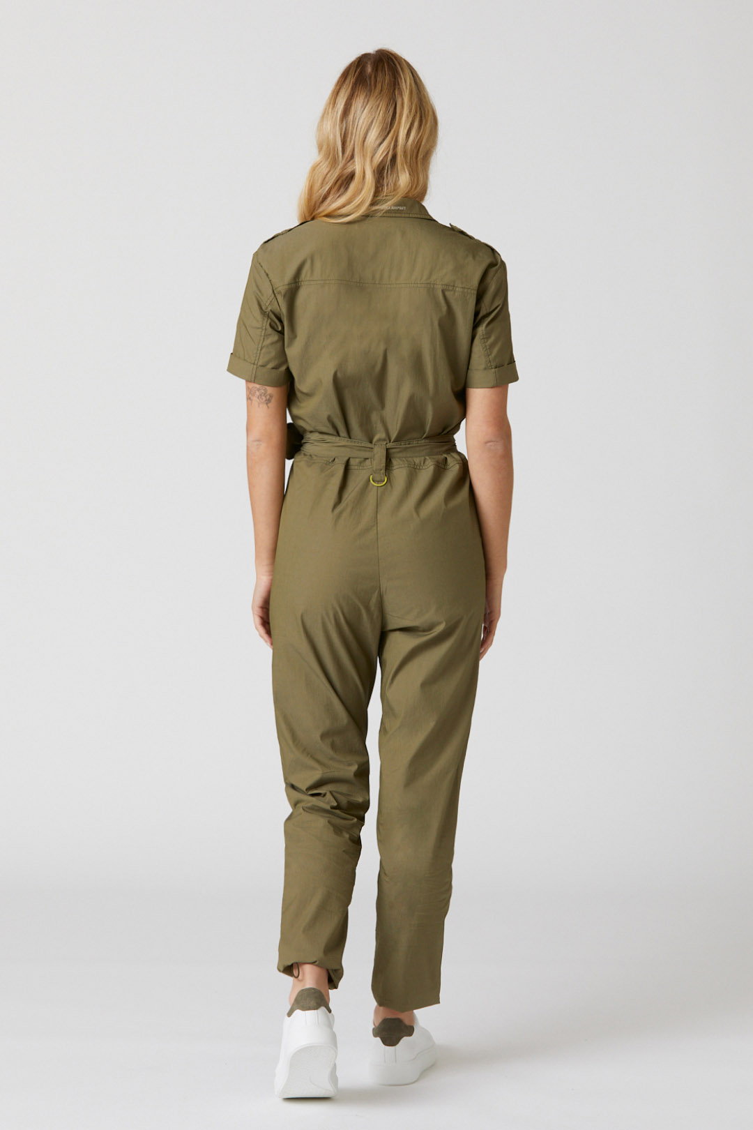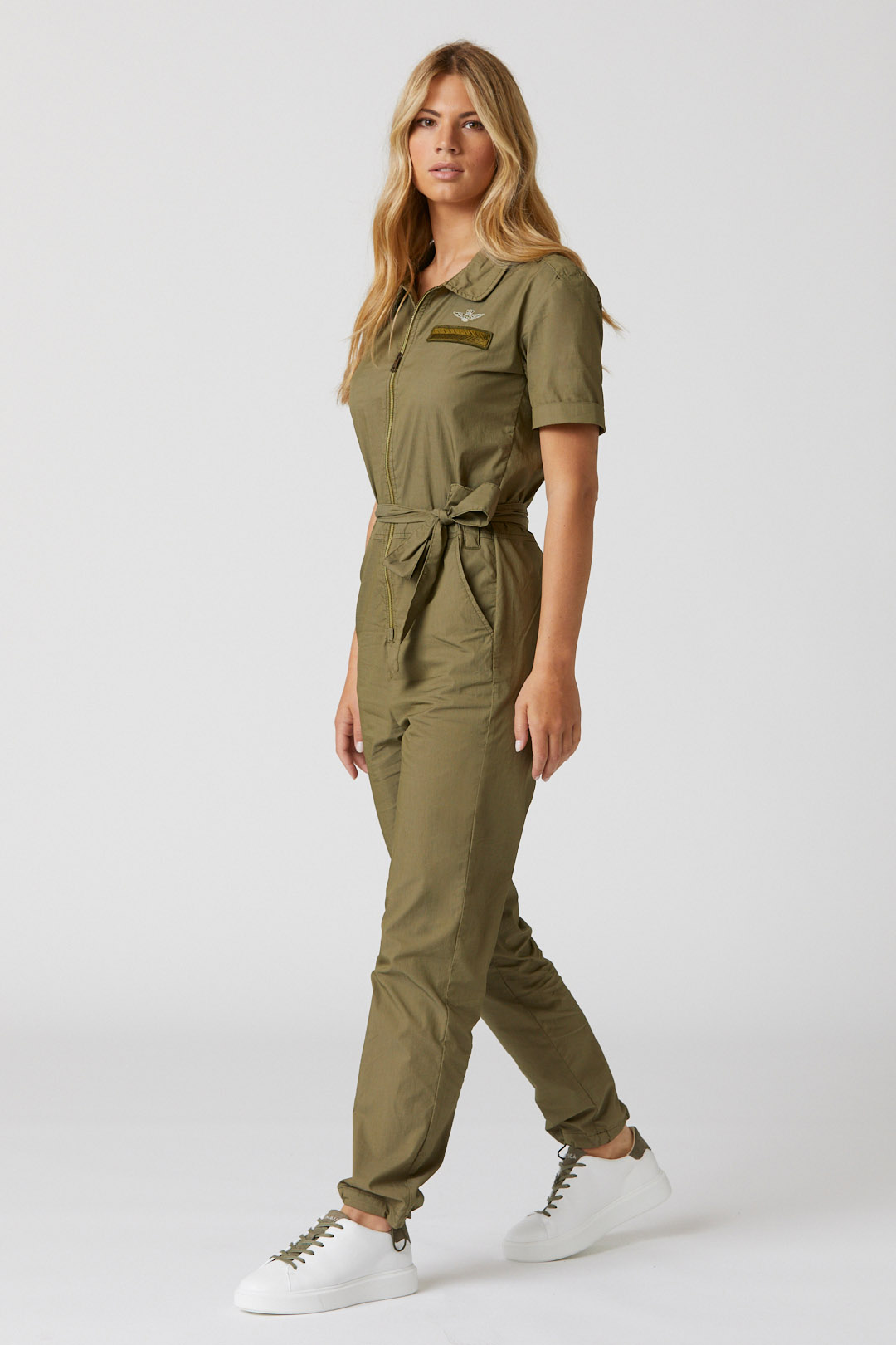 Pokud hledáte ležérní vzhled inspirovaný armádou, tato jednodílná kombinéza z bavlněného popelínu a strečového nylonu je pro vás dokonalým oděvem. Tento model, zdobený originálními detaily, jako je pas a výšivka loga na vnitřní klopě zipu, bude neodmyslitelnou součástí jara.
