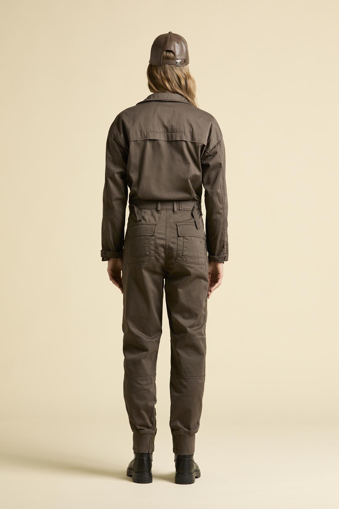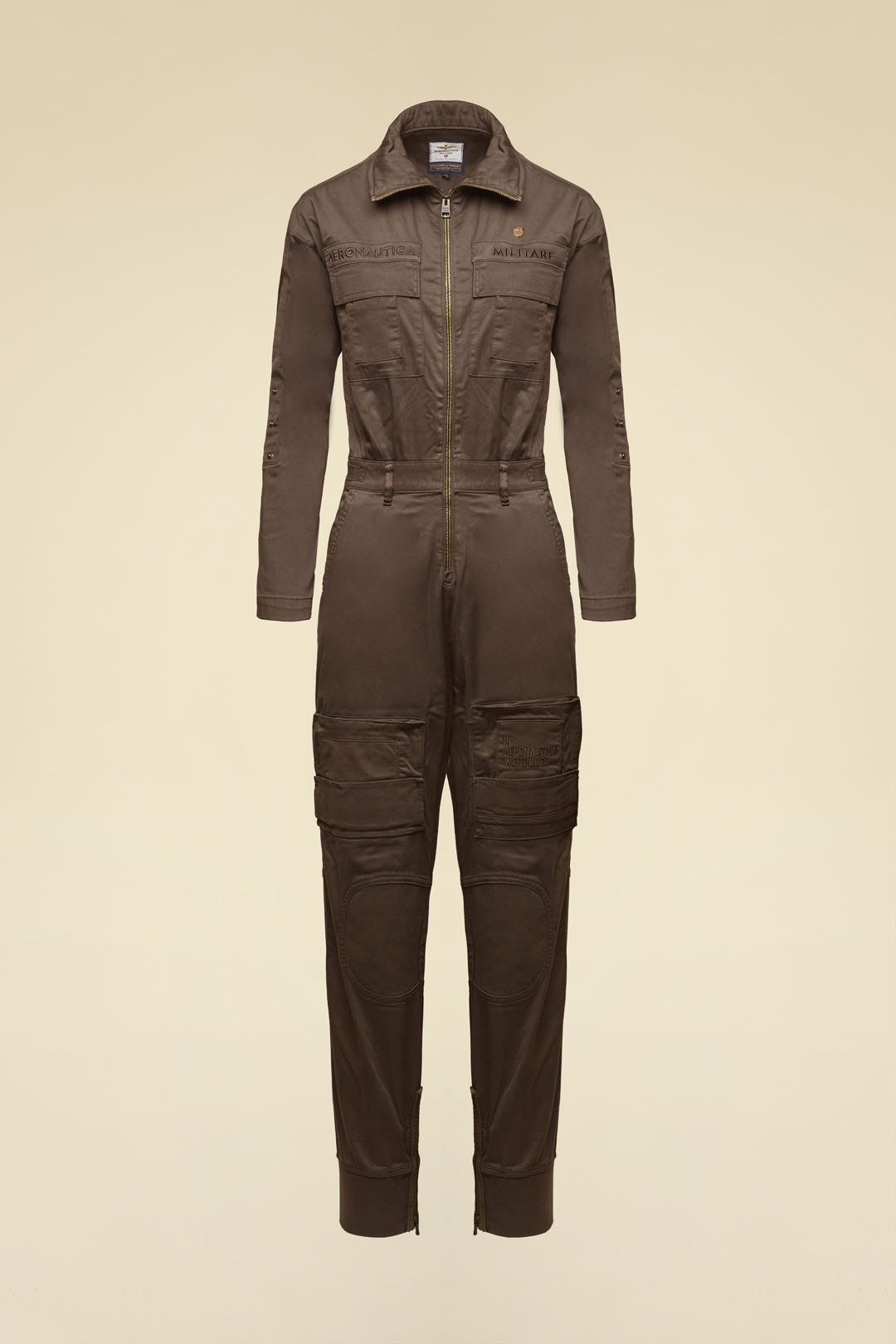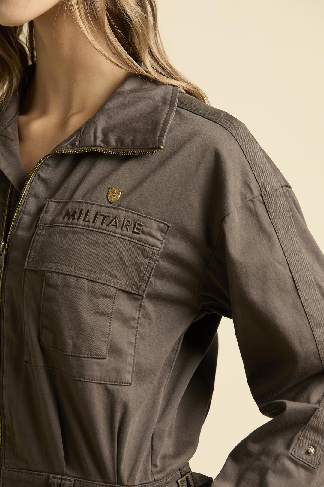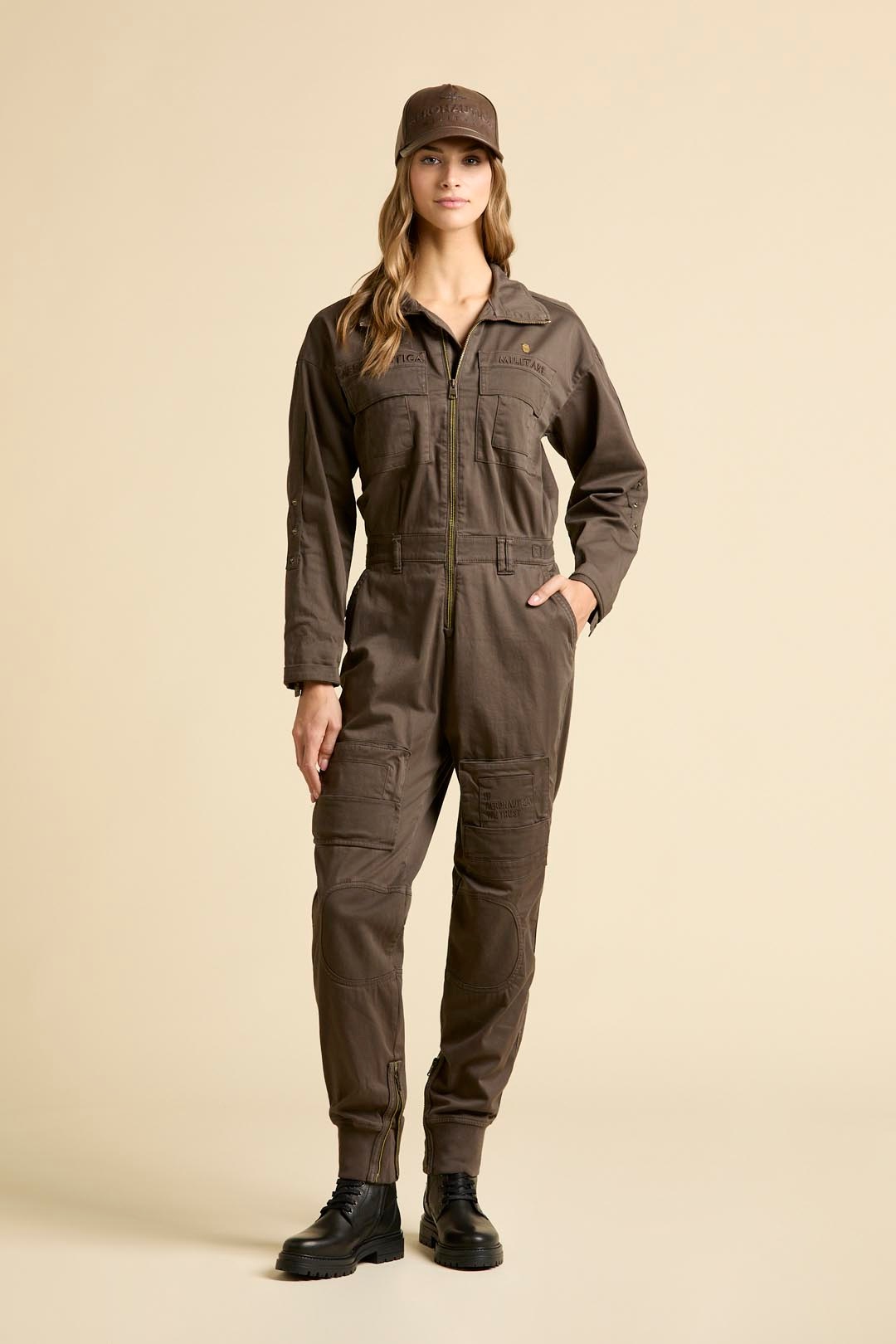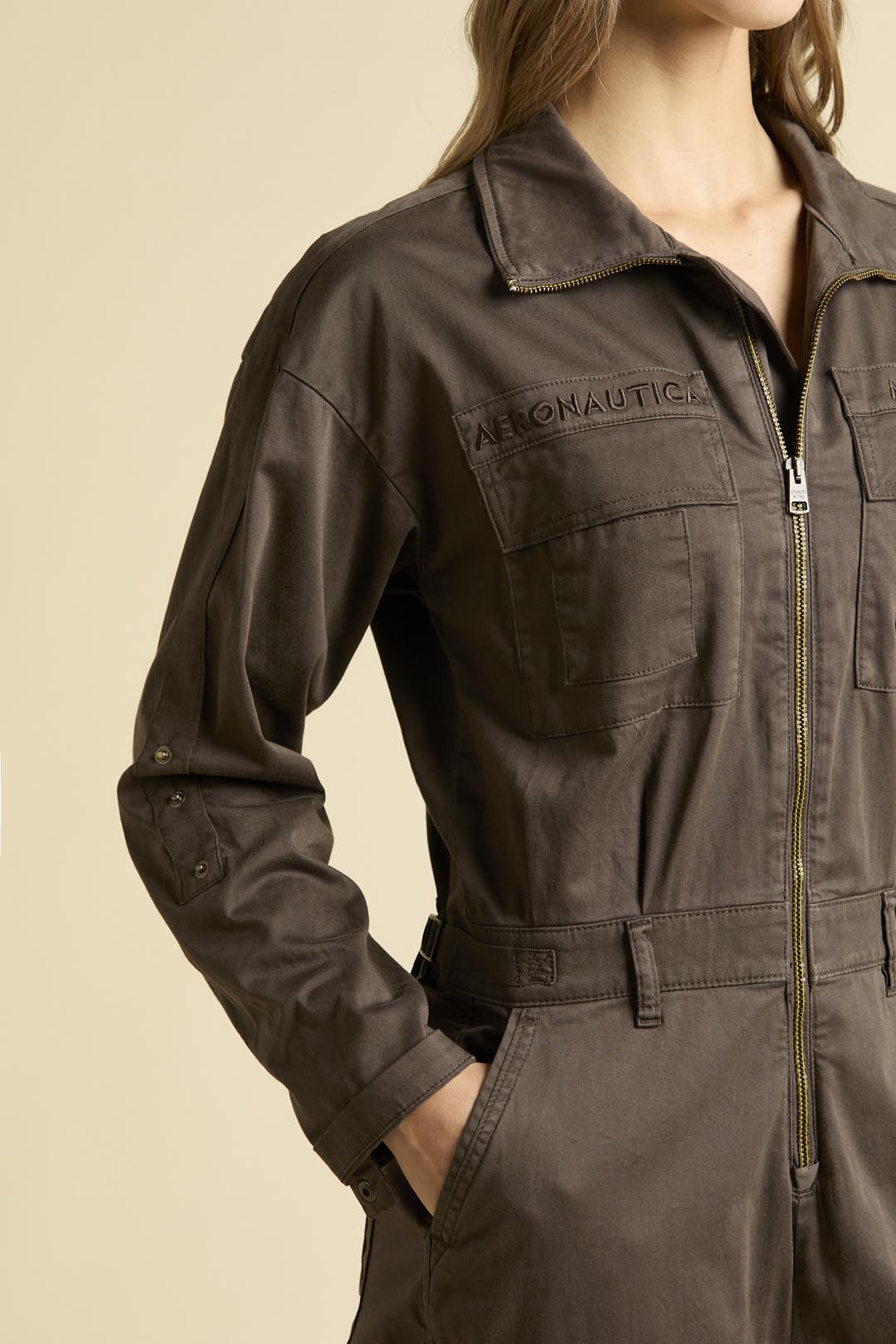 Tato dámská dlouhá kombinéza reinterpretovala klasické letecké oděvy italských pilotů s důrazem na ženskou eleganci a praktičnost. Vyrobena je z barvené bavlněné saténové tkaniny s kontrastními gabardénovými detaily, které podtrhují její rafinovaný vzhled a funkčnost. Charakteristické obrácené kapsy původně sloužily k rychlému přístupu k letovým plánům a spolu s mnoha dalšími kapsami, nastavitelným pasem a žebrovanými manžetami s zipy činí kombinézu nepostradatelnou součástí šatníku.