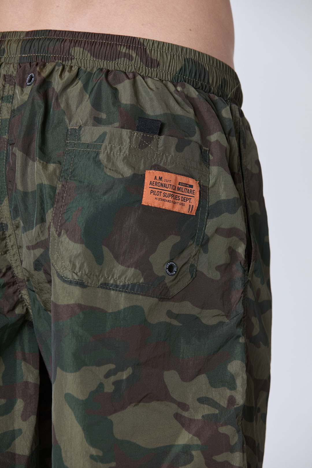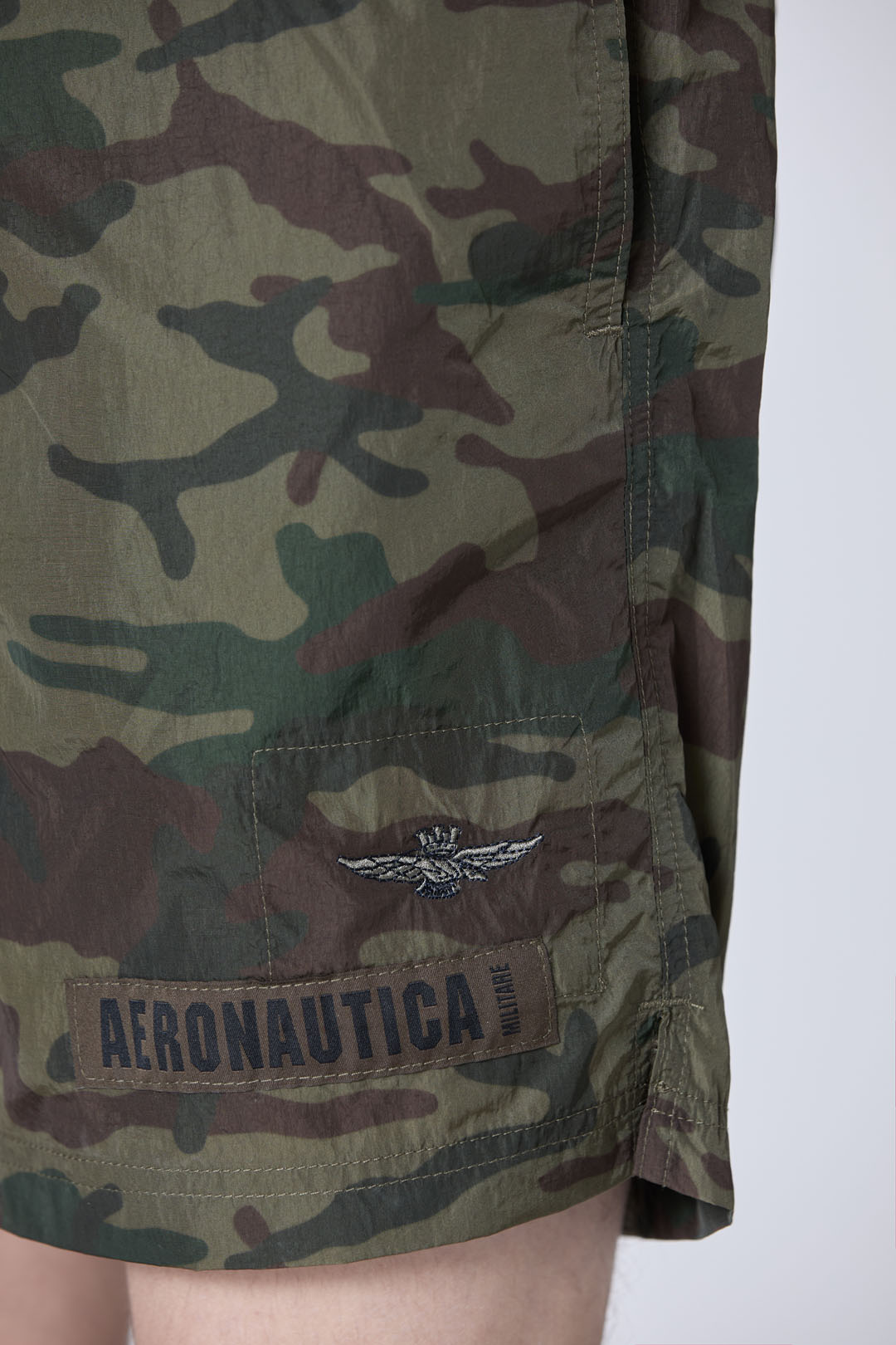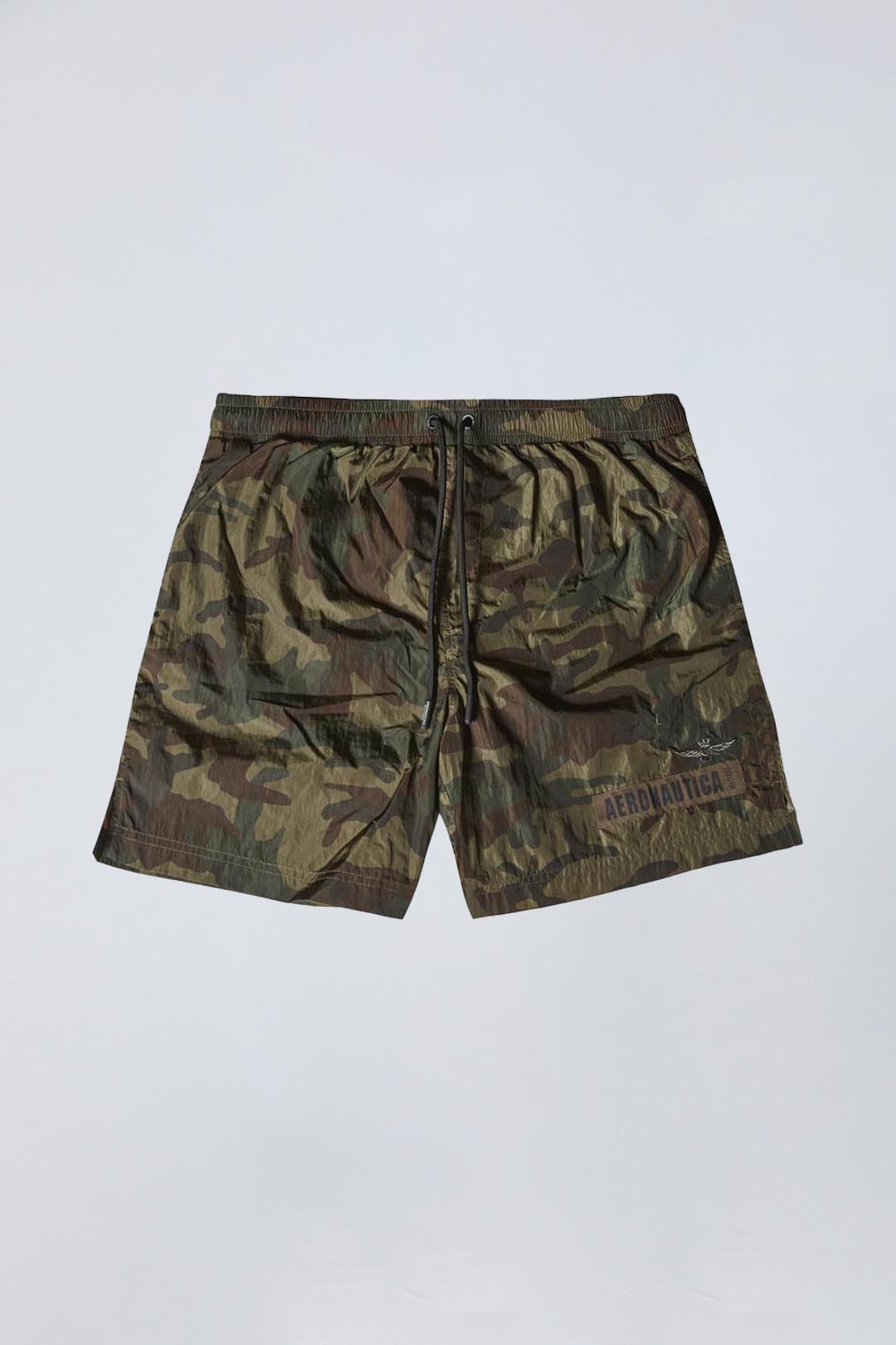 Tyto plavky kombinují lehkou tkaninu s odvážným maskovacím potiskem ve vojenském zeleném a hnědém odstínu a vytvářejí tak výrazný vzhled inspirovaný vojenským stylem. Jsou doplněny vlastními štítky, které vystihují dobrodružného a odhodlaného ducha pilotů Aeronautica Militare, a jsou tak ideální volbou pro každého, kdo chce na pláži vyniknout.