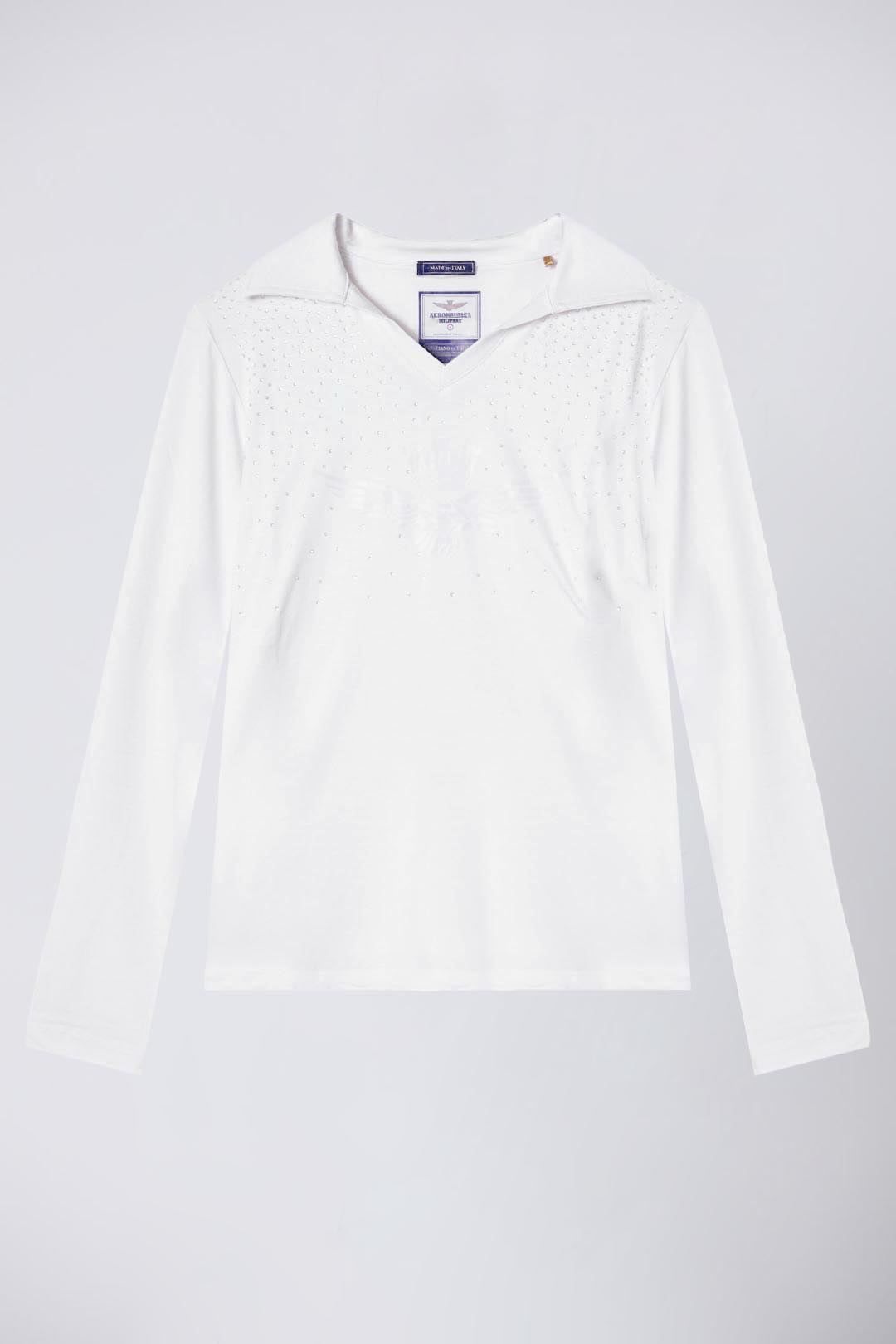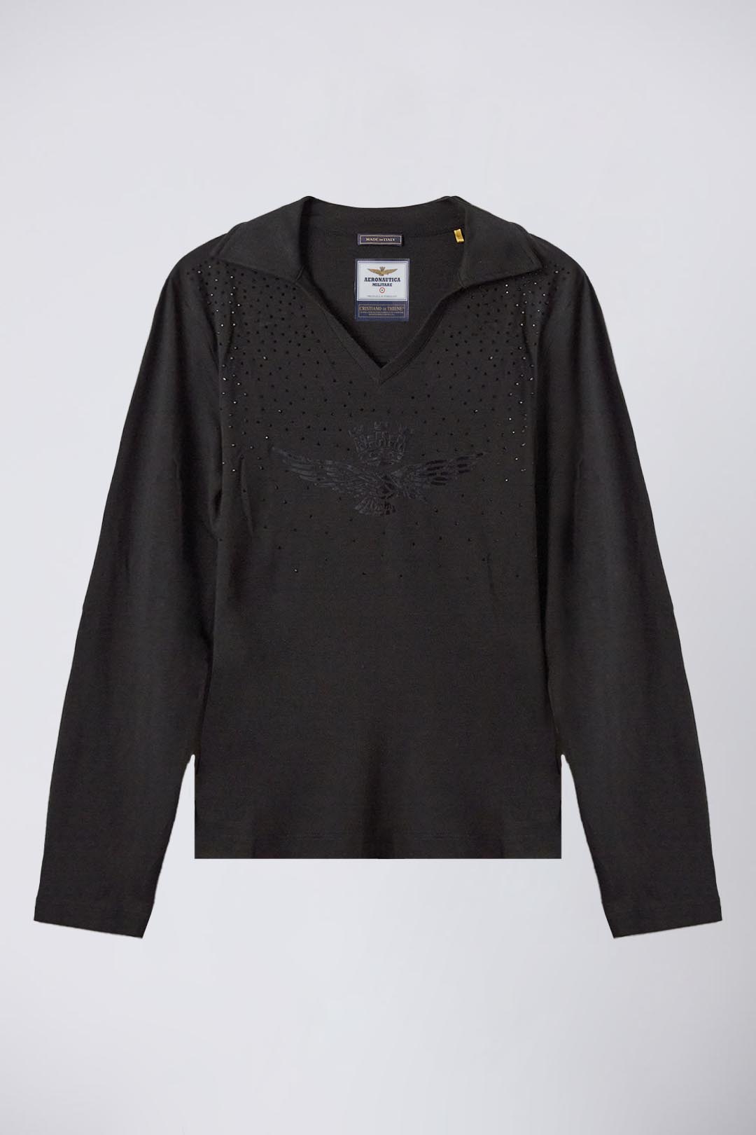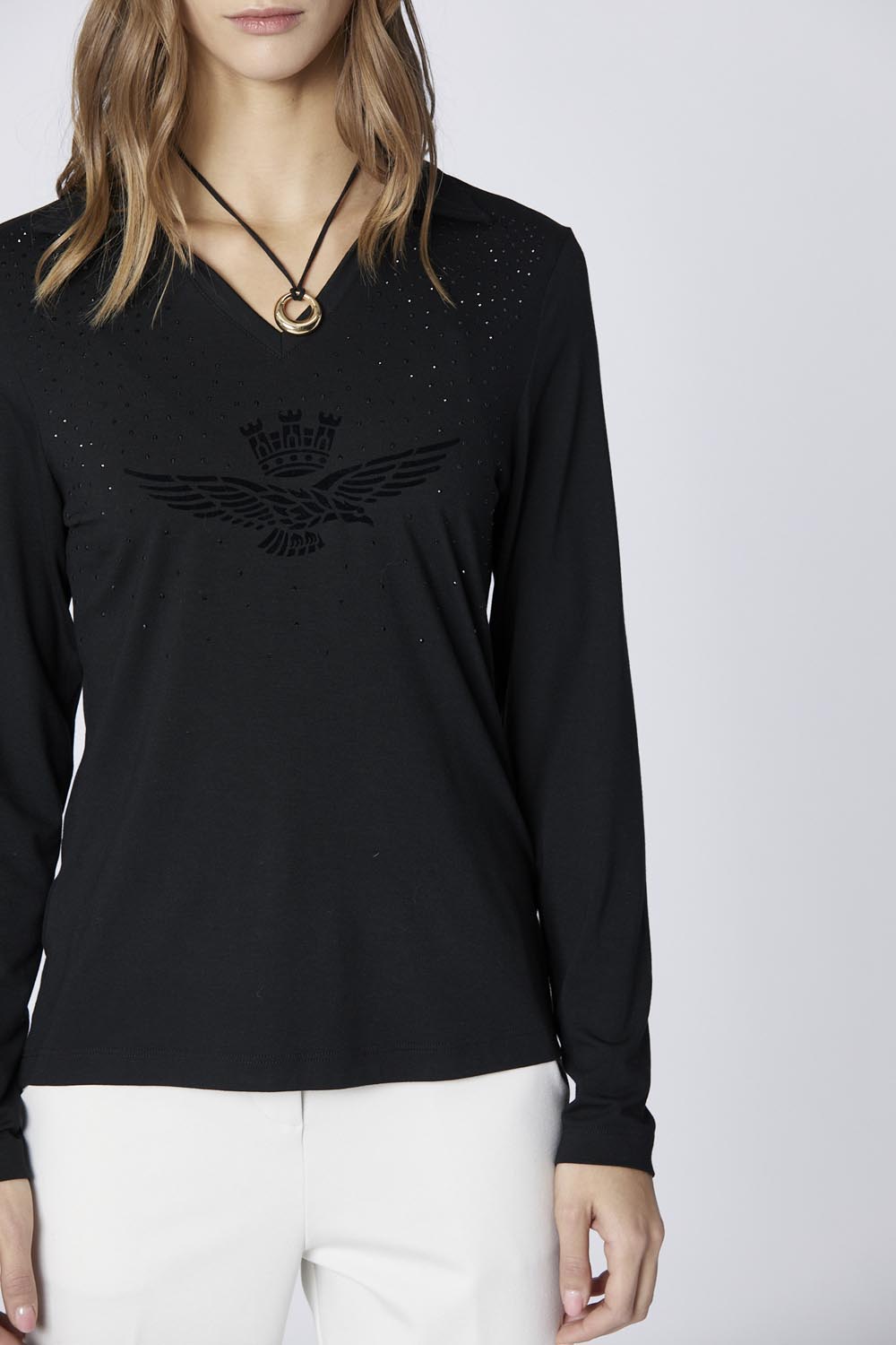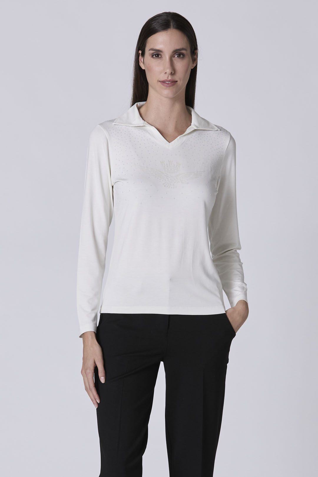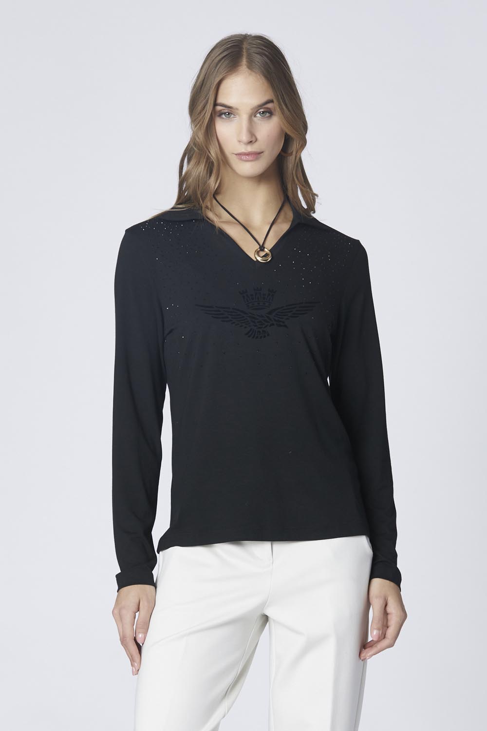 Tato výrazná dámská polokošile s dlouhým rukávem je vyrobena z mimořádně měkké strečové tkaniny, která zajišťuje přiléhavý a pohodlný střih, jenž elegantně obepíná tělo. Design je navíc obohacen potiskem ikonického znaku orla, symbolu síly a prestiže, obohaceného kaskádou třpytivých kamínků, které jemně spadají z ramen. Tento oděv nejenže dodá každému outfitu šmrnc, ale také upoutá pozornost svými rafinovanými detaily.