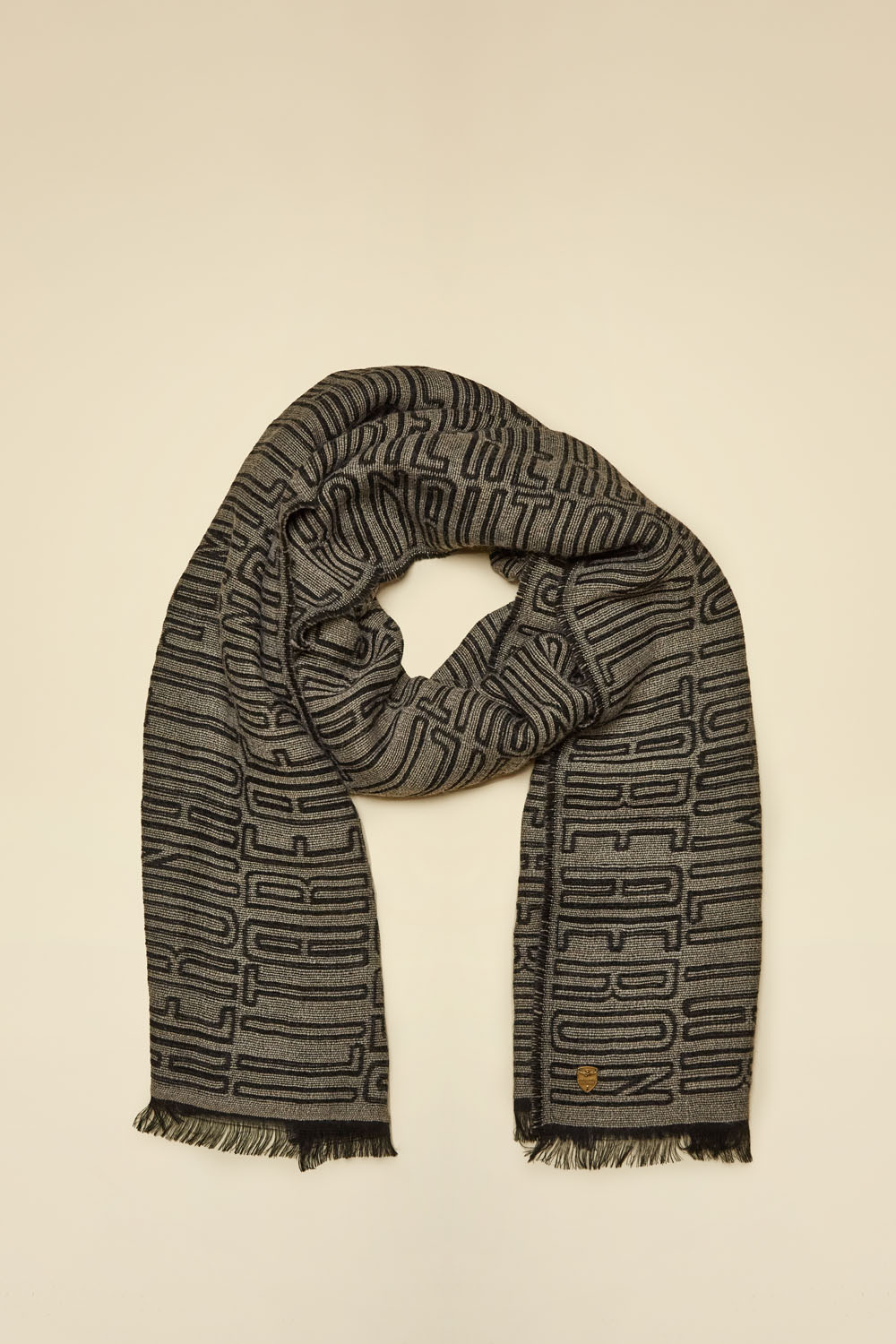Tento dámský šátek je perfektním doplňkem pro každodenní styling, který dodá vašemu outfitu osobitý nádech. Vyrobený z jemné směsi vlny, šátek kombinuje teplo s moderním designem. Celoplošný potisk loga dává šátku jedinečný charakter, zatímco kovová plaketa s logem a třásně na spodní straně podtrhují jeho rafinovaný vzhled.