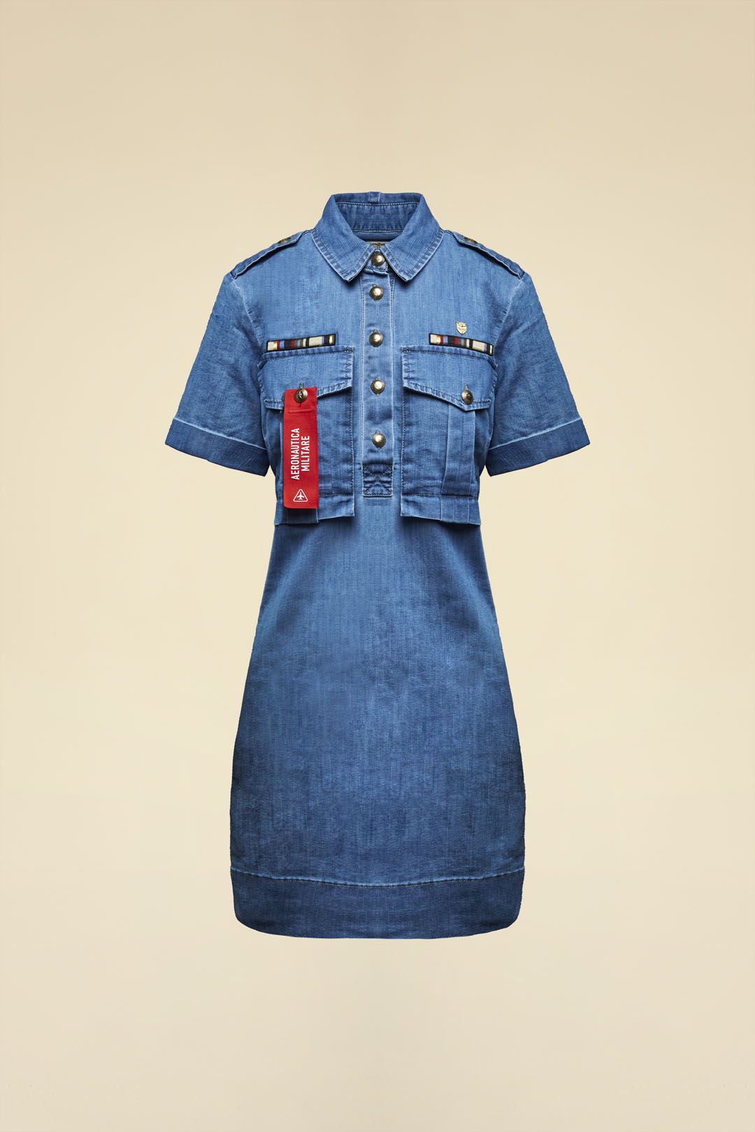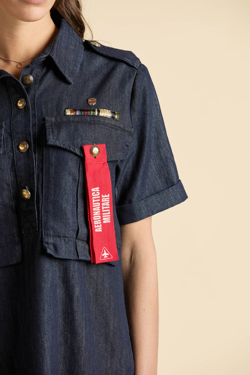 Délka do poloviny stehen a jemně patinovaný vzhled materiálu vytvářejí svěží letní siluetu, zatímco košilový límec a centrální zapínání na knoflíky dodávají modelu strukturovaný, ale stále nenucený výraz. Krátké rukávy doplněné nárameníky (alamari) podtrhují dynamickou estetiku a odkazují na vojenské inspirace značky.