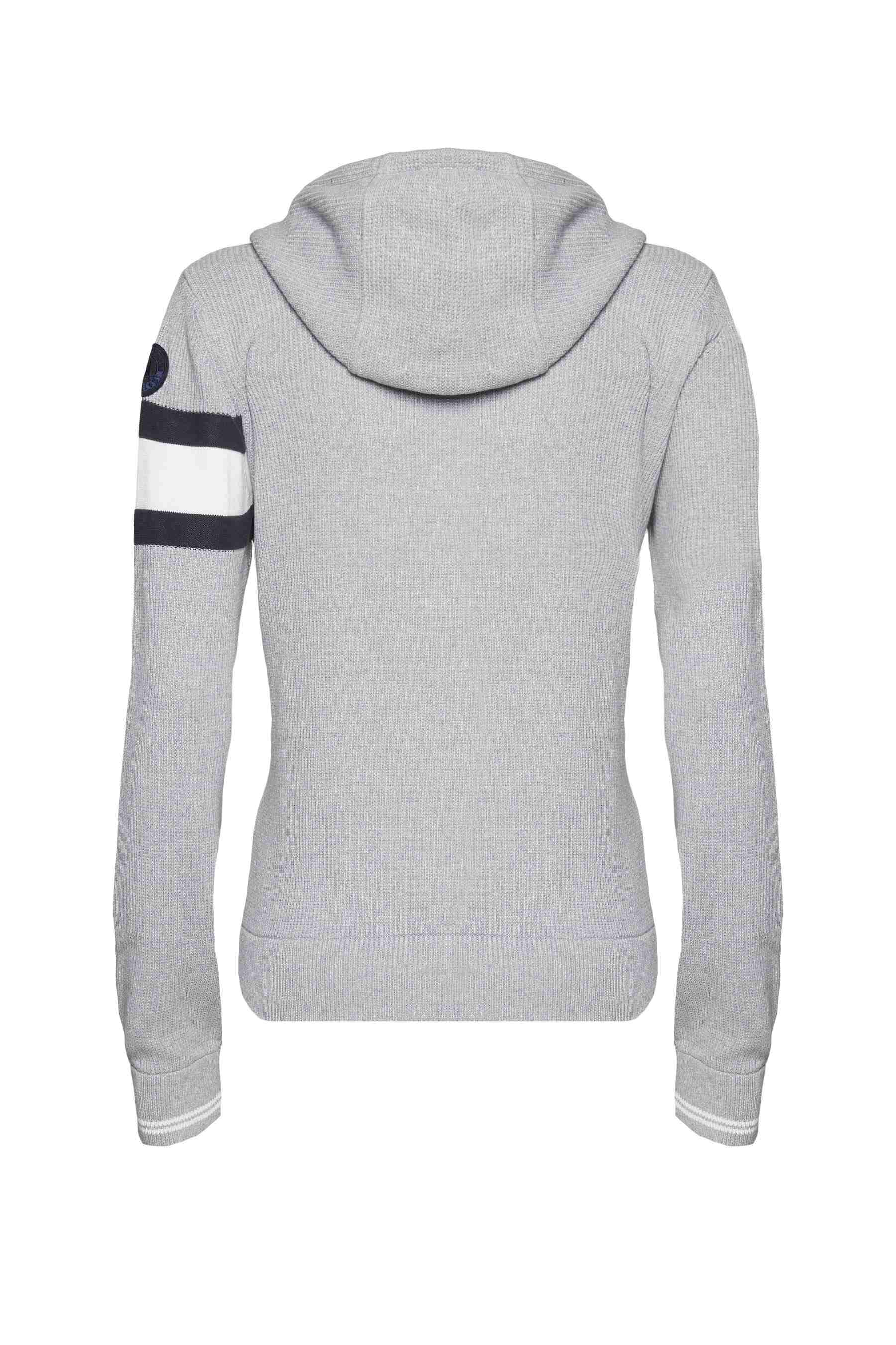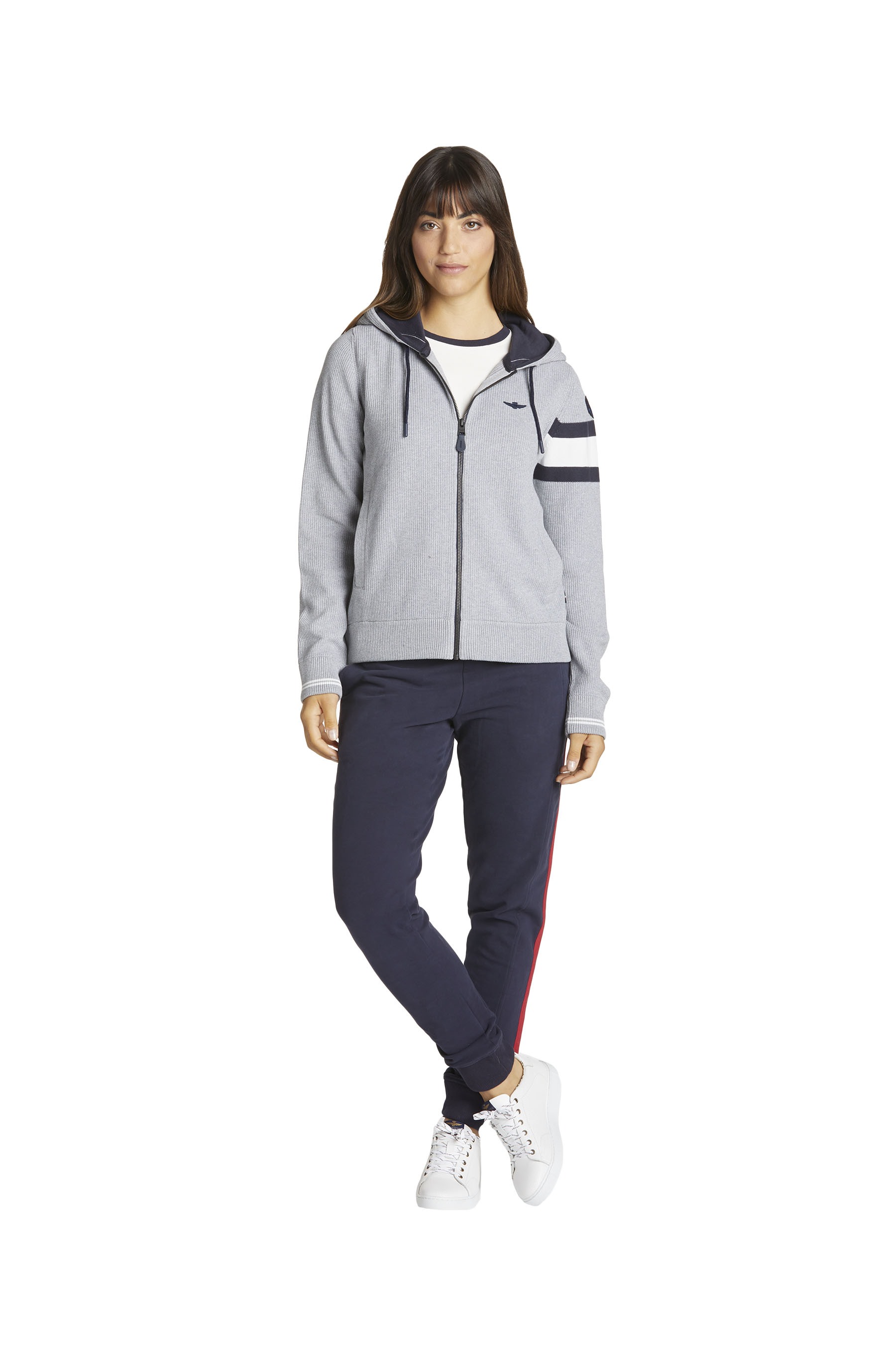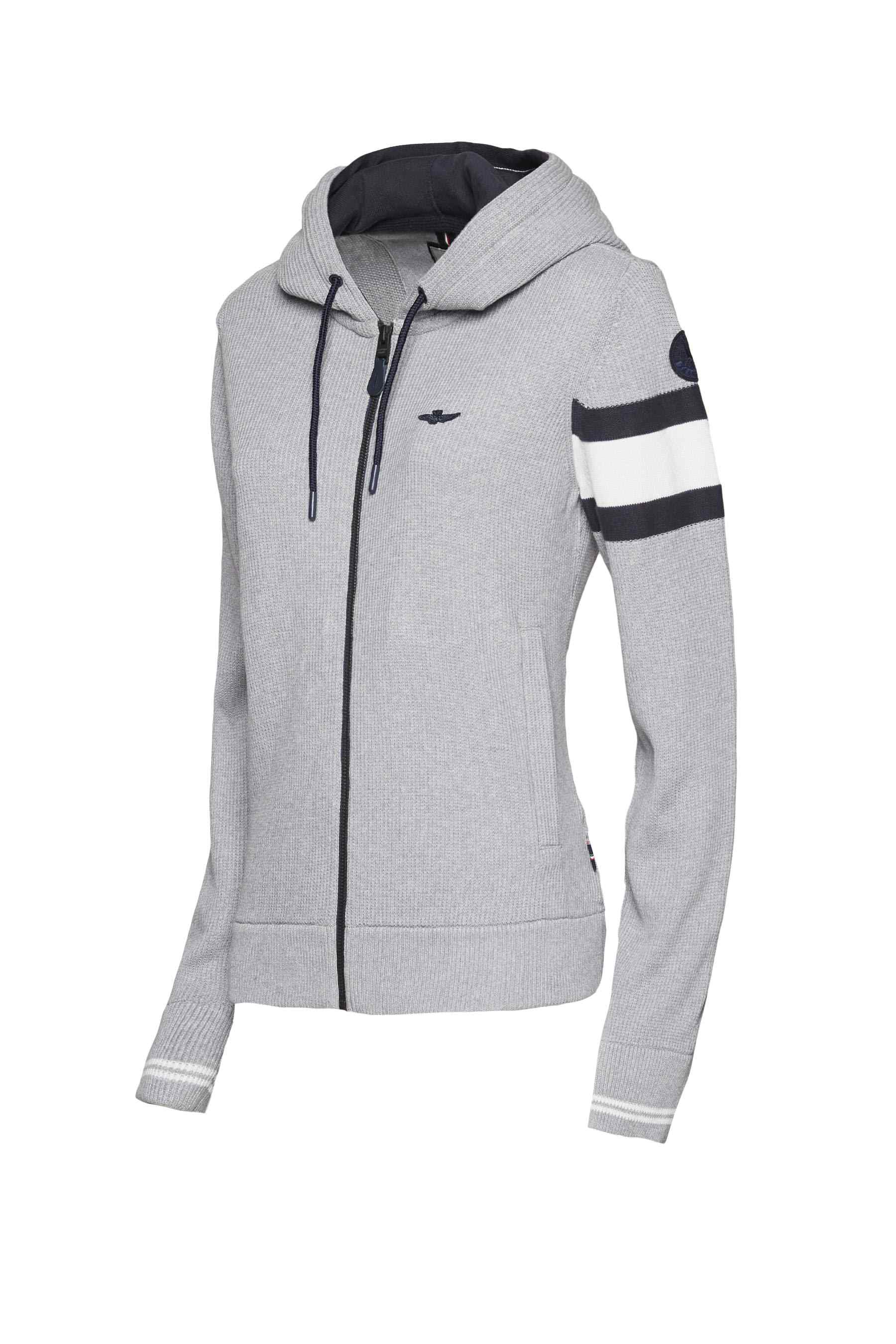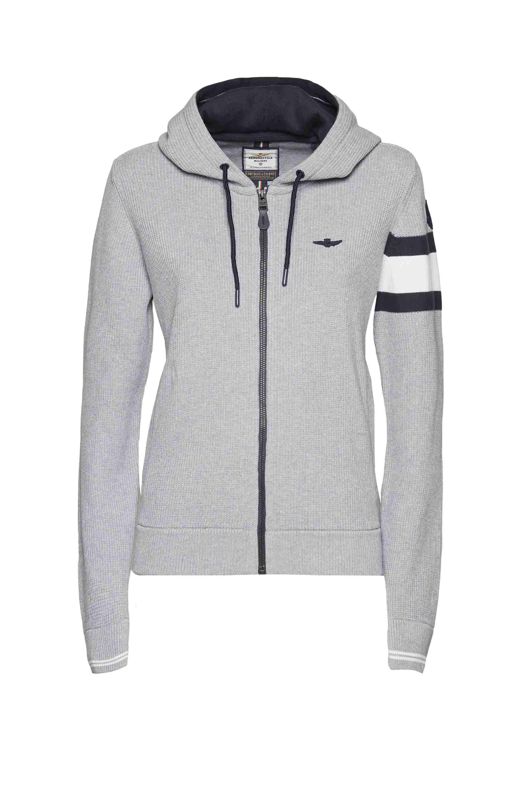 Dámský svetr Aeronautica Militare se střihem sportovní mikiny s kapucí. Svetru dodává styl hrubý úplet. Svetr je se zapínáním na zip a se dvěma předními kapsami. Vyrobený z lehké a prodyšné bavlny. Na rameni je nášivka Frecce Tricolori.