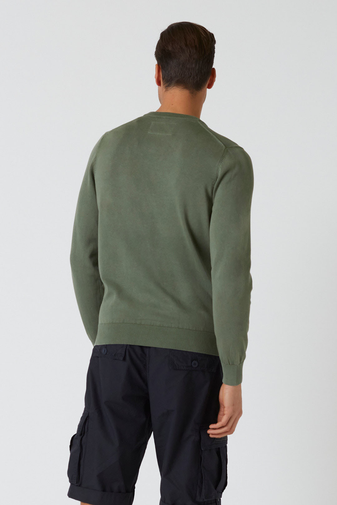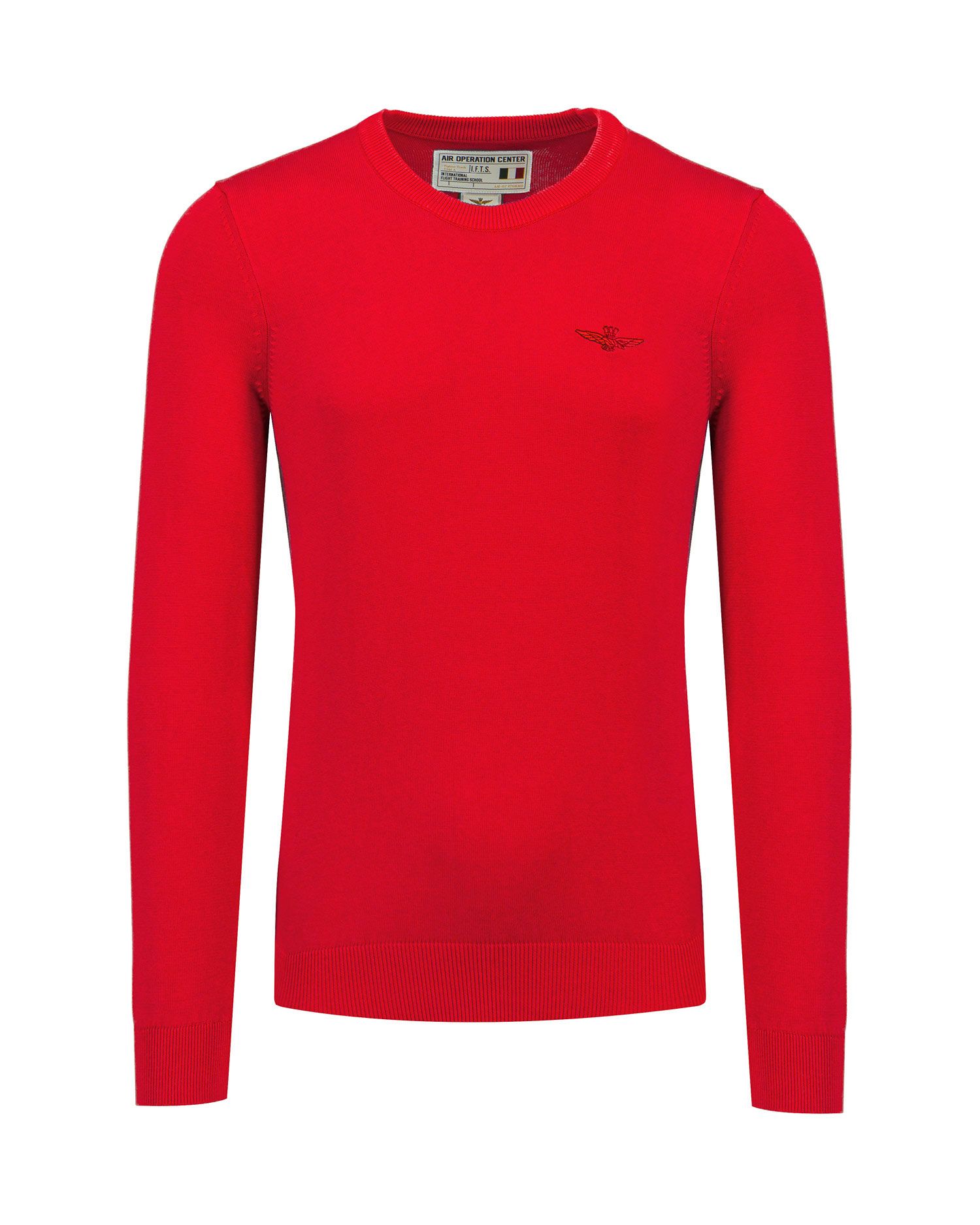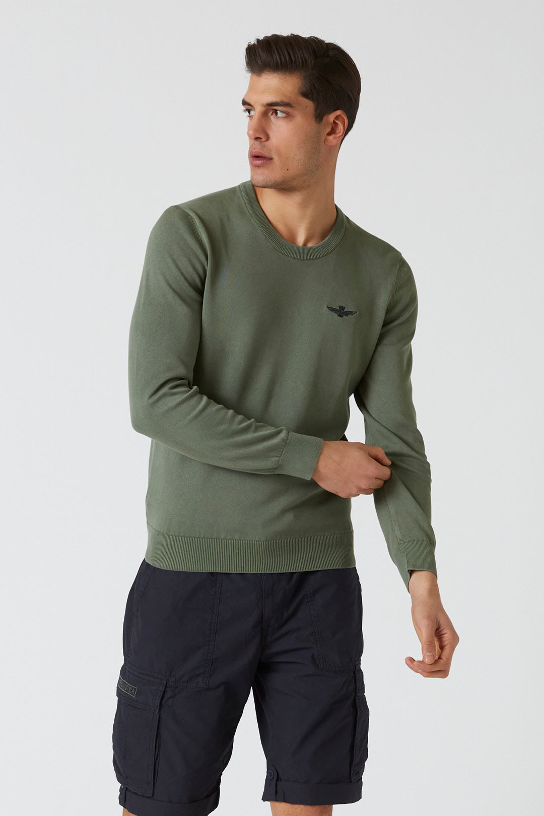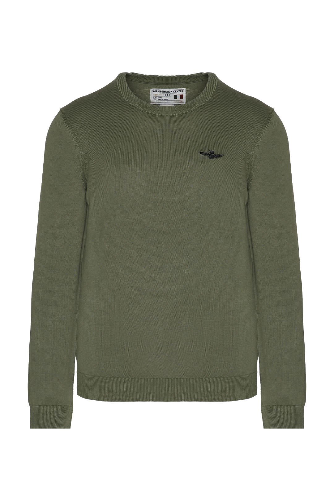 Tento svetr s výstřihem z čisté bavlny s hladkou a jemnou texturou je zakončen výšivkou charakteristické věžovitého orla, symbolu par excellence vojenských pilotů.