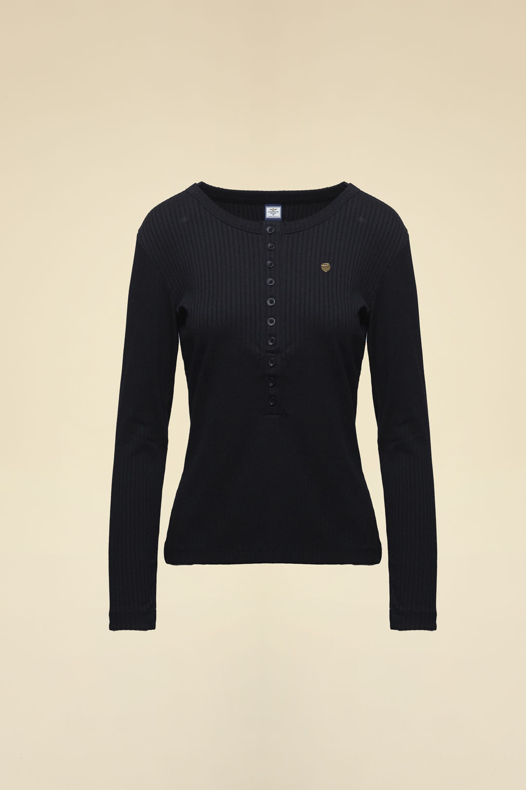 Toto tričko s dlouhým rukávem představuje dokonalou kombinaci pohodlí a stylu. Zaoblený výstřih serafino je ozdobený řadou knoflíků, které mu dodávají sofistikovaný a rafinovaný vzhled. Kovová nášivka s logem na hrudi přidává tričku charakter a výrazně podtrhuje jeho moderní design. Vyrobeno z měkké žebrované viskózové směsi, toto tričko je příjemné na pokožce a ideální pro každodenní nošení.