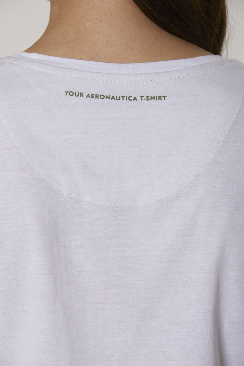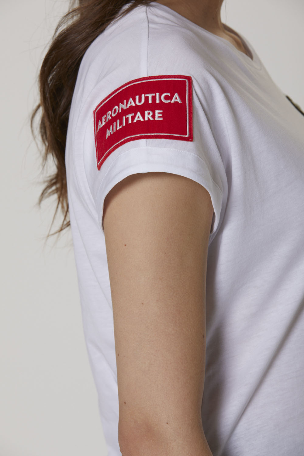 Oděv, který plně reprezentuje silnou ženu Aeronautica Militare. Tričko ze strečového bavlněného žerzeje charakterizované speciálními kimonovými rukávy a sadou nášivek věnovaných světu letectví. Perfektní pro vytvoření odvážného vzhledu, který nezůstane bez povšimnutí.