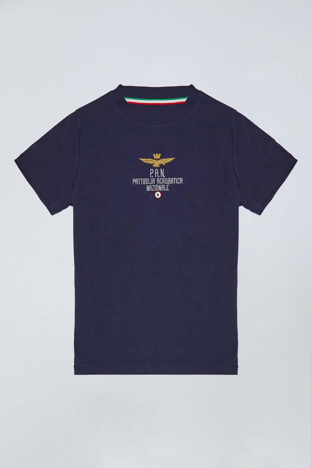 Výrazný potisk věnovaný národnímu akrobatickému týmu Frecce Tricolori zdobí zadní stranu tohoto dětského trička s výstřihem.