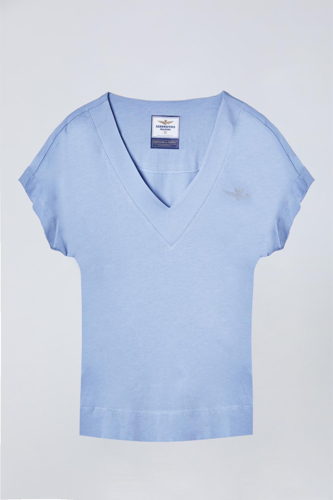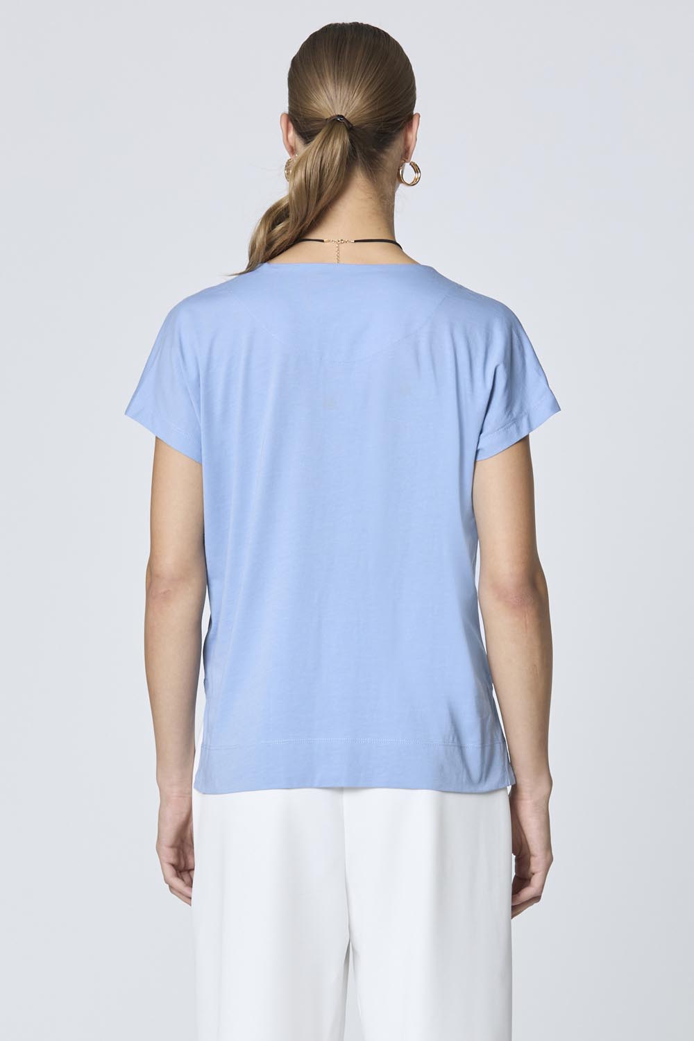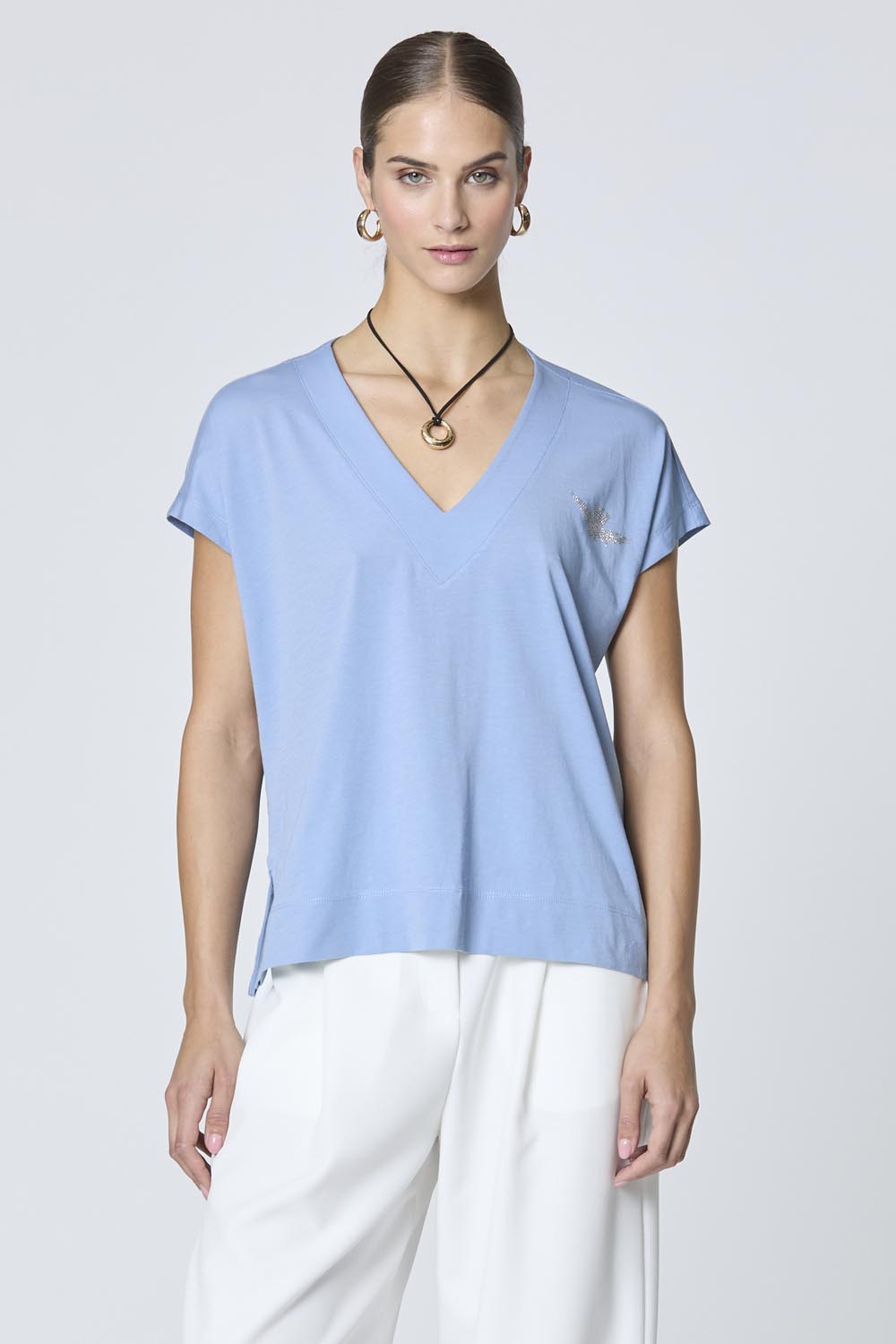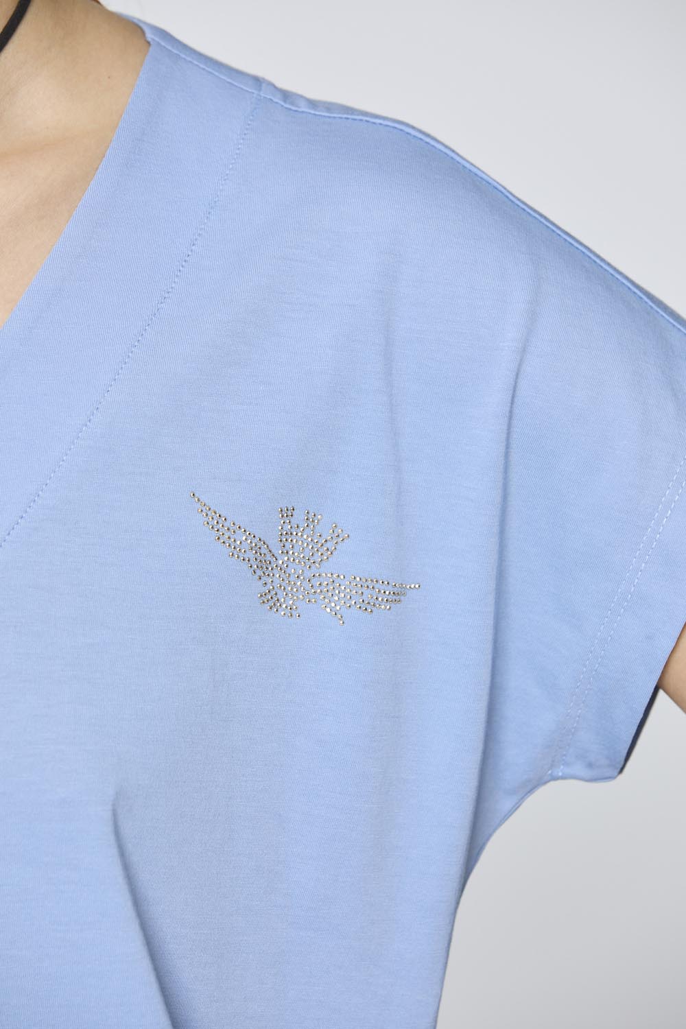 Toto tričko s výstřihem do V, vyrobené z měkkého bavlněného žerzeje, nabízí pohodlí i styl. Se spadlými rameny a bočními rozparky nabízí uvolněný, moderní střih, zatímco úžasný zlatý emblém orla s mikrocvočky je odvážným prohlášením. Dokonalá rovnováha ležérní elegance, tento kousek vyzařuje nenucený chlad.