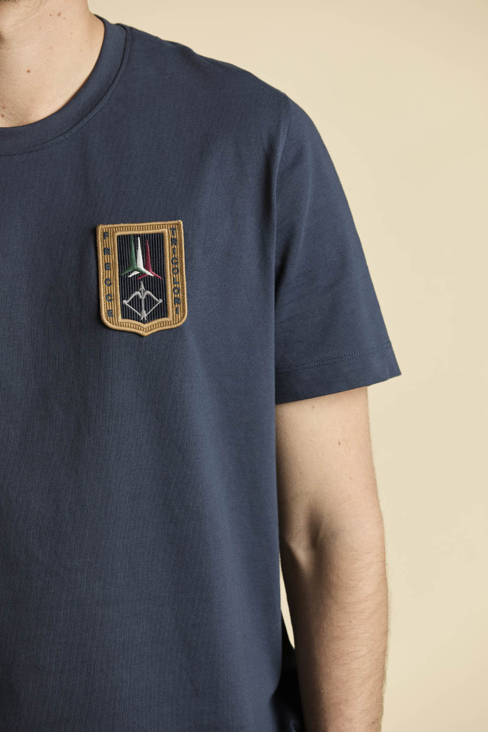Ikonický model inspirovaný autentickými uniformami pilotů Frecce Tricolori. Toto pánské tričko z čistého bavlněného jersey oslavuje excelenci italské akrobatické letky prostřednictvím detailů umístěných přesně v duchu originálních leteckých oděvů.