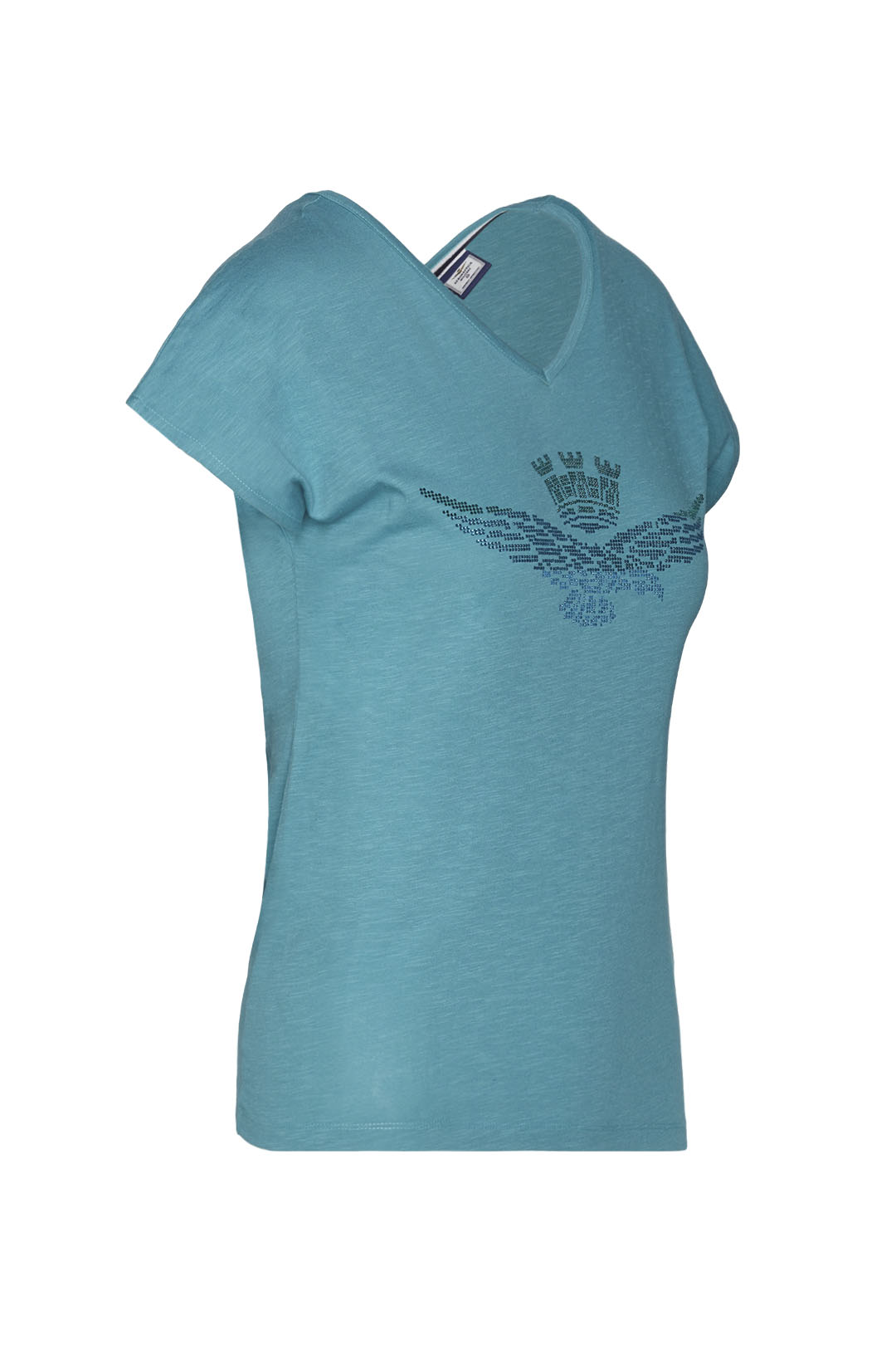 Tričko z bavlněného žerzeje s výstřihem do V vpředu i vzadu. Oděv s čistým designem, zdobený kamínky s degradovaným efektem, který dodává oděvu okouzlující nádech.